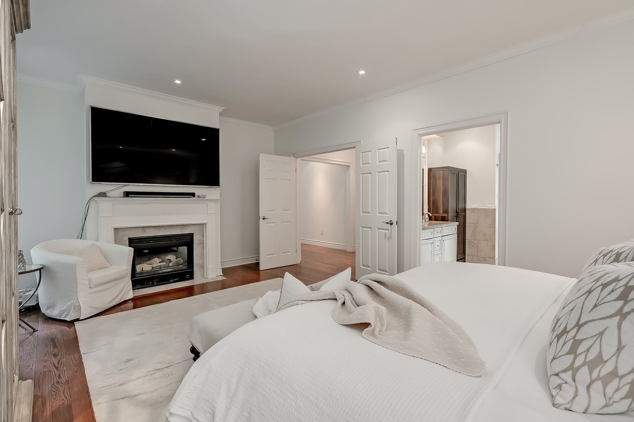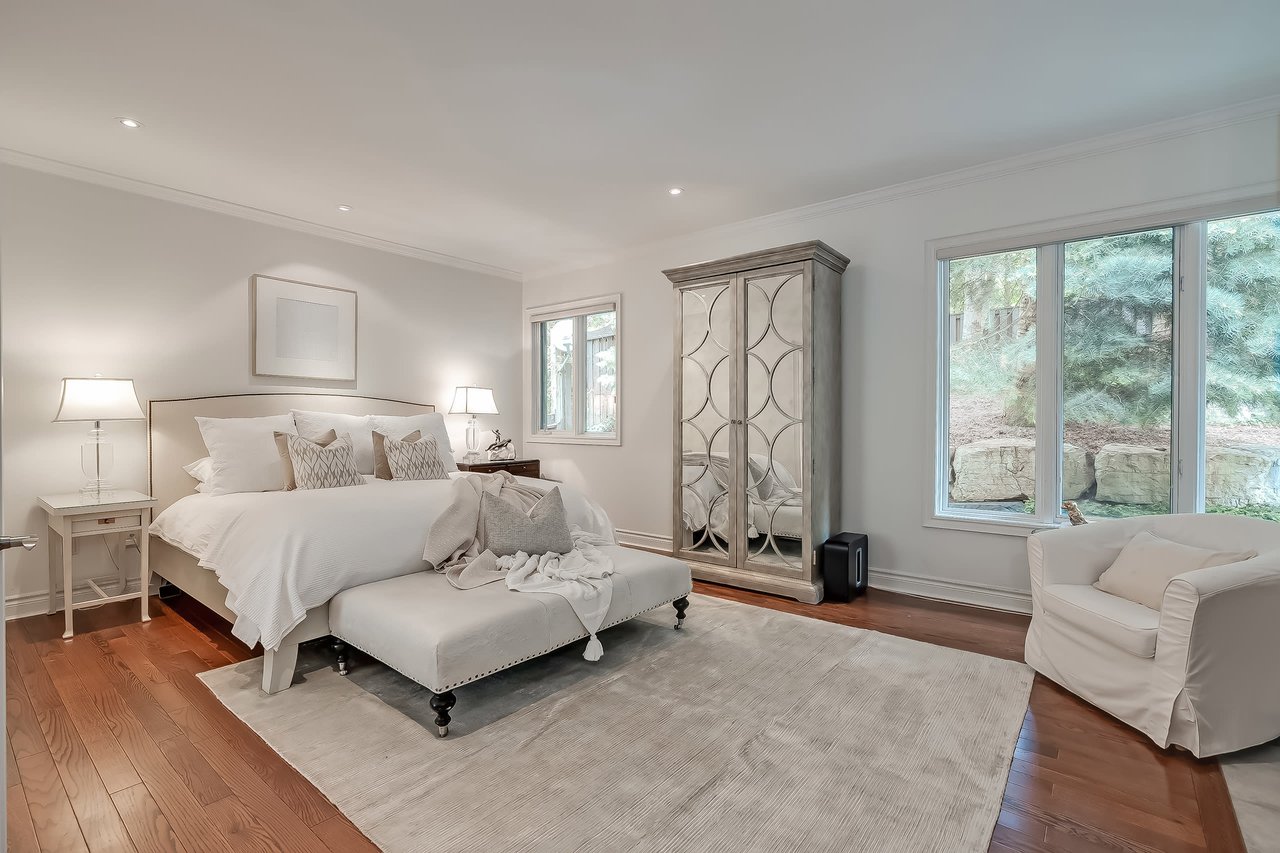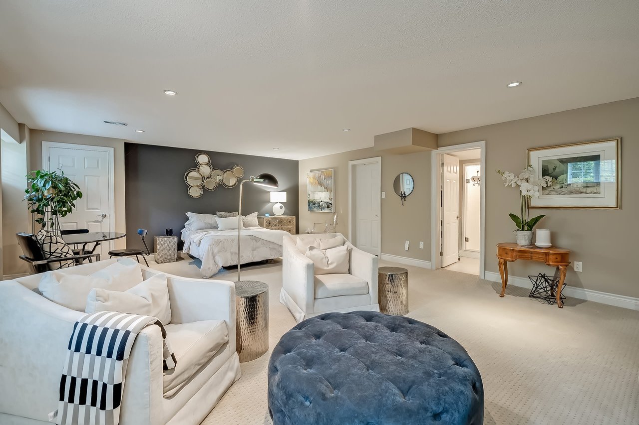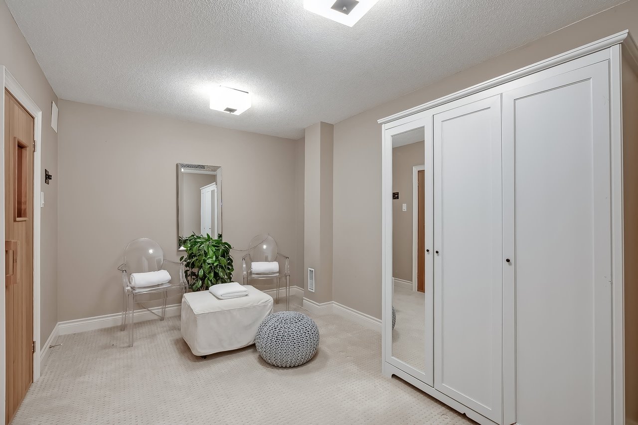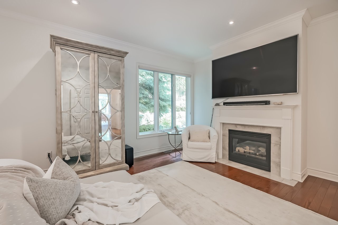 The sleeping area set back allowing for privacy. Set behind double doors the primary is a retreat with sleeping area and lounge with cozy gas fireplace. The ensuite is expansive with deep soaker tub and glass shower and three double closets keeping you organized. A second bedroom with ensuite is bright with front garden views. The finely executed living space is extended to the lower level where you’ll find an additional 2 bedrooms + 1.5 baths; one being an in-law suite with ensuite and walk-in. A lovely den with milled book-cases is perfect for the book-worm in the family and the adjacent rec room with gas fireplace + wet bar is ideal for game nights. Gym space and sauna area are also features of this level.