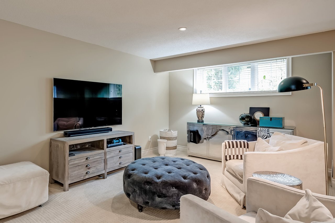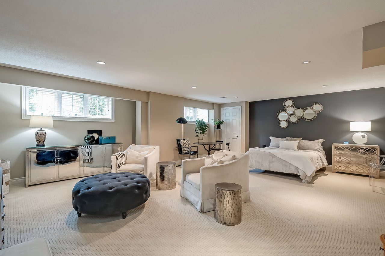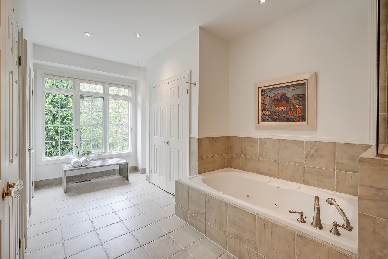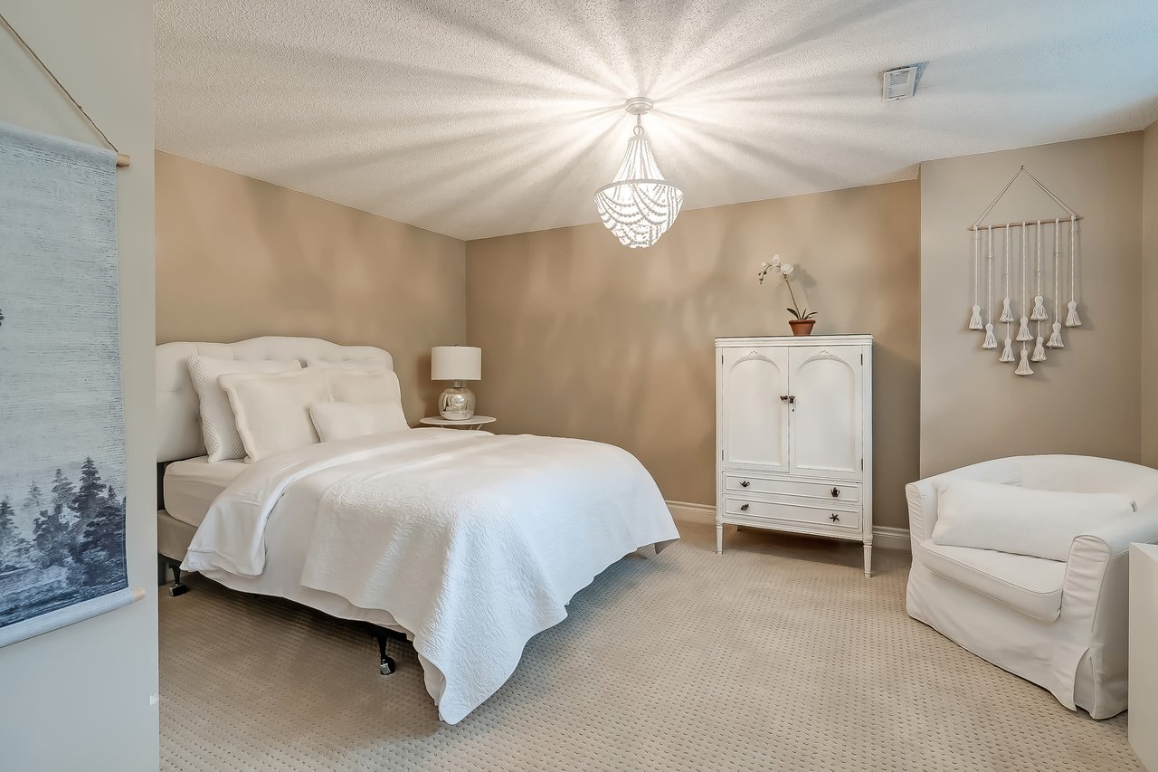 The sleeping area set back allowing for privacy. Set behind double doors the primary is a retreat with sleeping area and lounge with cozy gas fireplace. The ensuite is expansive with deep soaker tub and glass shower and three double closets keeping you organized. A second bedroom with ensuite is bright with front garden views. The finely executed living space is extended to the lower level where you’ll find an additional 2 bedrooms + 1.5 baths; one being an in-law suite with ensuite and walk-in. A lovely den with milled book-cases is perfect for the book-worm in the family and the adjacent rec room with gas fireplace + wet bar is ideal for game nights. Gym space and sauna area are also features of this level.