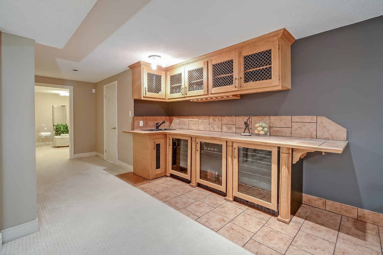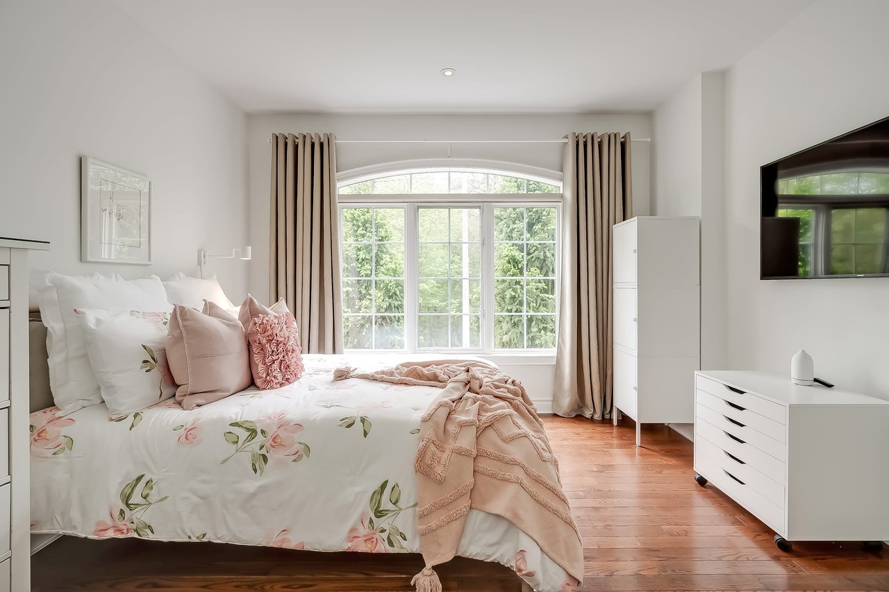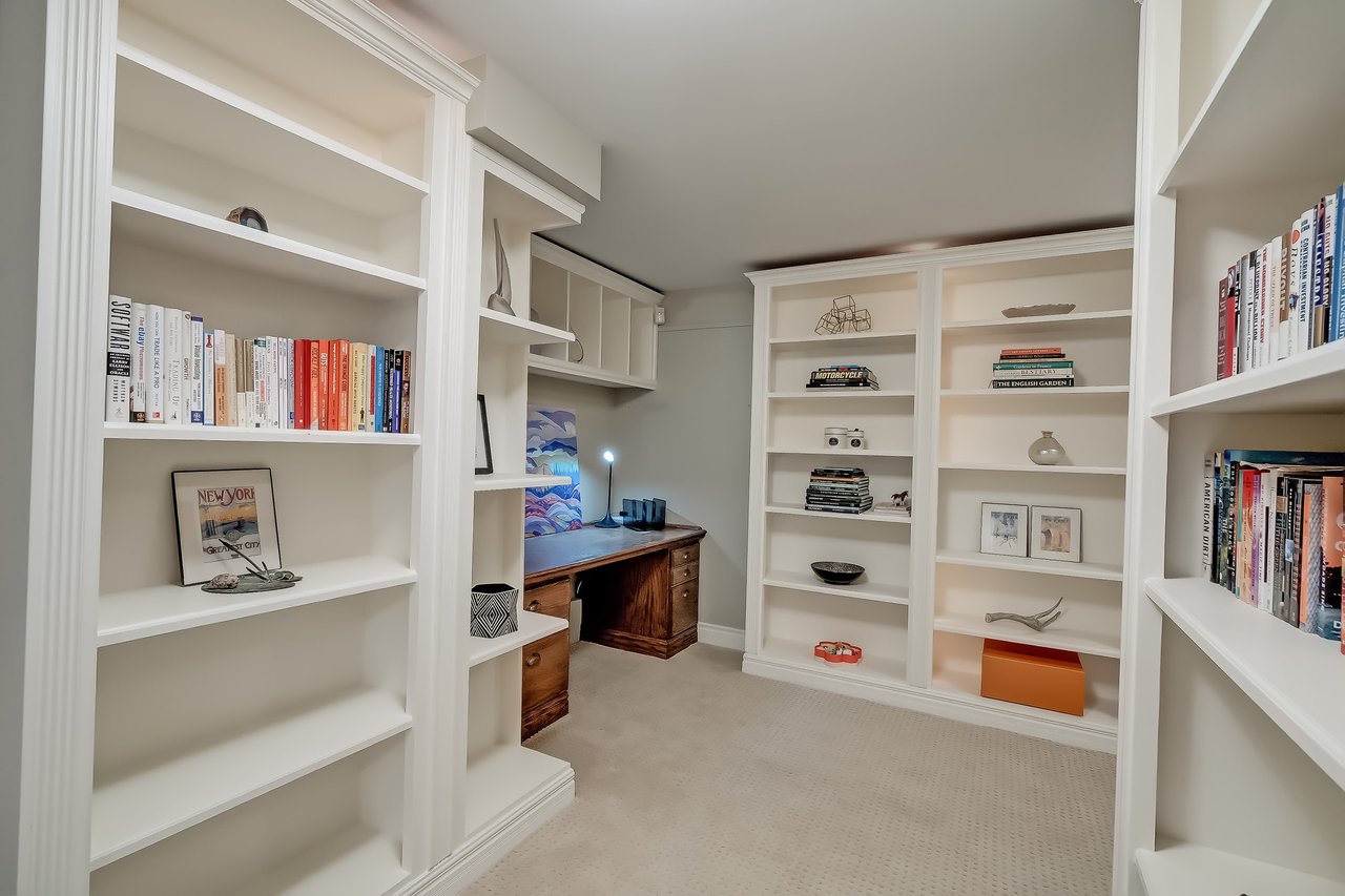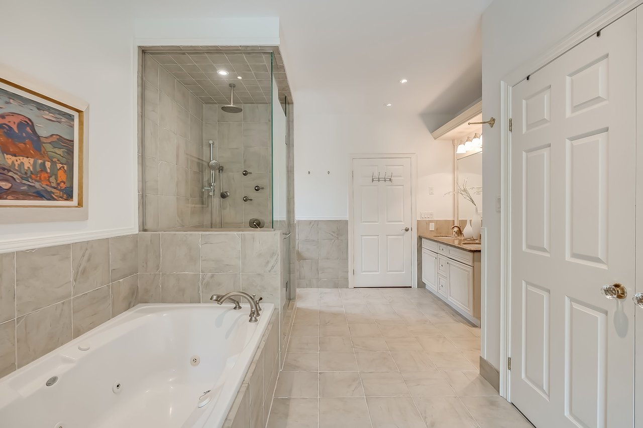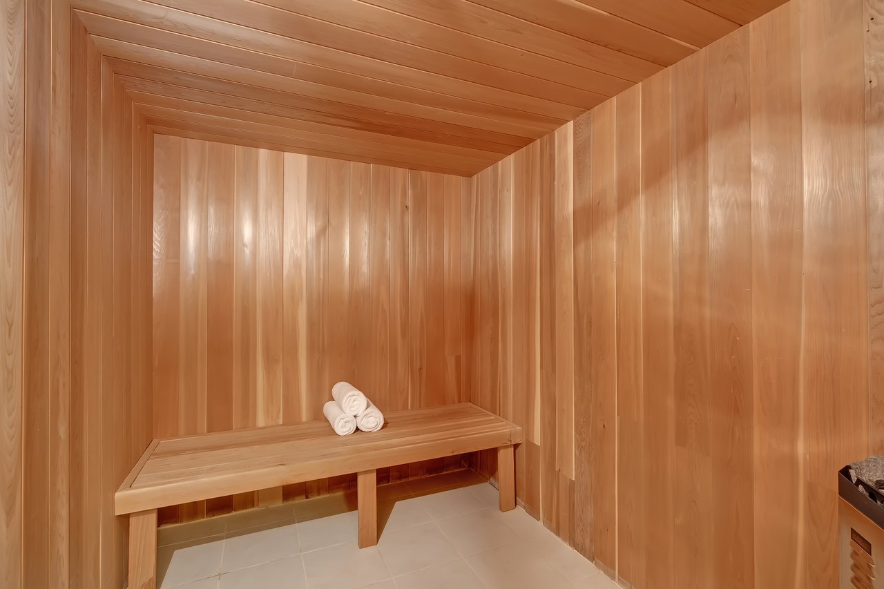 The sleeping area set back allowing for privacy. Set behind double doors the primary is a retreat with sleeping area and lounge with cozy gas fireplace. The ensuite is expansive with deep soaker tub and glass shower and three double closets keeping you organized. A second bedroom with ensuite is bright with front garden views. The finely executed living space is extended to the lower level where you’ll find an additional 2 bedrooms + 1.5 baths; one being an in-law suite with ensuite and walk-in. A lovely den with milled book-cases is perfect for the book-worm in the family and the adjacent rec room with gas fireplace + wet bar is ideal for game nights. Gym space and sauna area are also features of this level.