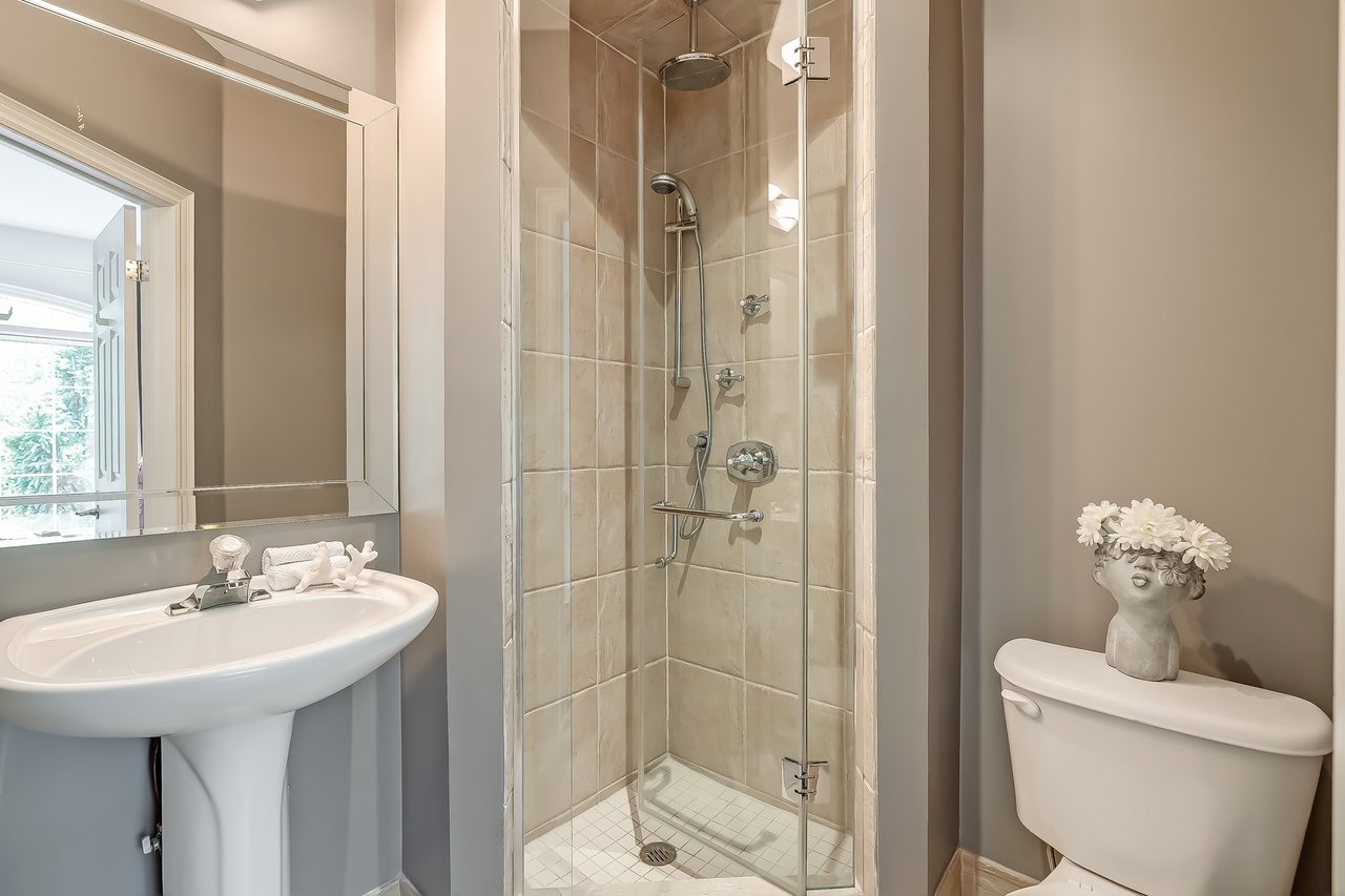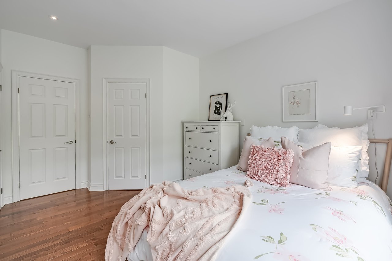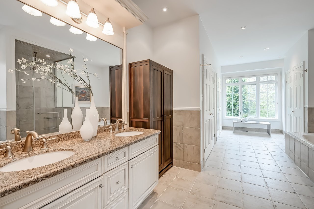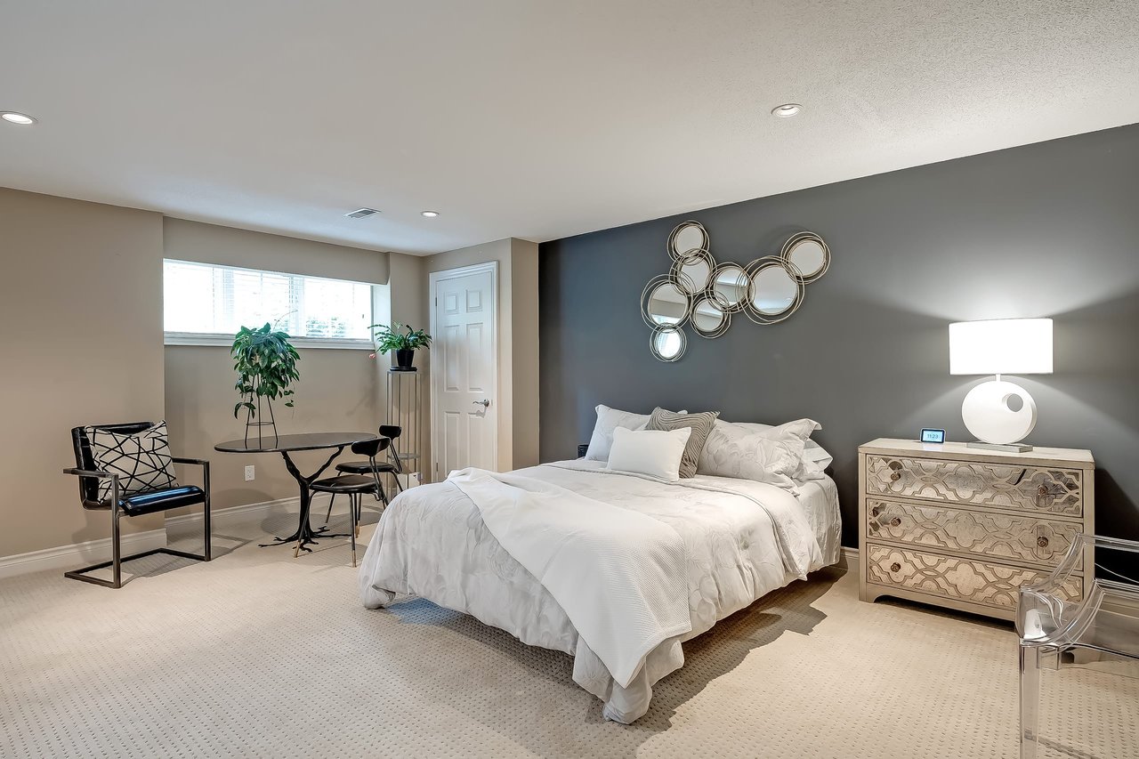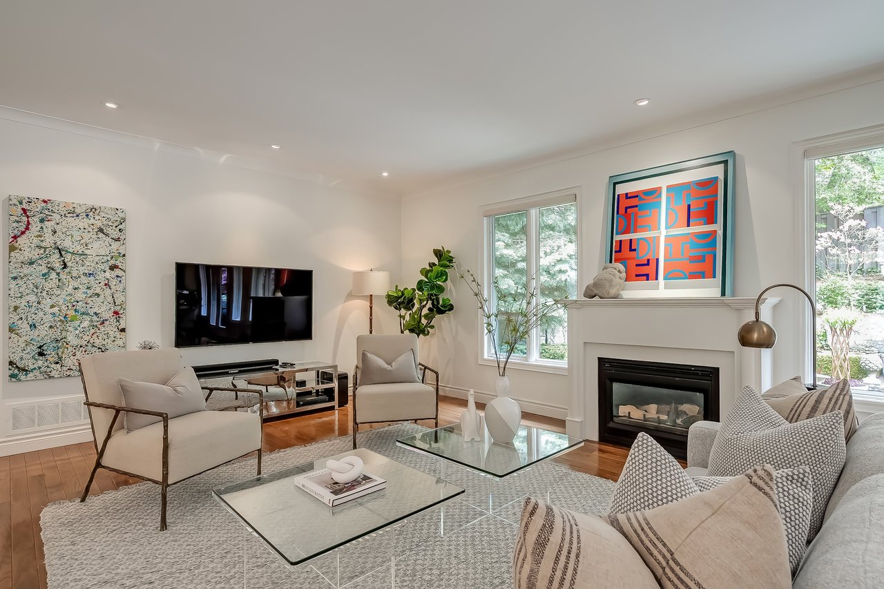 The sleeping area set back allowing for privacy. Set behind double doors the primary is a retreat with sleeping area and lounge with cozy gas fireplace. The ensuite is expansive with deep soaker tub and glass shower and three double closets keeping you organized. A second bedroom with ensuite is bright with front garden views. The finely executed living space is extended to the lower level where you’ll find an additional 2 bedrooms + 1.5 baths; one being an in-law suite with ensuite and walk-in. A lovely den with milled book-cases is perfect for the book-worm in the family and the adjacent rec room with gas fireplace + wet bar is ideal for game nights. Gym space and sauna area are also features of this level.