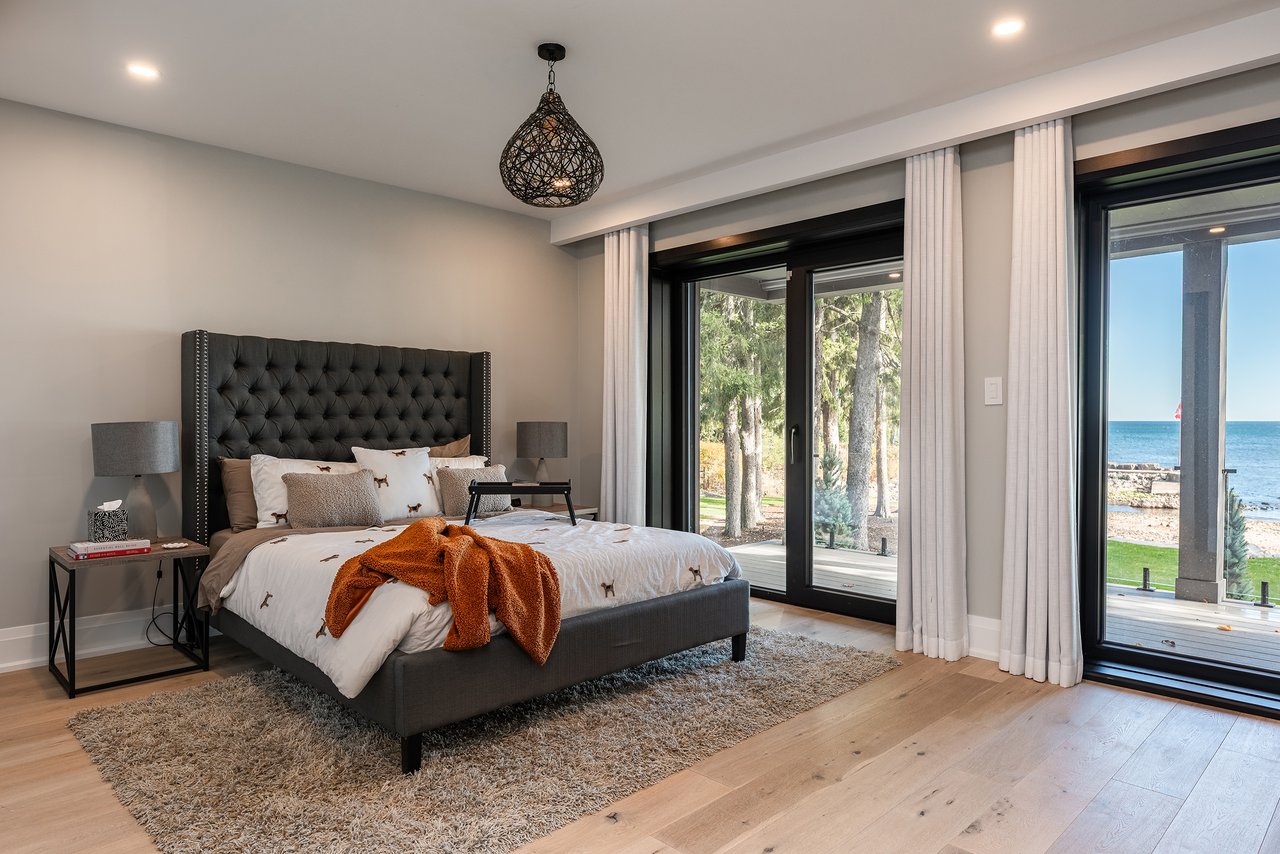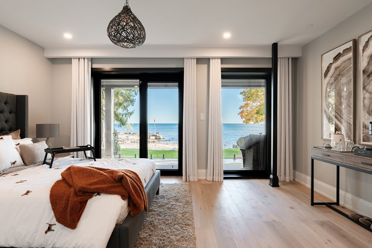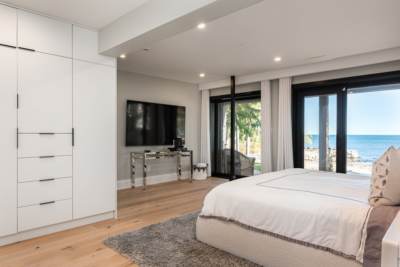 Downstairs, the walkout lower level accommodates four bedrooms, each with its own ensuite bathroom and ductless air conditioning unit. The primary suite is a true retreat, opening to the deck just steps from the shoreline. Its spa-inspired ensuite features dual rain showers, a bench seat, and heated floors, while a massive walk-in closet offers custom cabinetry and a dedicated make-up vanity. Radiant in-floor heating runs throughout the home for comfort in every season.