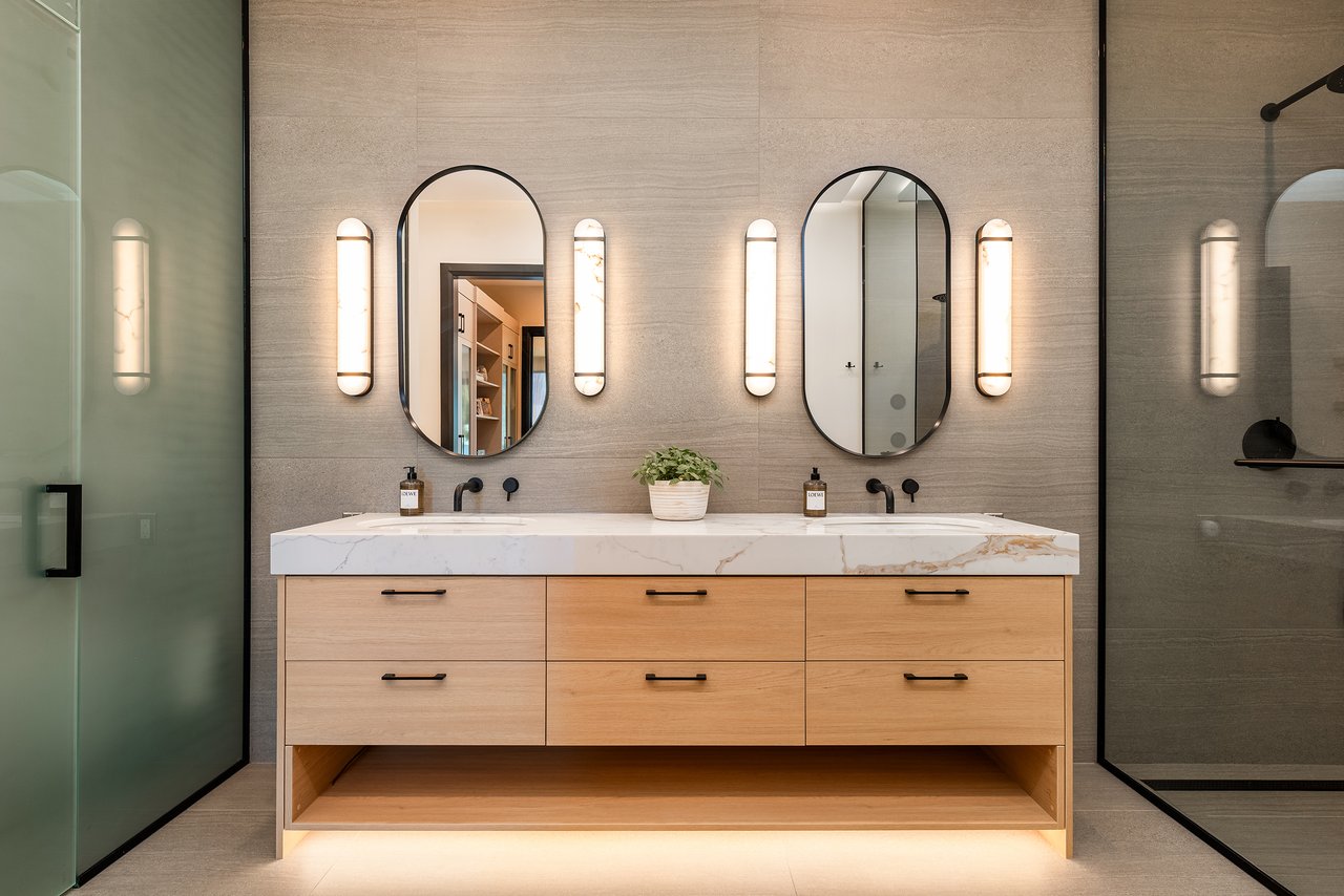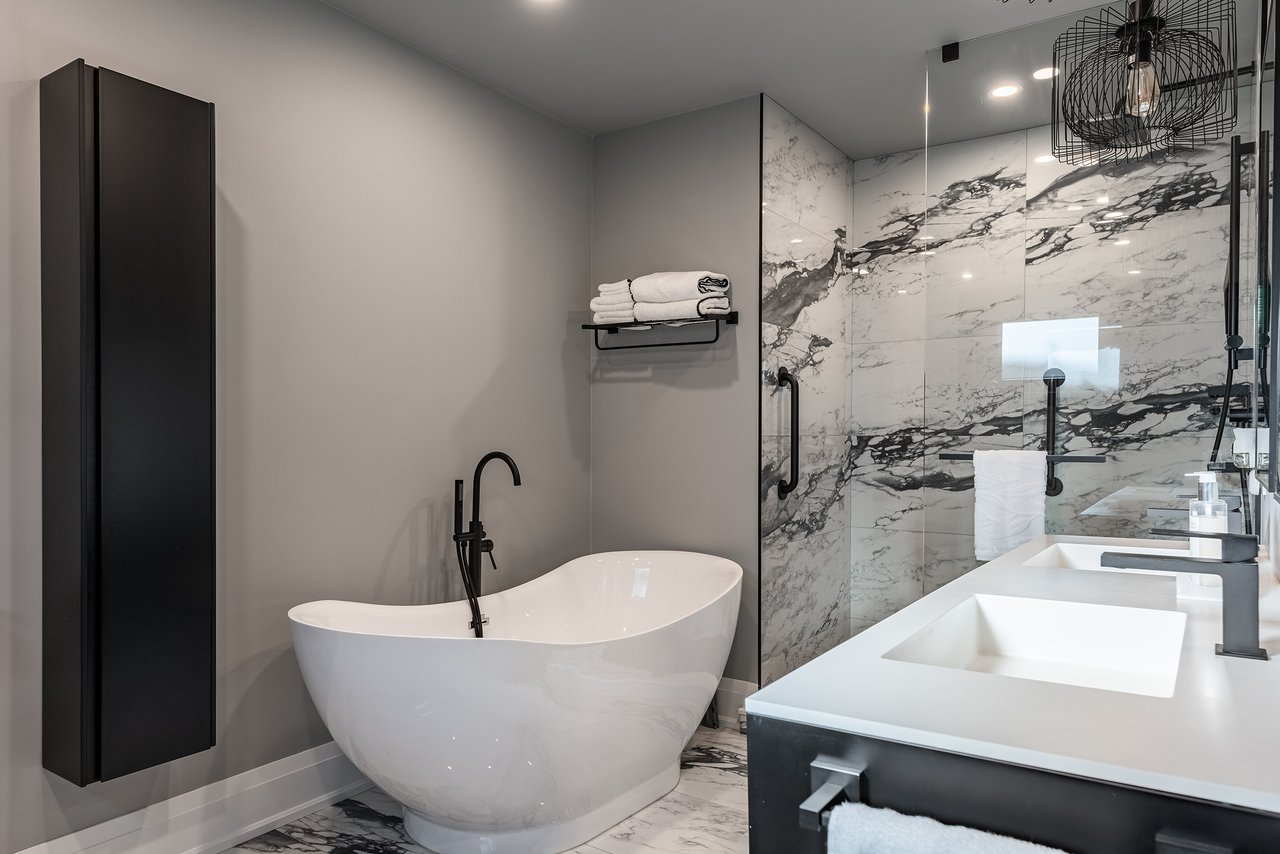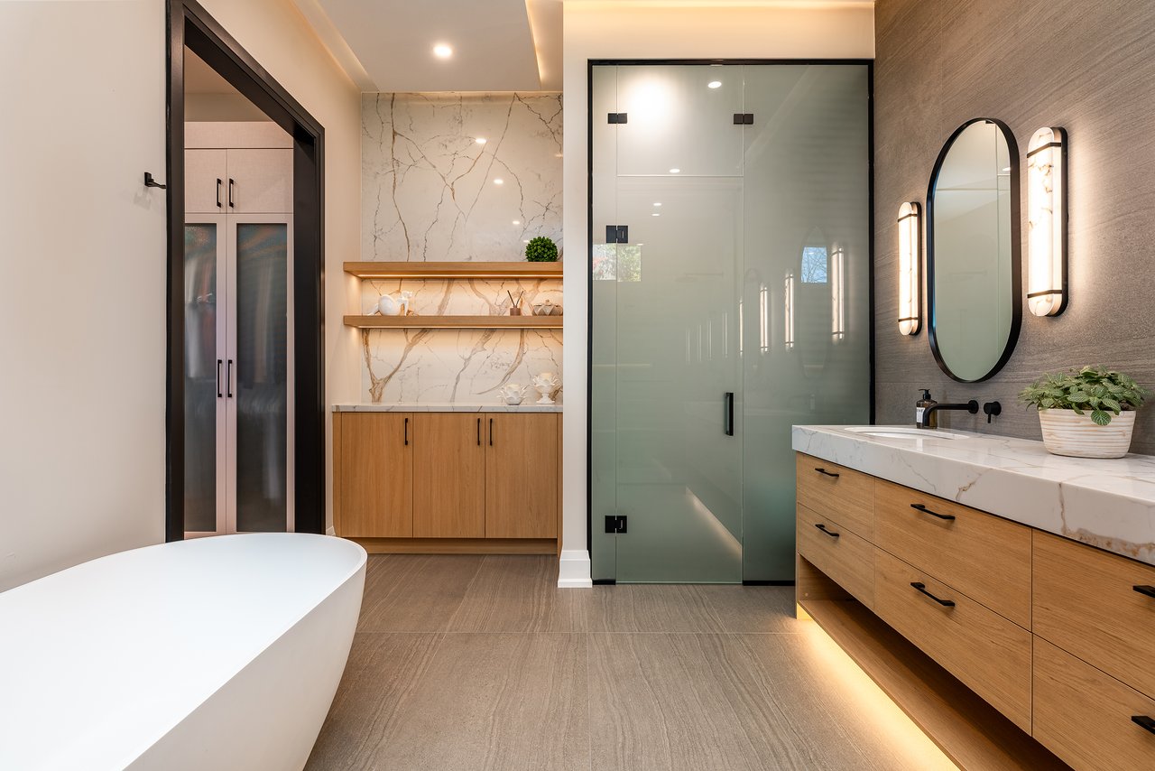 Downstairs, the walkout lower level accommodates four bedrooms, each with its own ensuite bathroom and ductless air conditioning unit. The primary suite is a true retreat, opening to the deck just steps from the shoreline. Its spa-inspired ensuite features dual rain showers, a bench seat, and heated floors, while a massive walk-in closet offers custom cabinetry and a dedicated make-up vanity. Radiant in-floor heating runs throughout the home for comfort in every season.