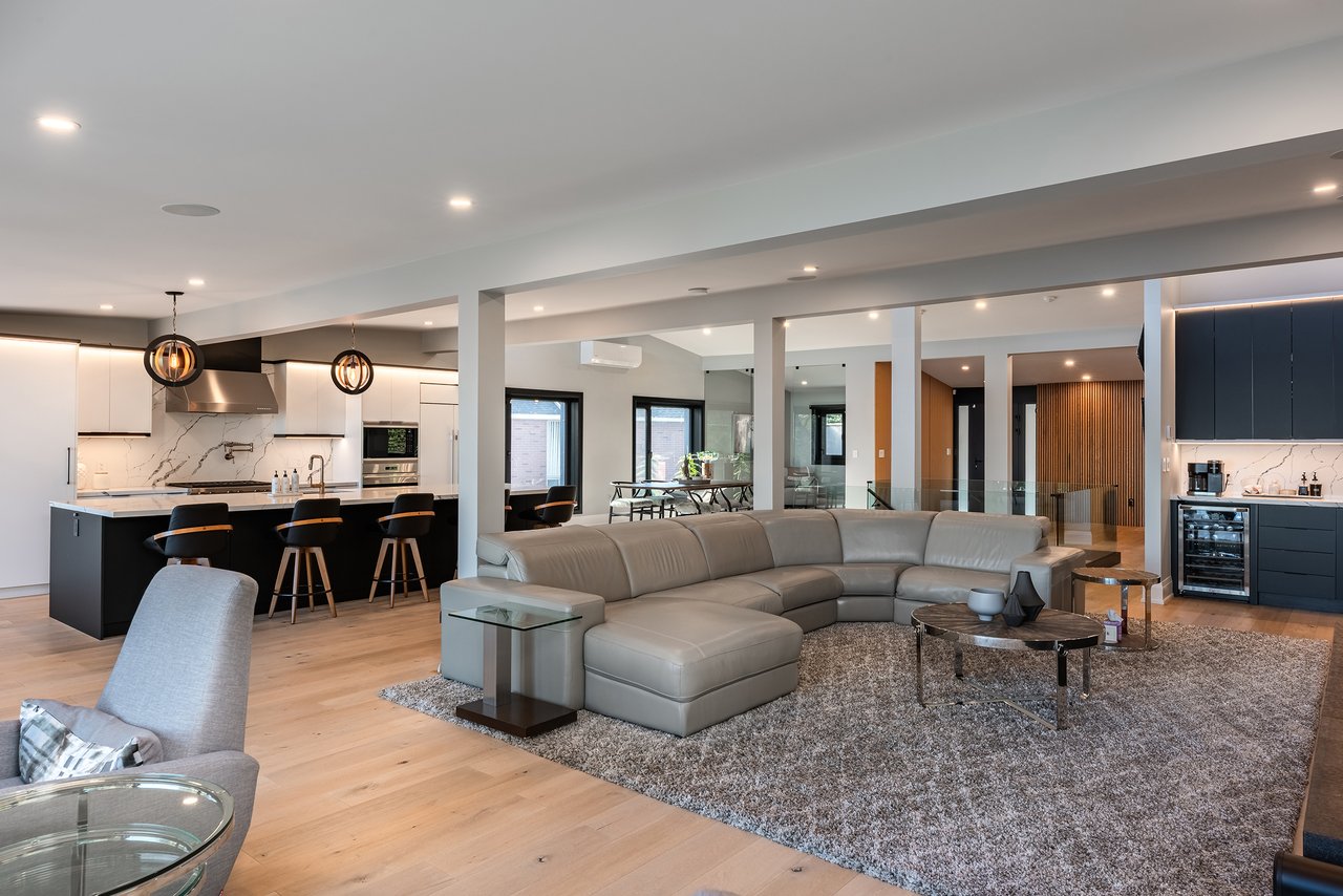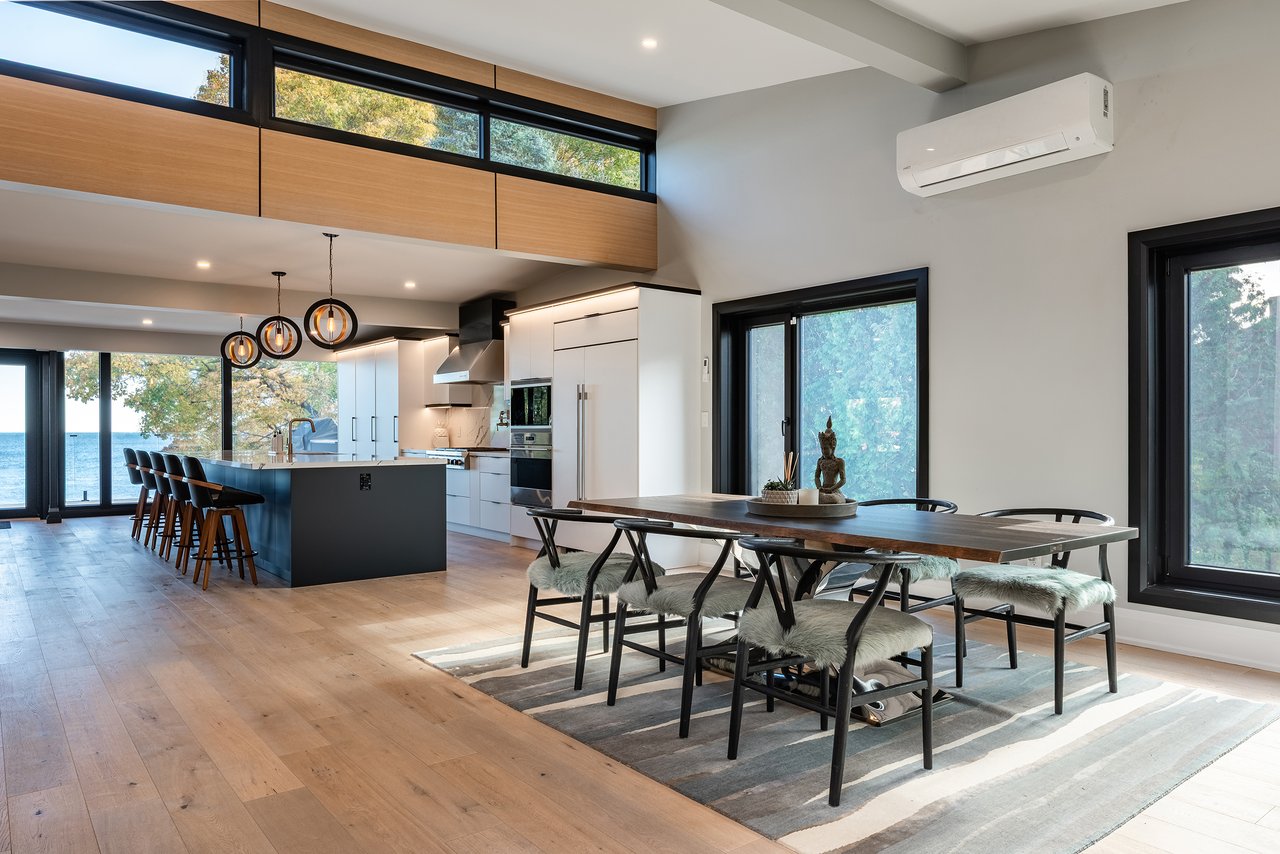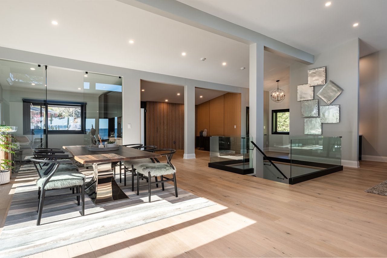Completely reimagined inside and out, this home offers over 5,200 sq. ft. of finished living space. Its clean-lined façade of natural wood and dark metal opens to a sun-filled interior where the architecture and landscape connect at every turn. A 12-foot vaulted ceiling defines the main living area, where walls of glass bring the lake into full view. Light engineered hardwood runs throughout, balancing the warmth of wood with a modern palette of black-framed windows and stone accents.