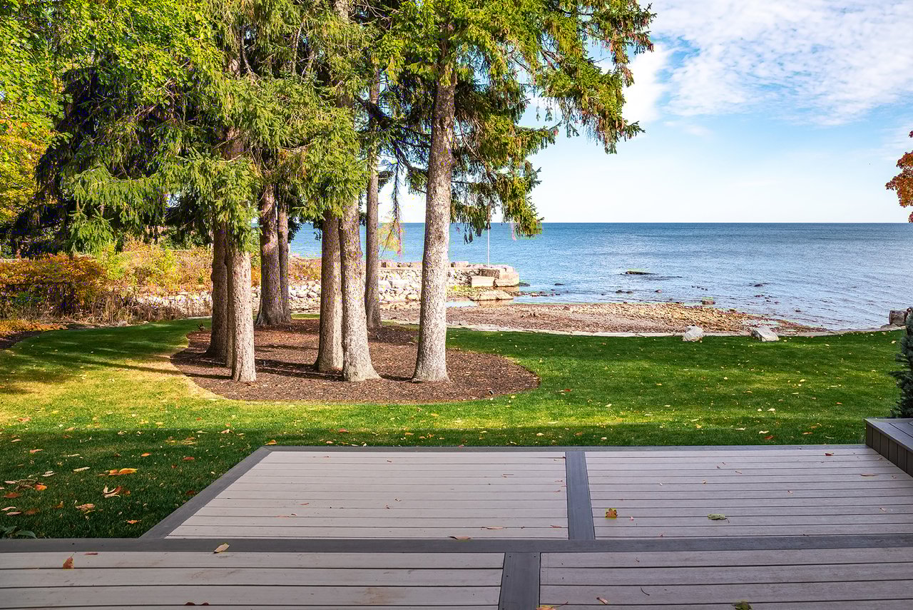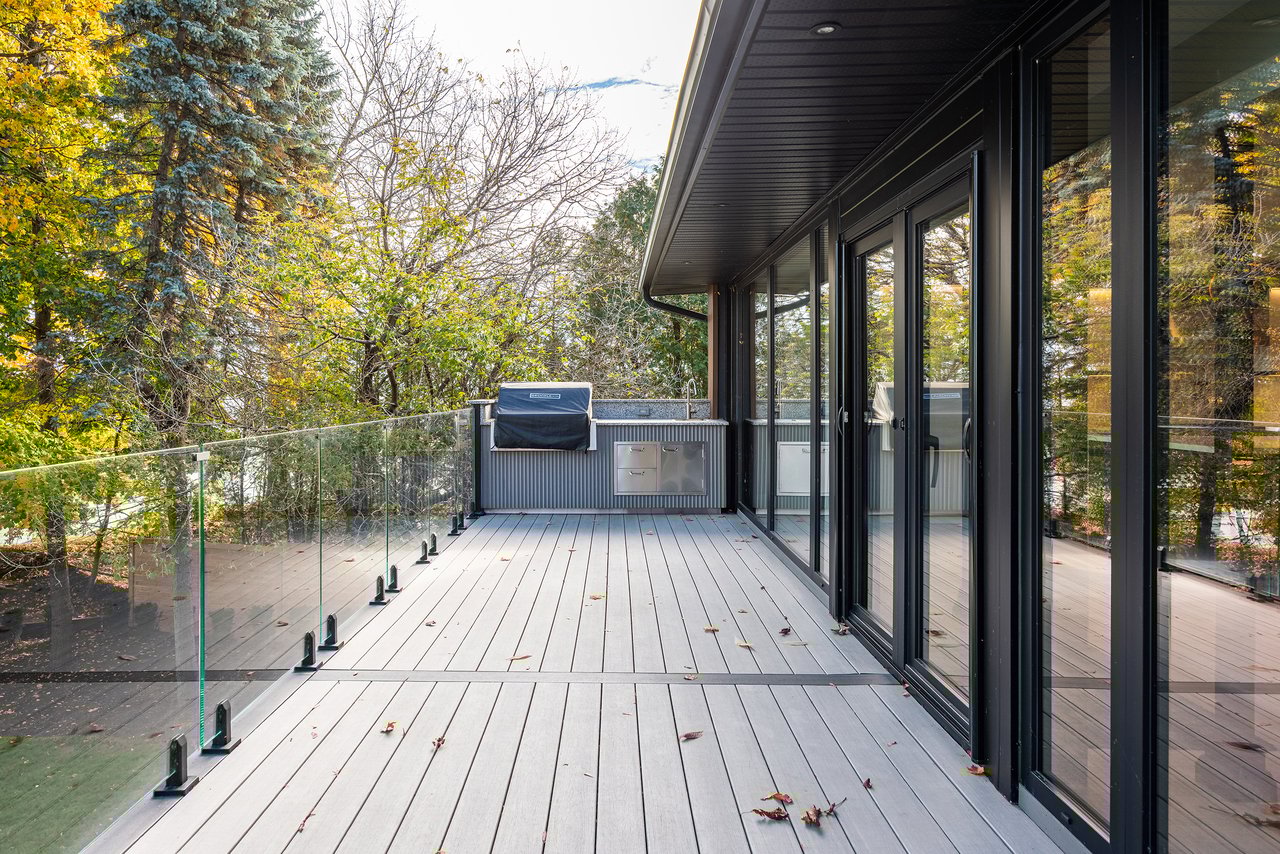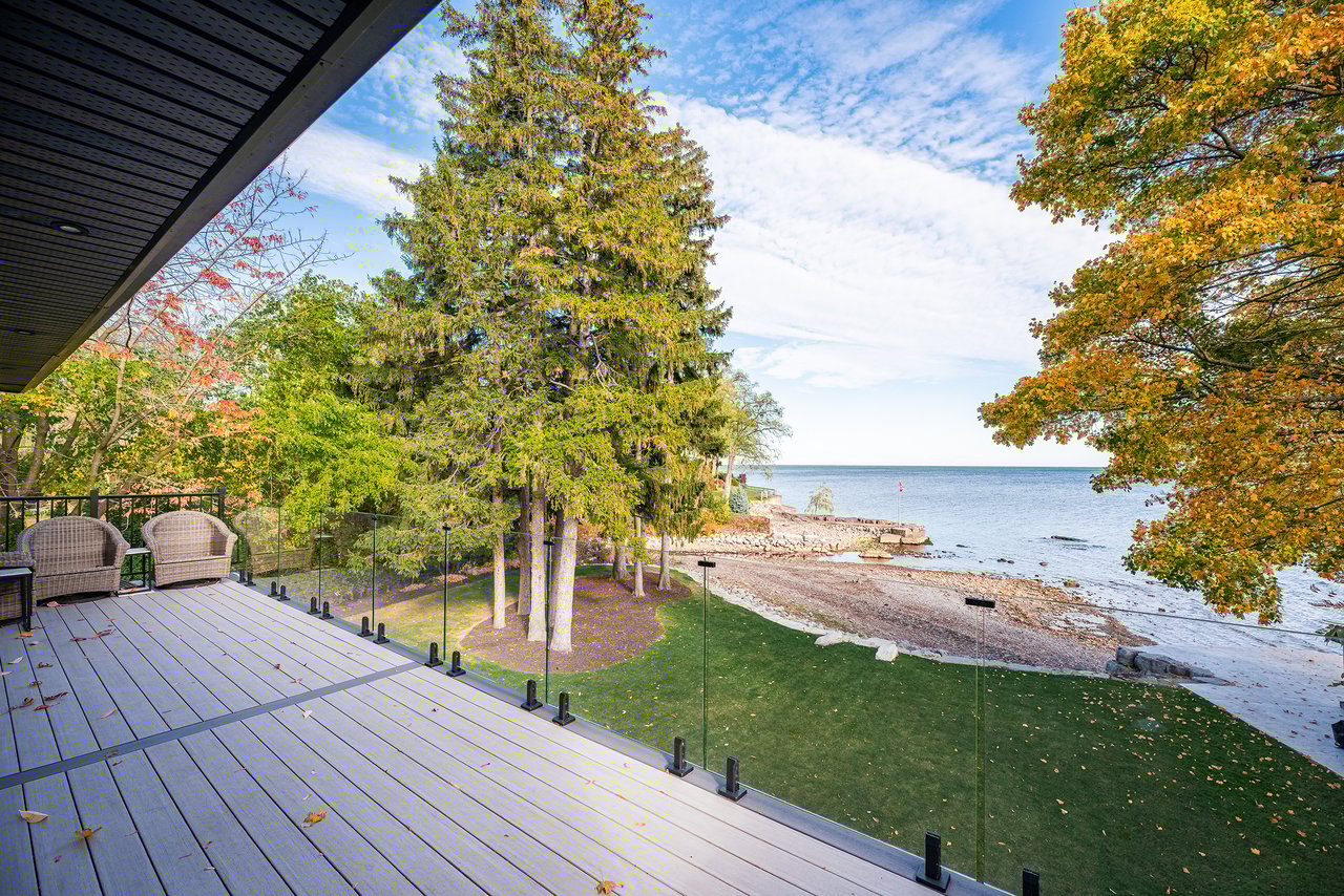 Outdoors, multiple decks extend the home’s footprint into the landscape. An upper terrace with built-in BBQ overlooks the trees and water, while a covered lower deck offers shade and shelter for relaxing by the lake. The property’s mature trees and sweeping lawns frame ever-changing views of the sky and shoreline. Every angle feels private, peaceful, and effortlessly connected to nature.