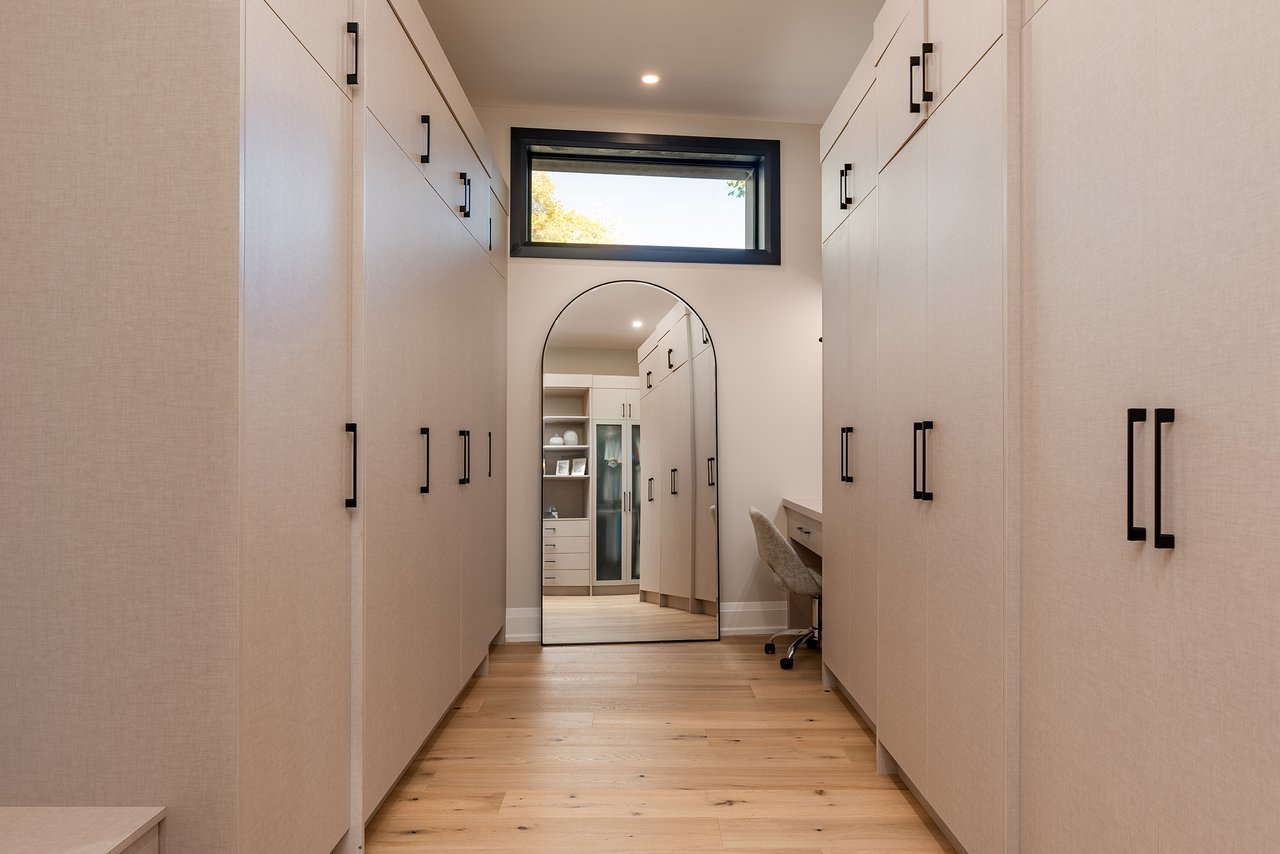 The main level’s open plan flows seamlessly from foyer to great room to kitchen and dining. The kitchen is anchored by a large island and top-of-the-line appliances, the ideal setting for casual gatherings or dinner with a view. A generous mudroom with custom cabinetry and heated floors adds everyday functionality without sacrificing design.