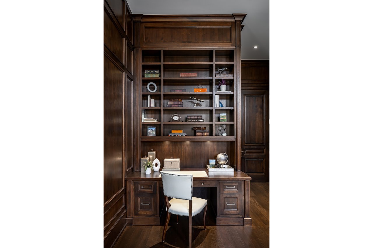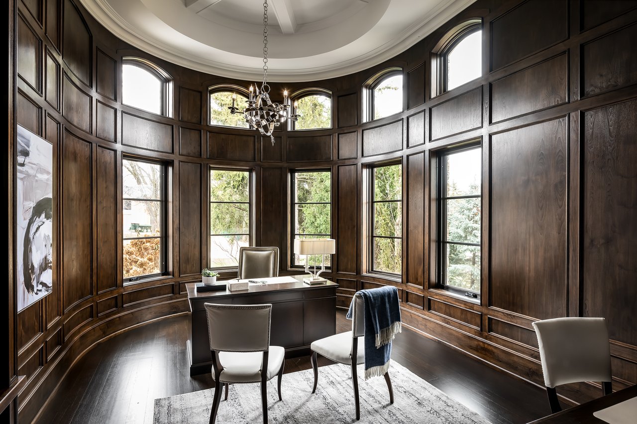 Tucked away down the hall, the library awaits you. Upon entry, you will be greeted by dark walnut bookshelves with a soaring coffered ceiling and panelled walls. The calming space will be the perfect place to unwind and recharge after a long day.