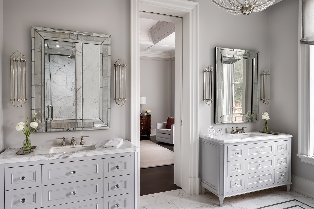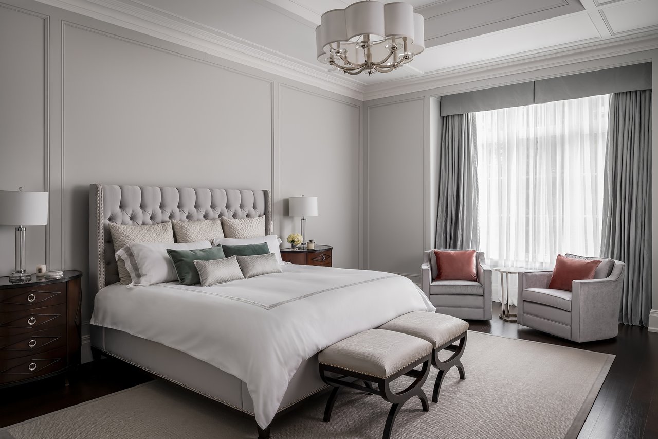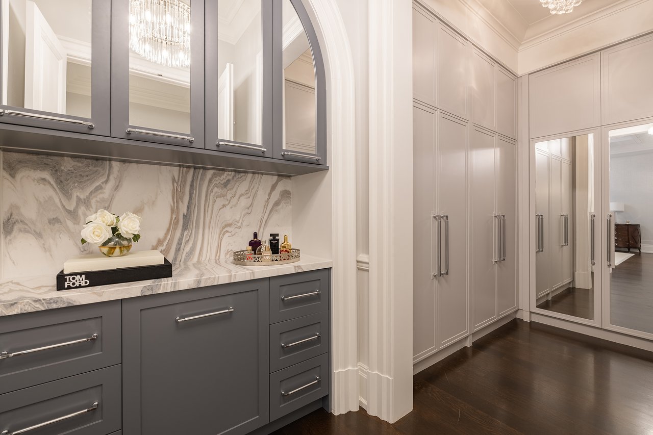 The primary bedroom is located on the main floor for convenience and stuns with sophistication. The room is fully outfitted with three dressing rooms, an elegant ensuite with a large soaking tub featuring a laser cut marble wall, a walk-in shower, dual vanities, and a separate water closet.