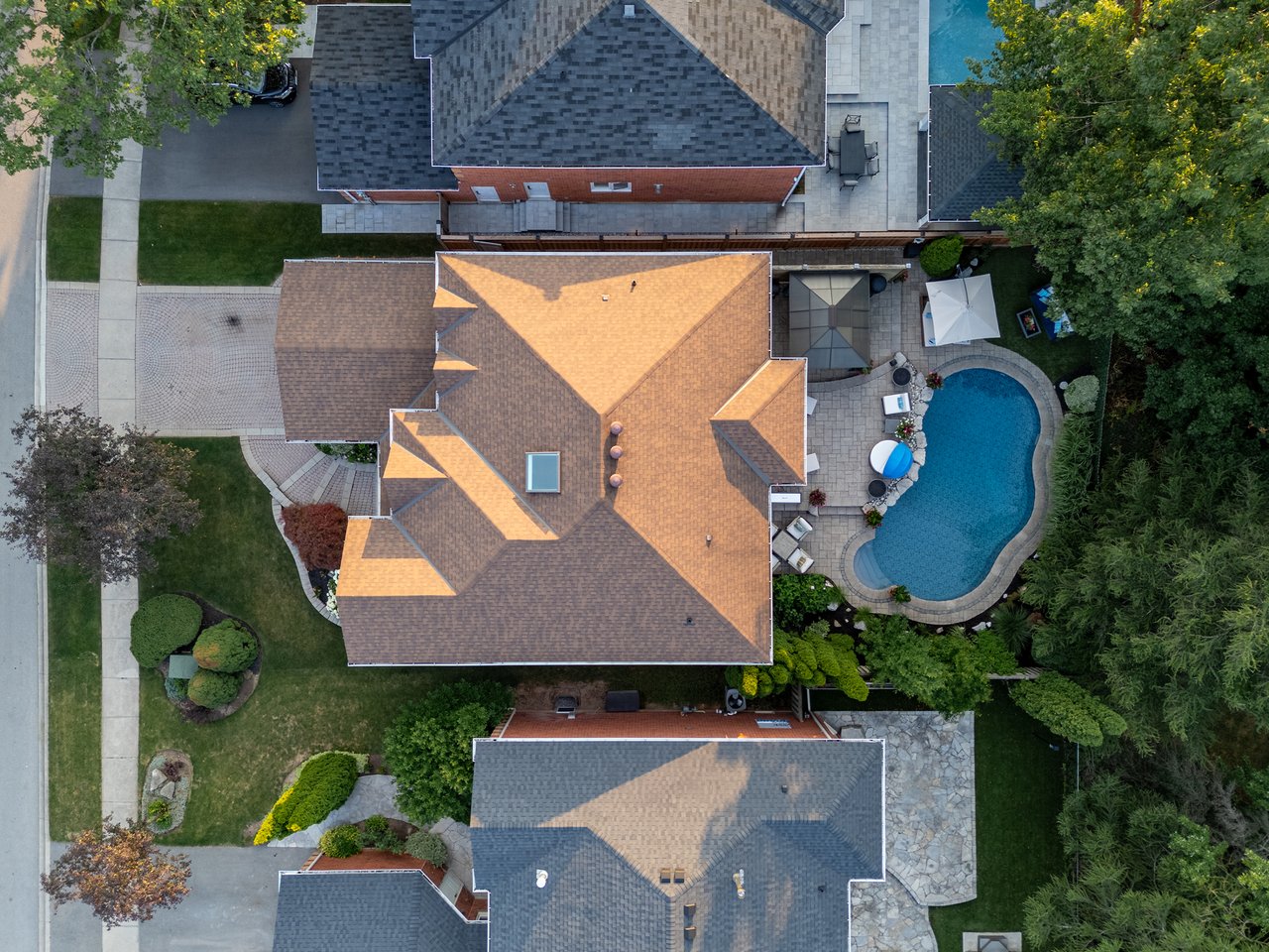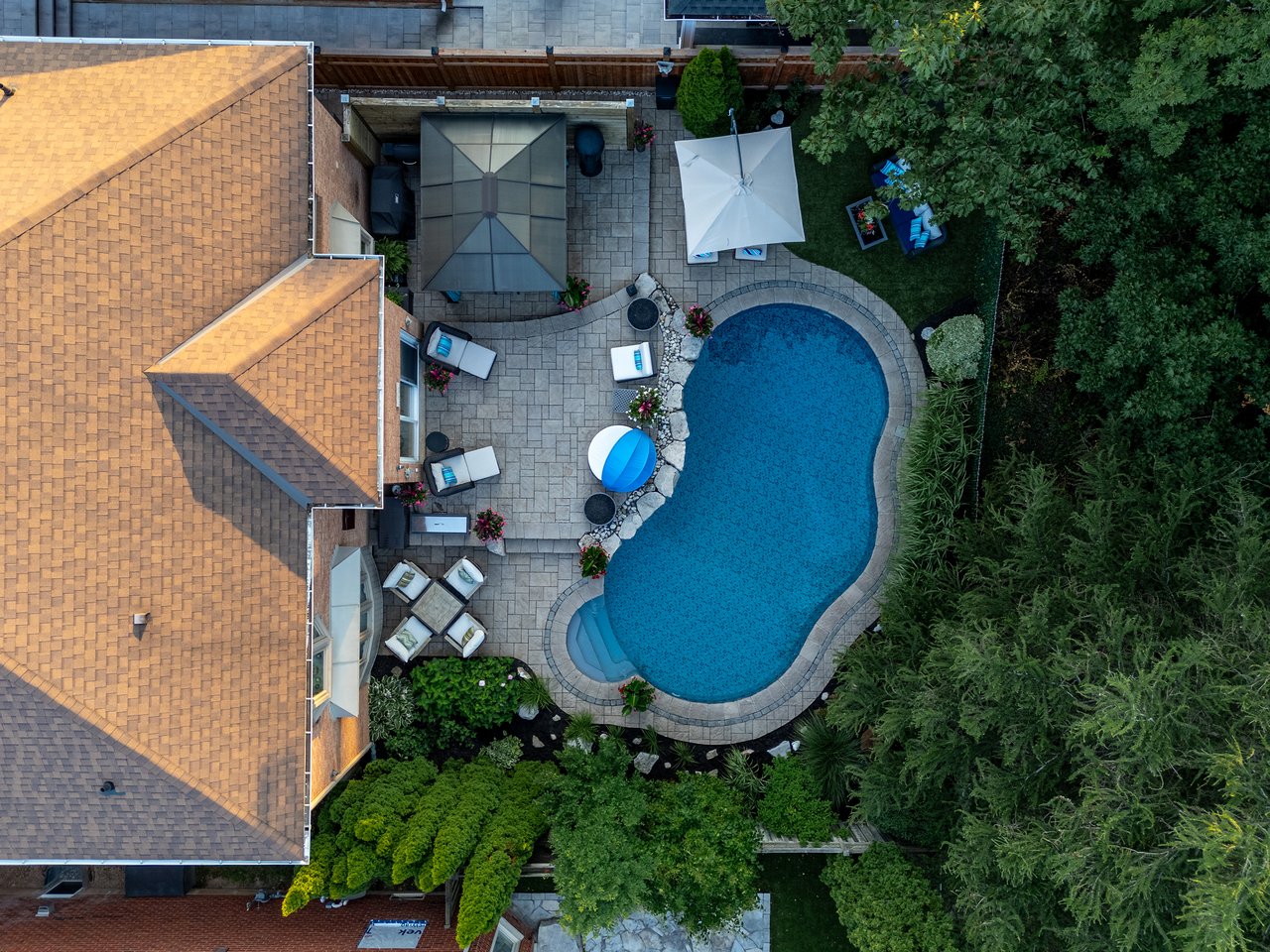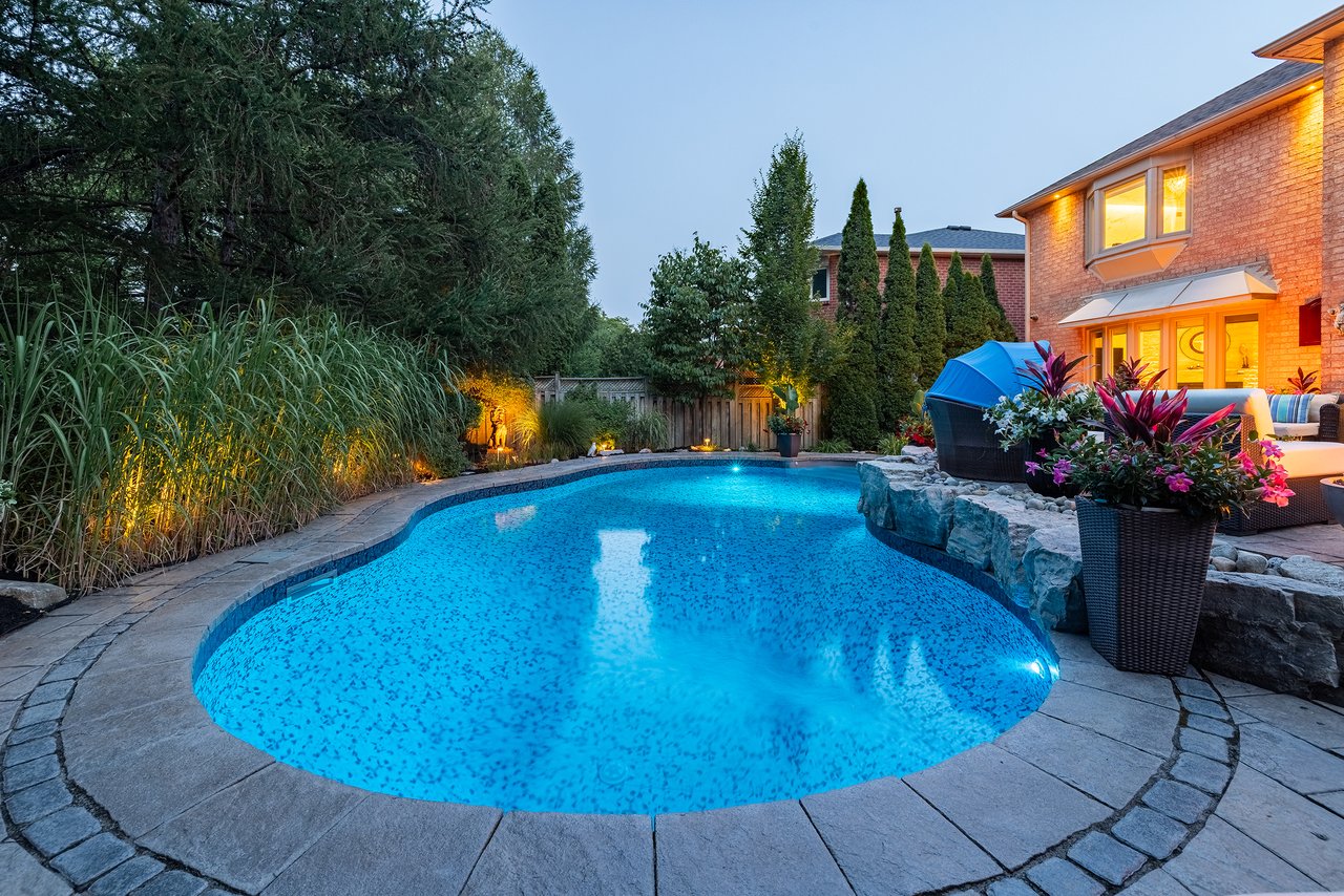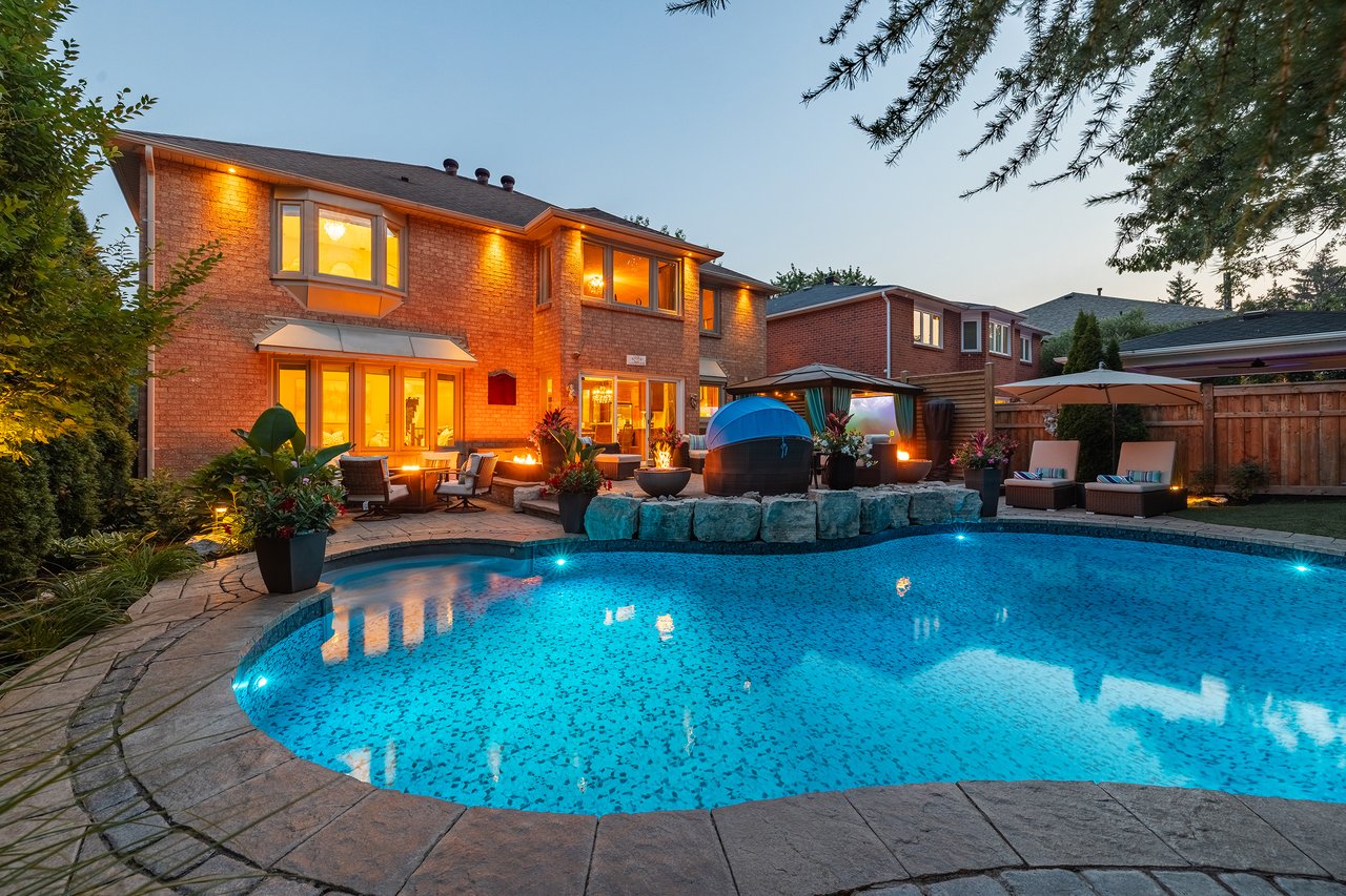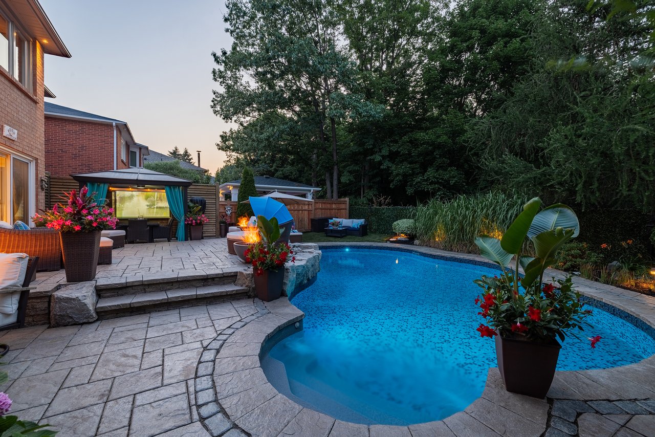5,446 total square feet of impeccably maintained living space. Gorgeous backyard with pool and patios backing onto green space.