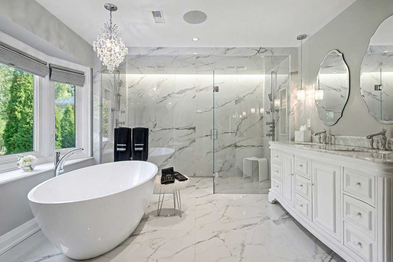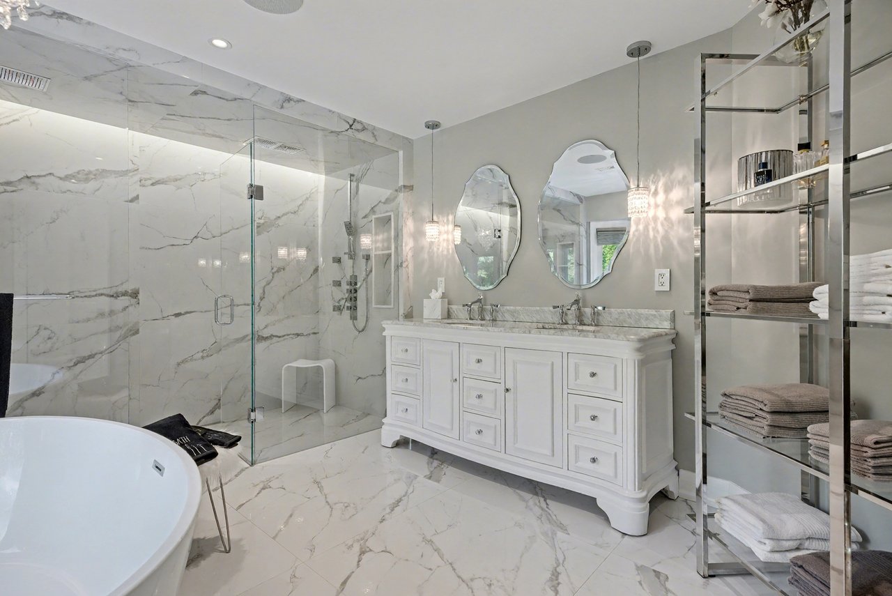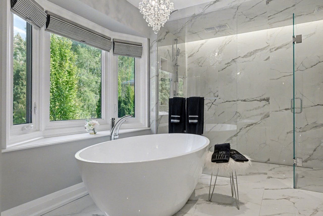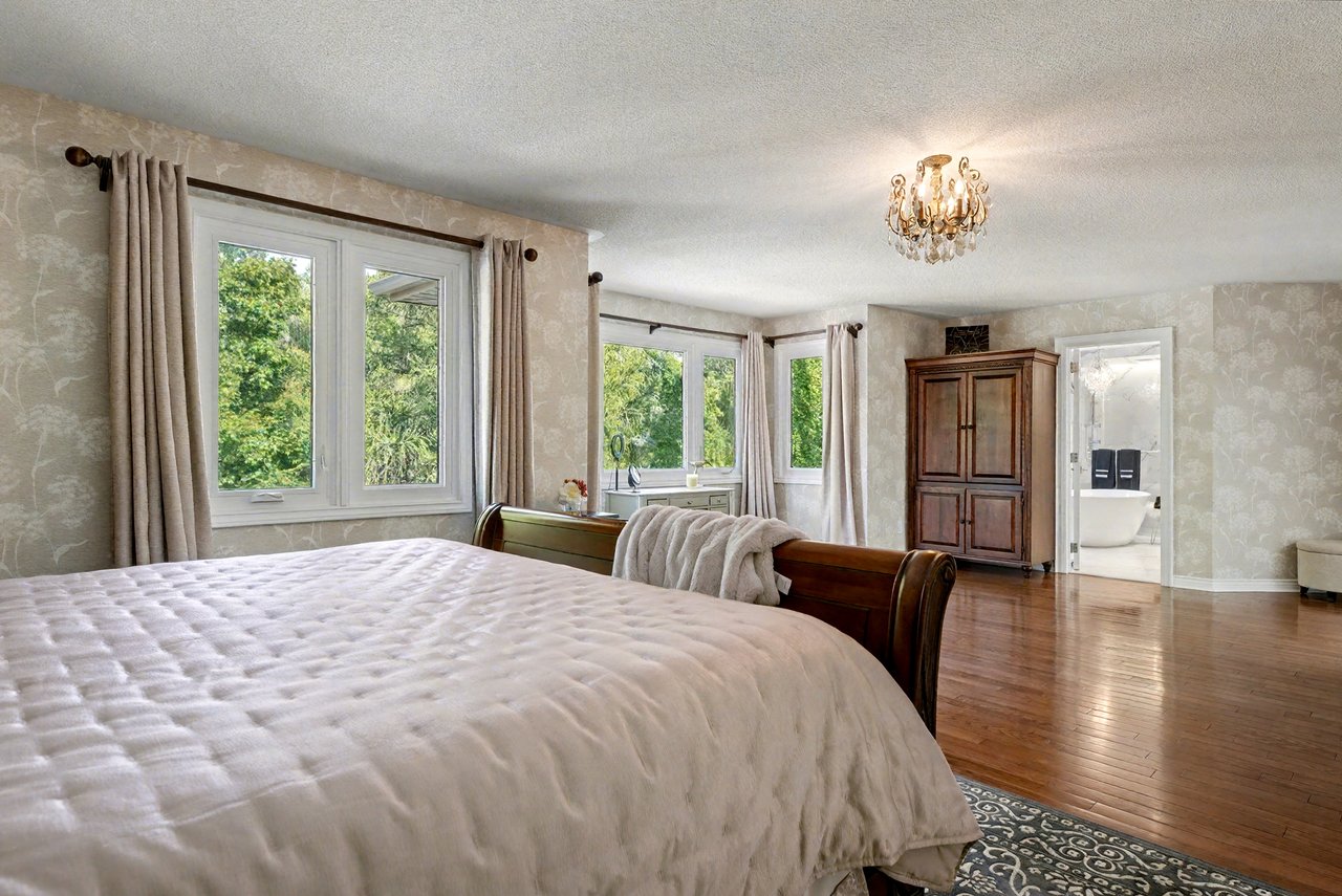 Huge primary suite with luxurious 6 piece en-suite and walk-in closet with organizers. The en-suite has a dual frameless shower with Riobel plumbing fixtures including body jets, stand-alone tub over-looking the backyard, two vanities with Swarovski crystal hardware, heated floors, all very tastefully done.