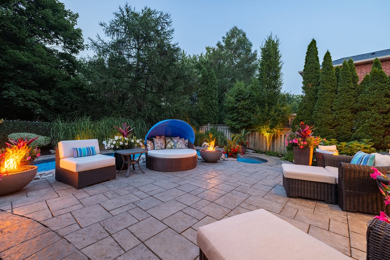 Awesome backyard backing onto green space. In-ground pool, gazebo, landscaping, and privacy fencing, fire bowls and patios for gatherings.