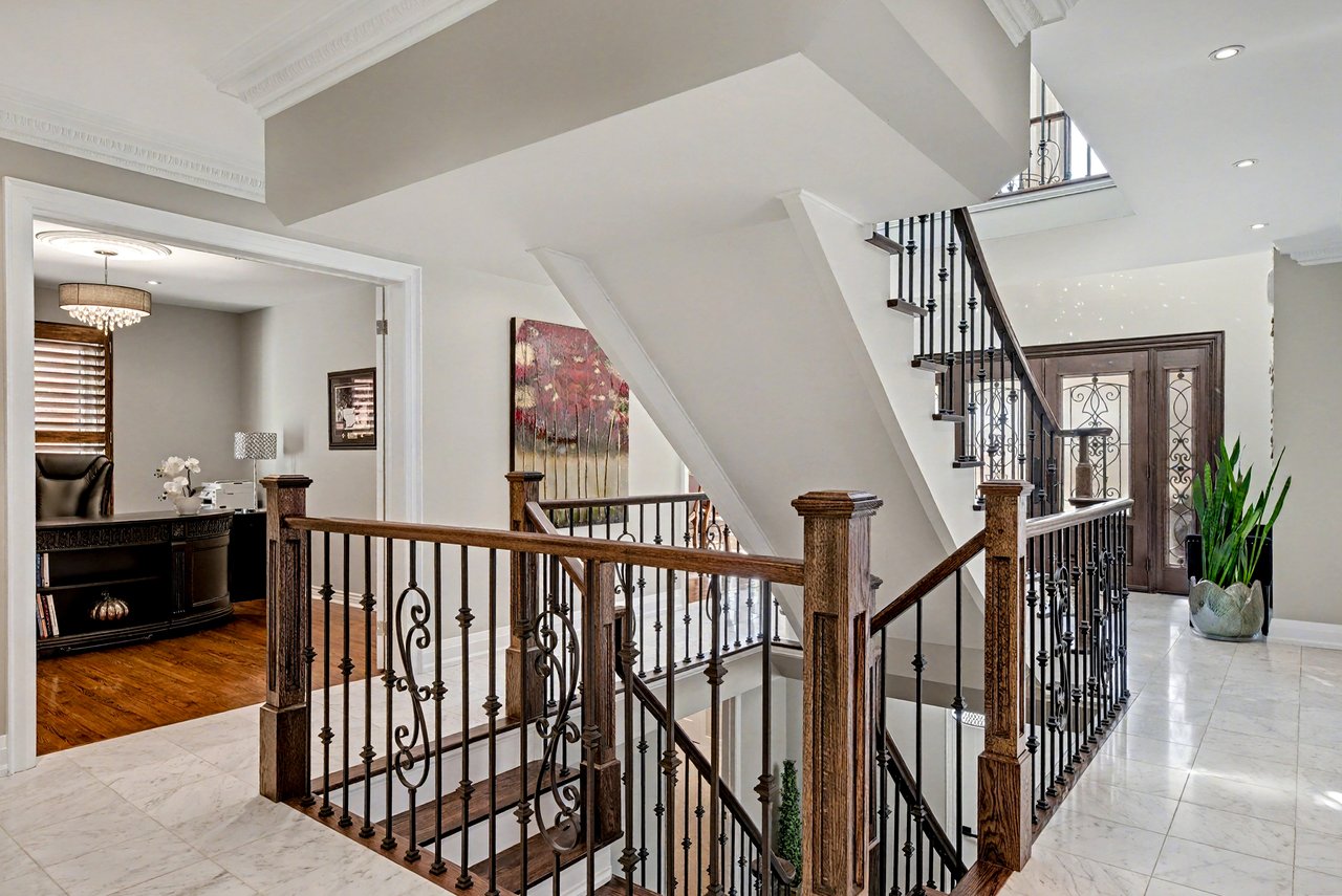 Dramatic entry to home with soaring ceiling height with skylight, Scarlett O’Hara staircase and honed marble floor tiles.