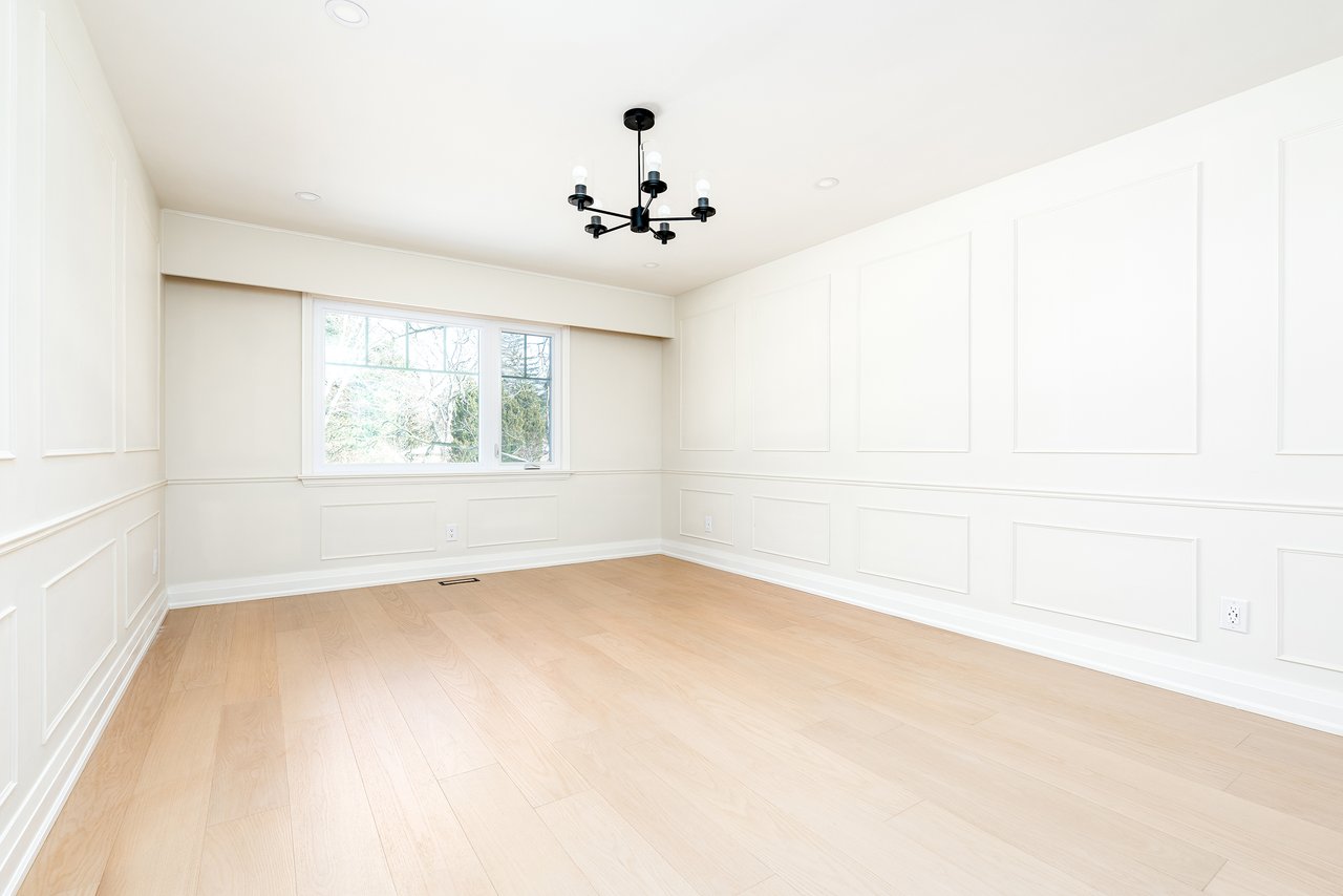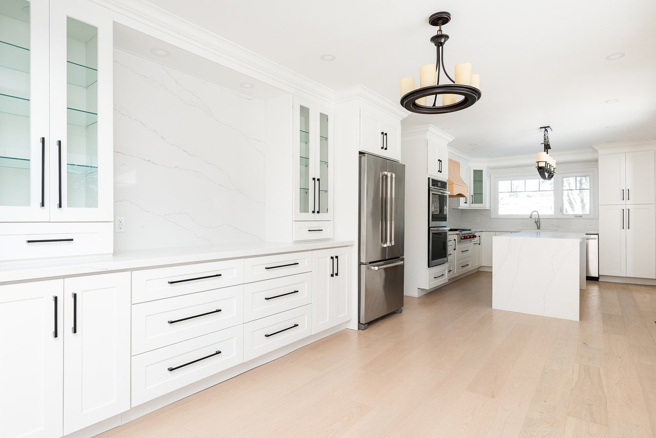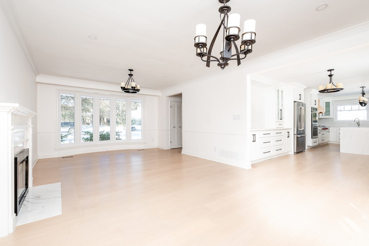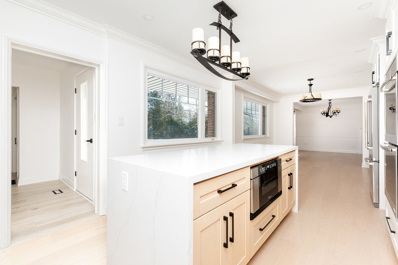 The thoughtfully redesigned main level showcases an elegant open-concept living, dining, and kitchen space, ideal for both refined entertaining and everyday family living, complemented by a private main-floor office. Throughout the home, you’ll find new wide-plank hardwood flooring, custom iron-railing staircases, wainscoting wall paneling, crown moulding, designer baseboards, and pot lighting across all three levels, accented by statement chandeliers and curated lighting fixtures.