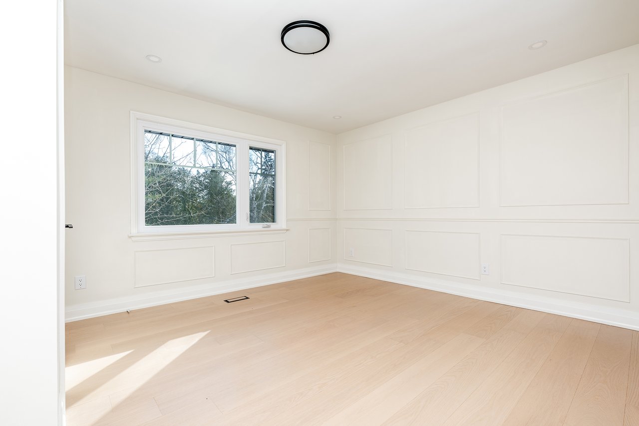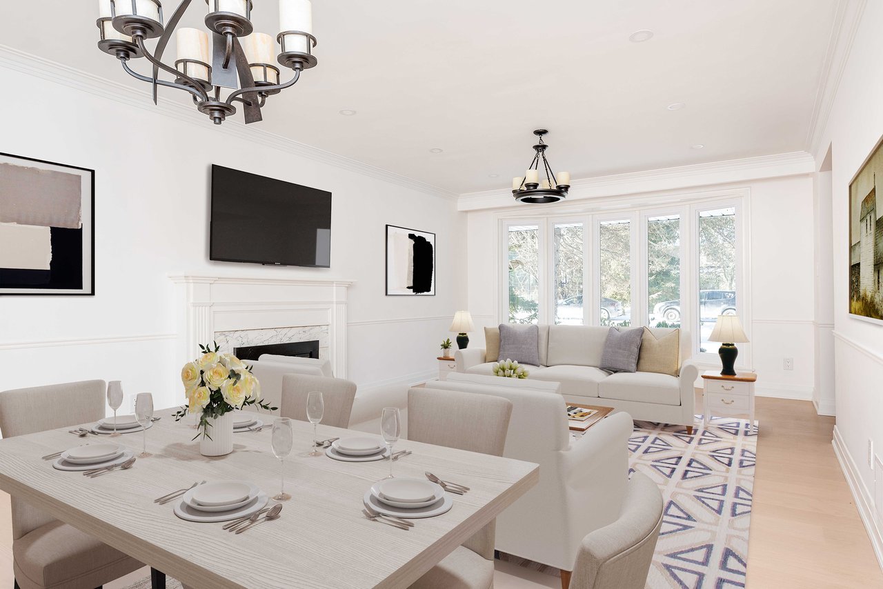 The dining room features magnificent floor-to-ceiling bay windows overlooking the front yard and French doors leading to the backyard oasis. The space is centred around a beautiful gas fireplace featuring a marble surround and hearth, finished with crisp architectural millwork.