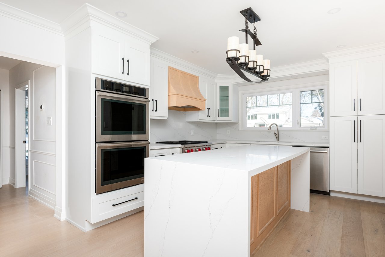 The chef’s kitchen is a true showpiece, featuring custom cabinetry, a dramatic quartz waterfall centre island, and top-of-the-line built-in appliances, seamlessly blending form and function.