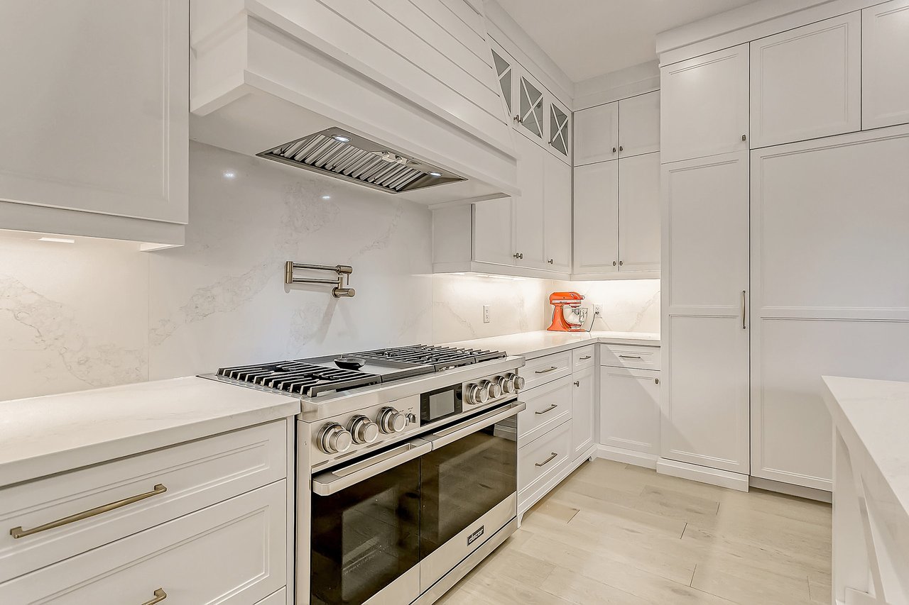 Private office is tucked behind modern barn doors and the formal dining provides direct kitchen access through the full-service servery. The kitchen will appease the chef in the family with full-height two-step shaker cabinetry with marbled counter and book-matched walls and commercial grade integrated appliances. Porcelain skirted farmhouse sink with brass standing faucet overlooks the lush gardens and the oversized island offers additional seating and a solid prep surface. Custom glass enclosed wine cellar leads to the two-story great room with a full wall of stacked windows and feature wall with brick gas fireplace – an ideal spot to lounge. Glass French doors open to rear portico and enjoy views of the backyard oasis.