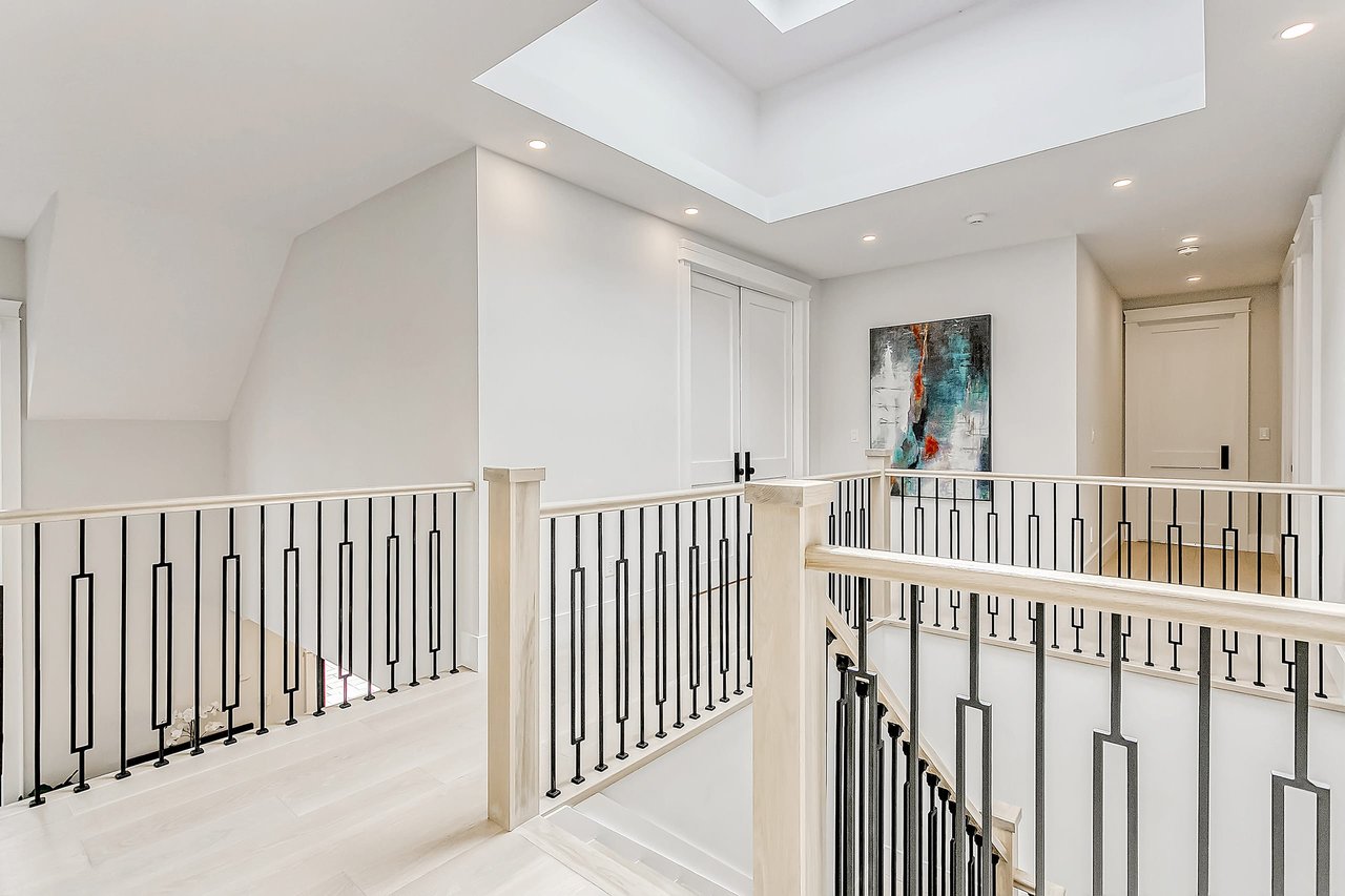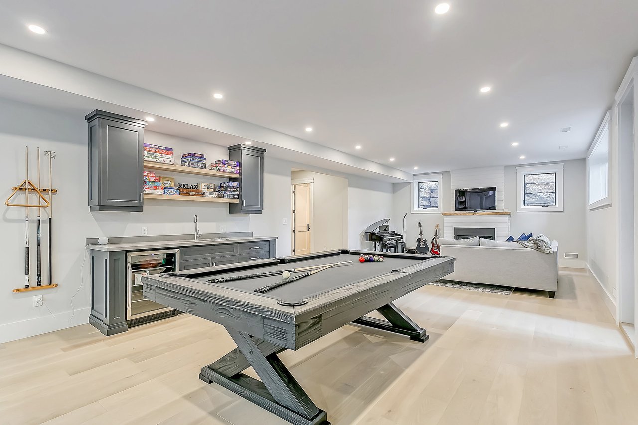 The primary is a retreat with formal entrance with freestanding shiplap feature wall, vaulted ceilings and expansive windows. The dressing room is outfitted with custom built-ins and the ensuite is hotel-worthy. Each additional bedroom is generously sized with ample storage and private ensuites. The lower level features a fifth bedroom and semi-ensuite, media room, family and game space with wetbar, glass enclosed gym and walk-up to rear yard.