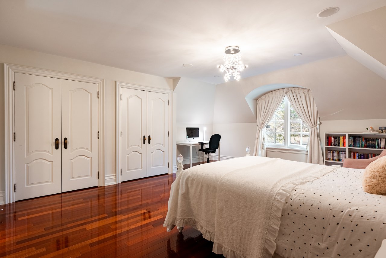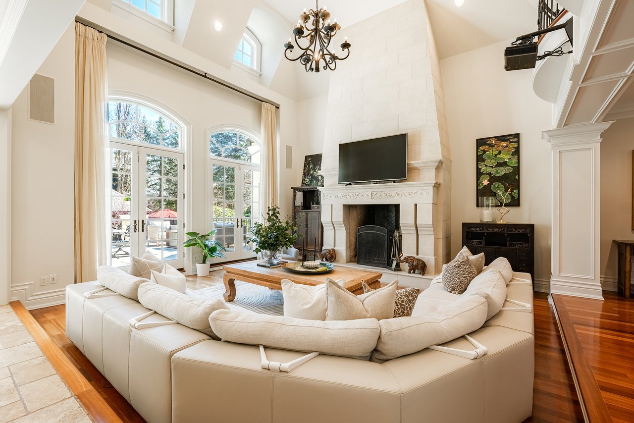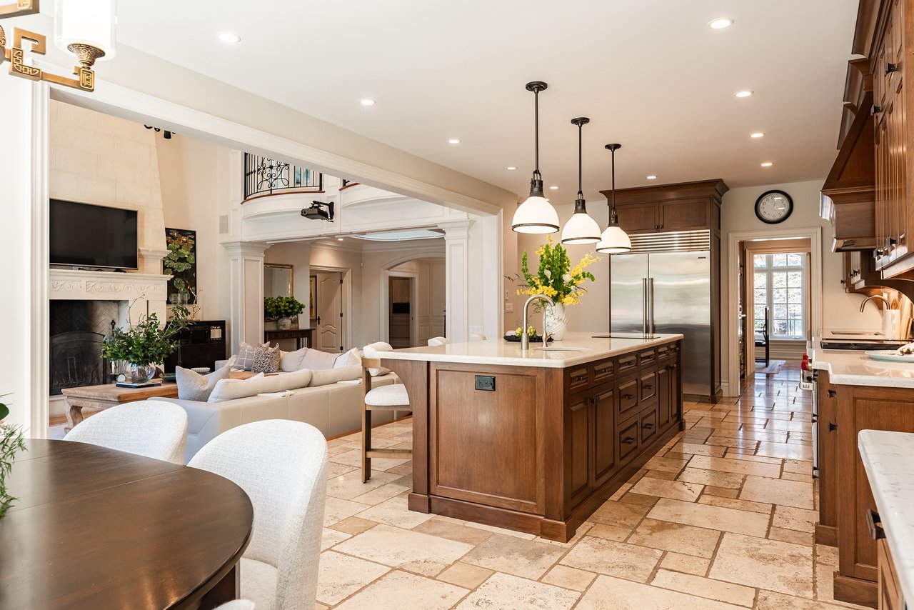 Designed for both luxurious entertaining and comfortable everyday living, the home unfolds with a sense of scale and sophistication from the moment you enter. Soaring ceilings, oversized windows and refined finishes create a light-filled interior, while the main level offers a seamless flow between formal and casual spaces. The heart of the home is the well-appointed chef’s kitchen with a large centre island, premium appliances, abundant custom cabinetry, servery and an airy breakfast area overlooking the backyard. Just beyond, the dramatic family room with double-height ceilings and wood burning fireplace creates a stunning yet welcoming gathering space. A formal dining room and private office are located near the front of the home. The thoughtfully designed mudroom/laundry complete the main floor with separate entrance from outside, inside access to the garage as well as private access to the second-floor nanny suite.