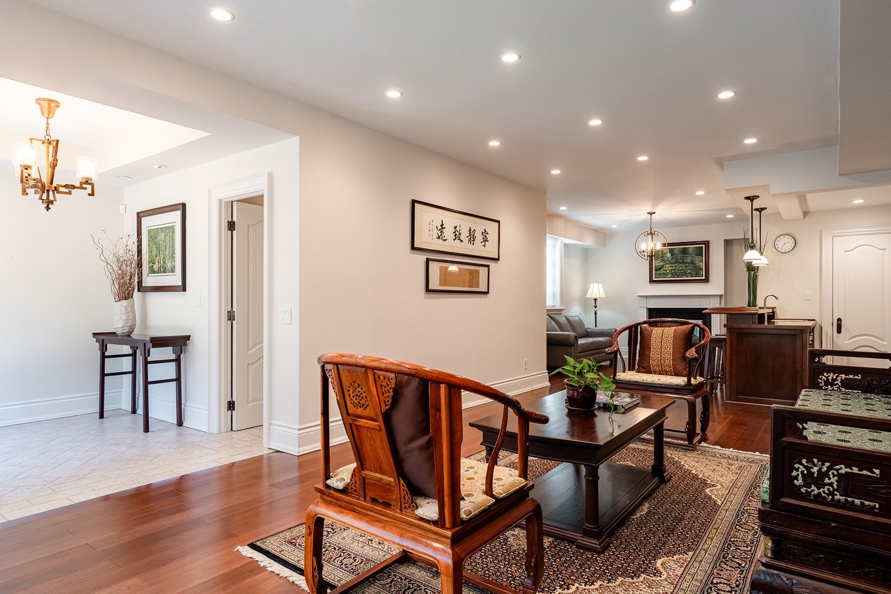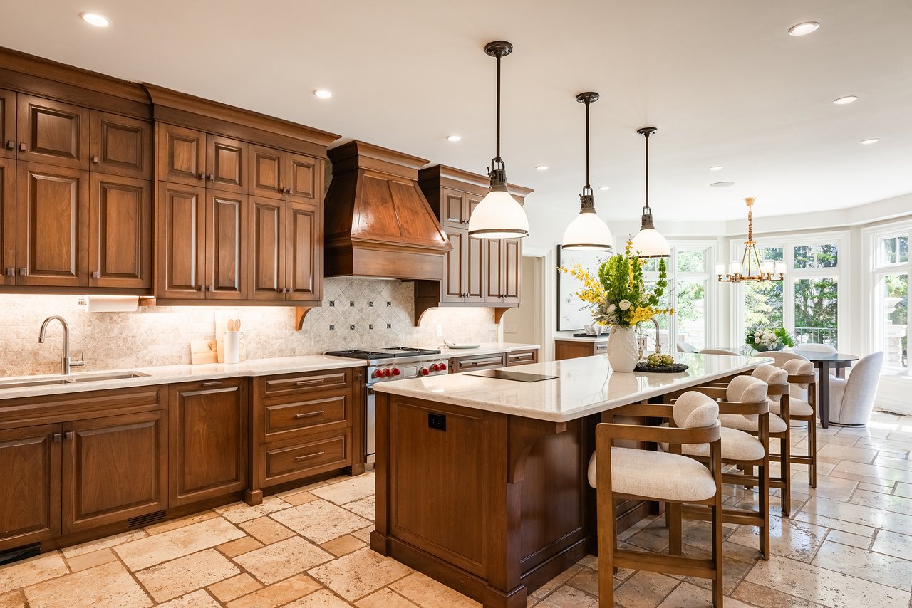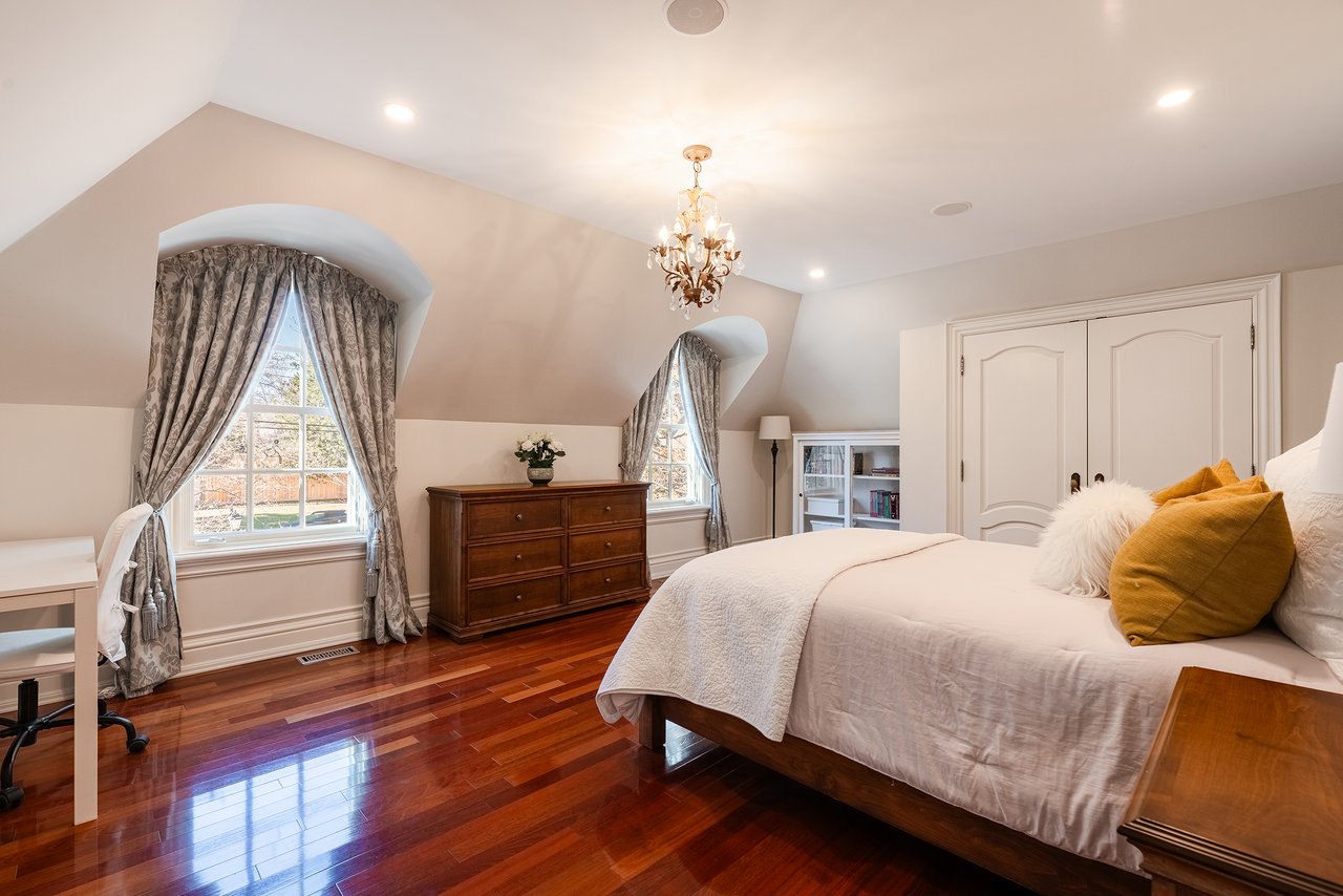 Designed for both luxurious entertaining and comfortable everyday living, the home unfolds with a sense of scale and sophistication from the moment you enter. Soaring ceilings, oversized windows and refined finishes create a light-filled interior, while the main level offers a seamless flow between formal and casual spaces. The heart of the home is the well-appointed chef’s kitchen with a large centre island, premium appliances, abundant custom cabinetry, servery and an airy breakfast area overlooking the backyard. Just beyond, the dramatic family room with double-height ceilings and wood burning fireplace creates a stunning yet welcoming gathering space. A formal dining room and private office are located near the front of the home. The thoughtfully designed mudroom/laundry complete the main floor with separate entrance from outside, inside access to the garage as well as private access to the second-floor nanny suite.