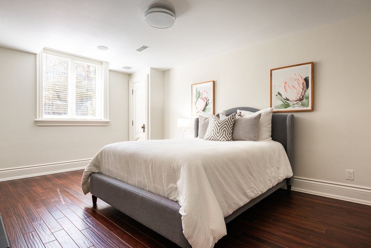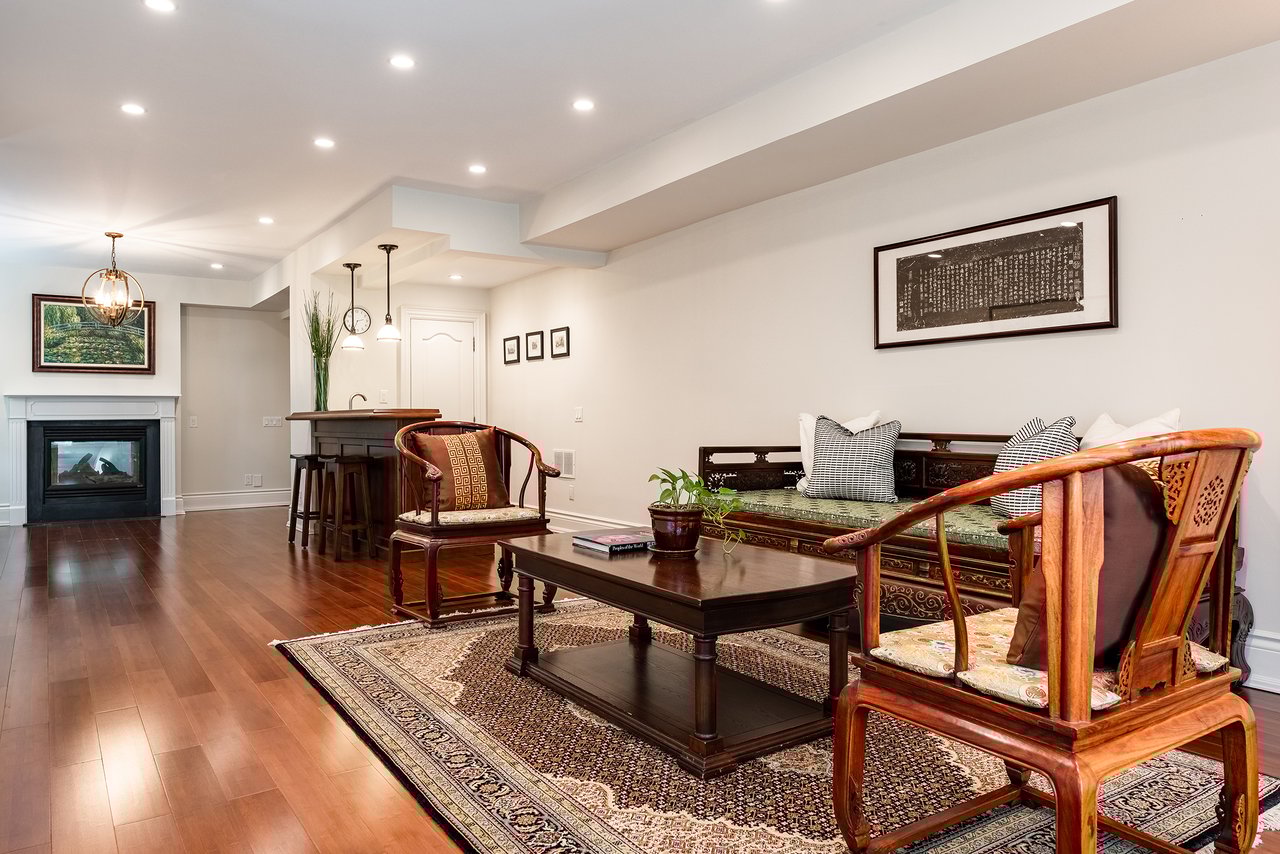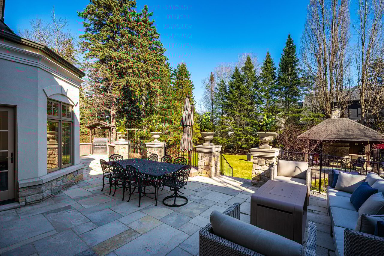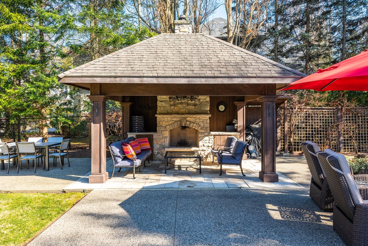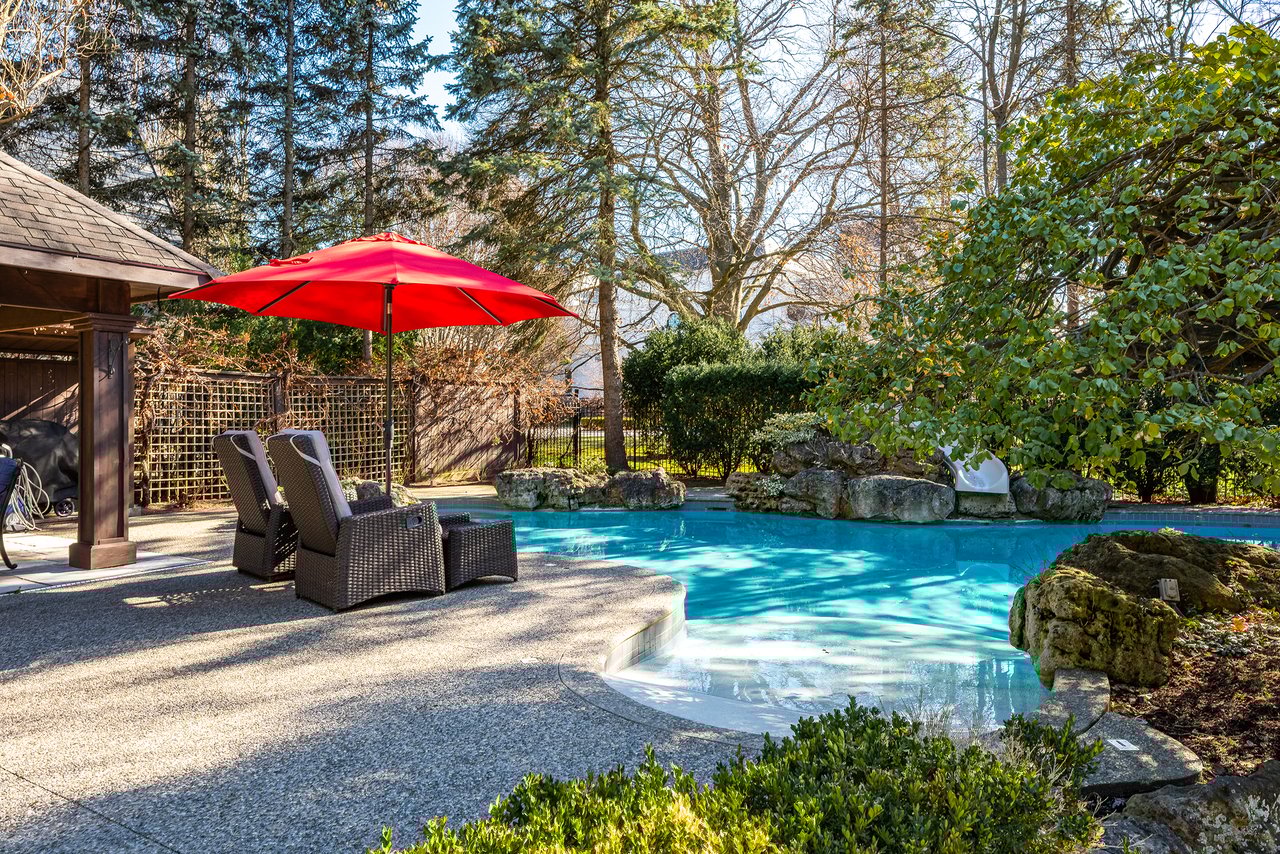 Outdoors, the property transforms into a private backyard retreat. Surrounded by mature trees and lush landscaping, the setting is anchored by a spectacular in-ground pool, multiple seating and entertaining areas, and a charming, covered cabana/lounge space that feels worlds away from the city. It is an extraordinary outdoor environment designed for both quiet enjoyment and unforgettable summer entertaining.
