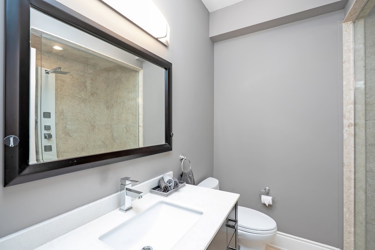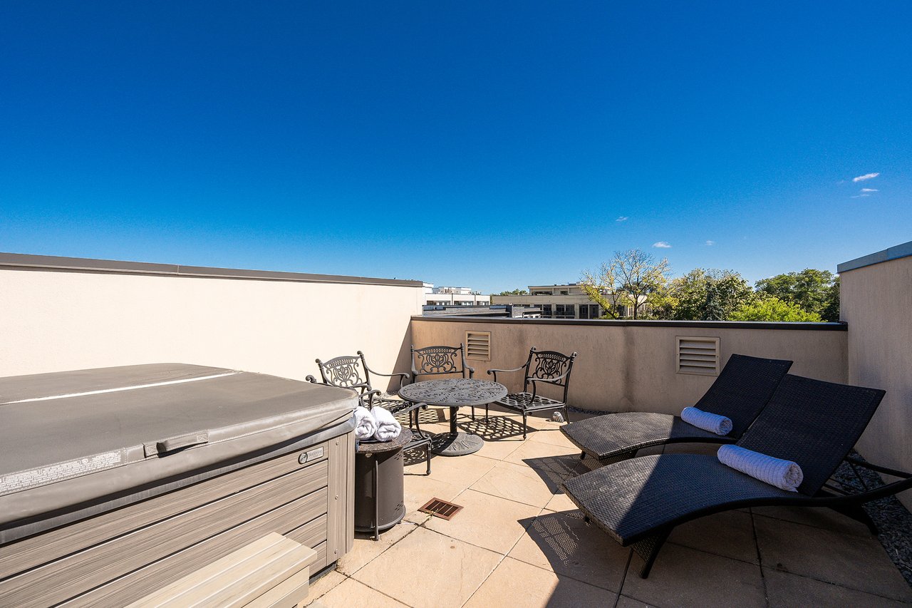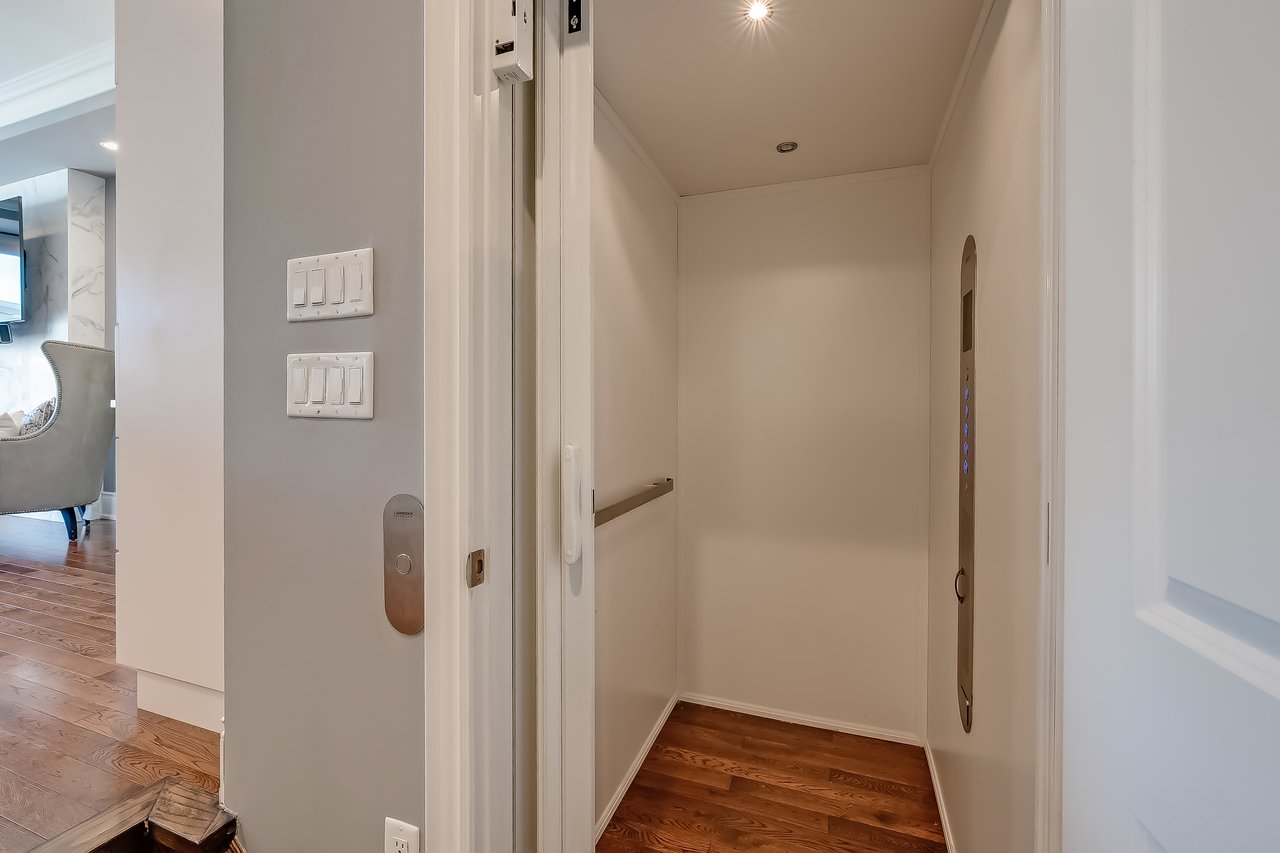 The lower level features high ceilings, a versatile gym or rec room with chic fireplace, mudroom, + direct garage access. A private elevator connects every level—including the rooftop terrace with hot tub. With parking for four vehicles, convenience abounds for both residents + guests alike.