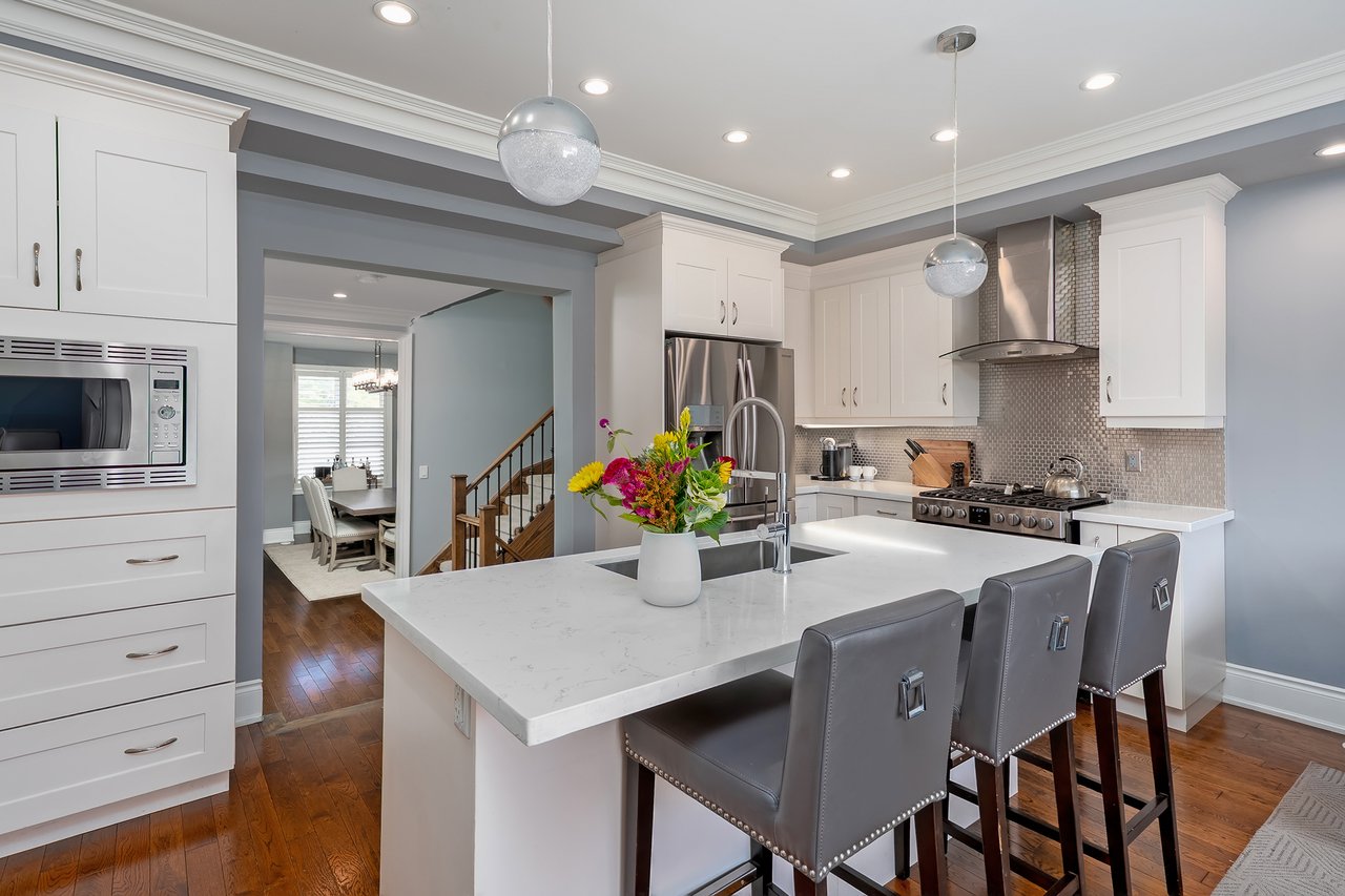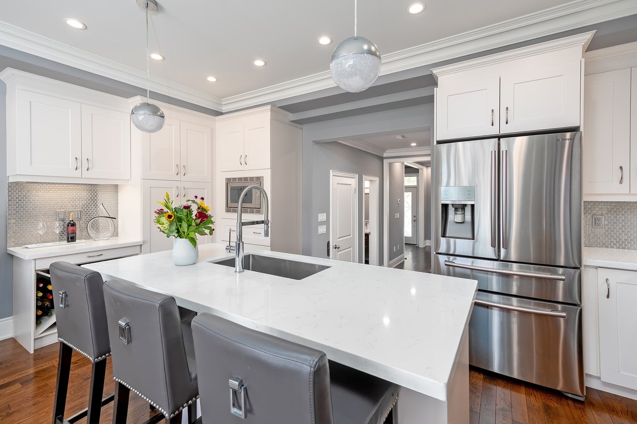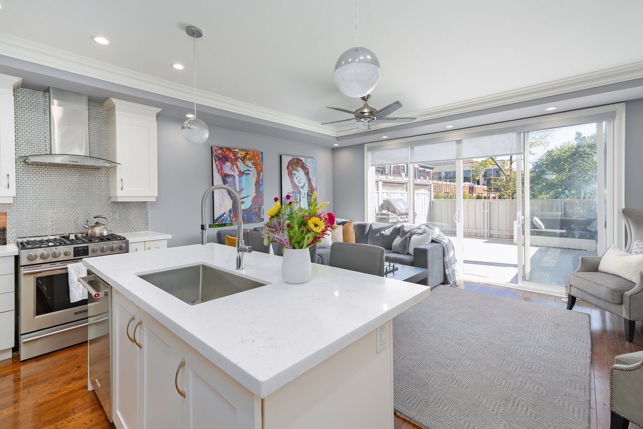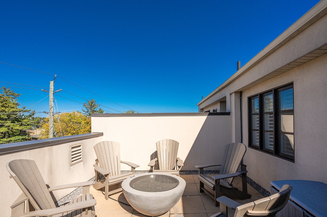 The sun-filled main level features hardwood floors, high ceilings and a clever floor plan with both a formal dining room + a contemporary open-concept eat-in kitchen + great room. The custom kitchen includes white quartz counters, central island with seating, newer appliances + abundant storage. The spacious great room offers a cozy fireplace feature wall and wall-to-wall windows with sliding doors that open to the rear terrace. This south-facing terrace is a private escape, ideal for al fresco dining or relaxing with friends and family.