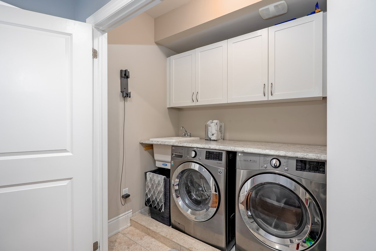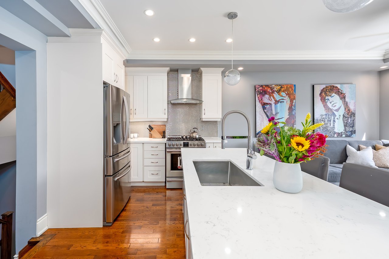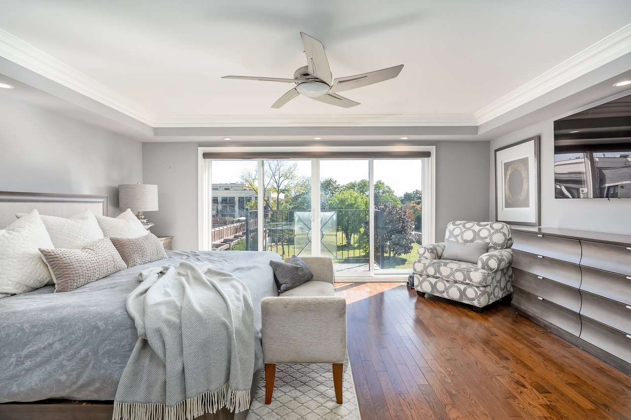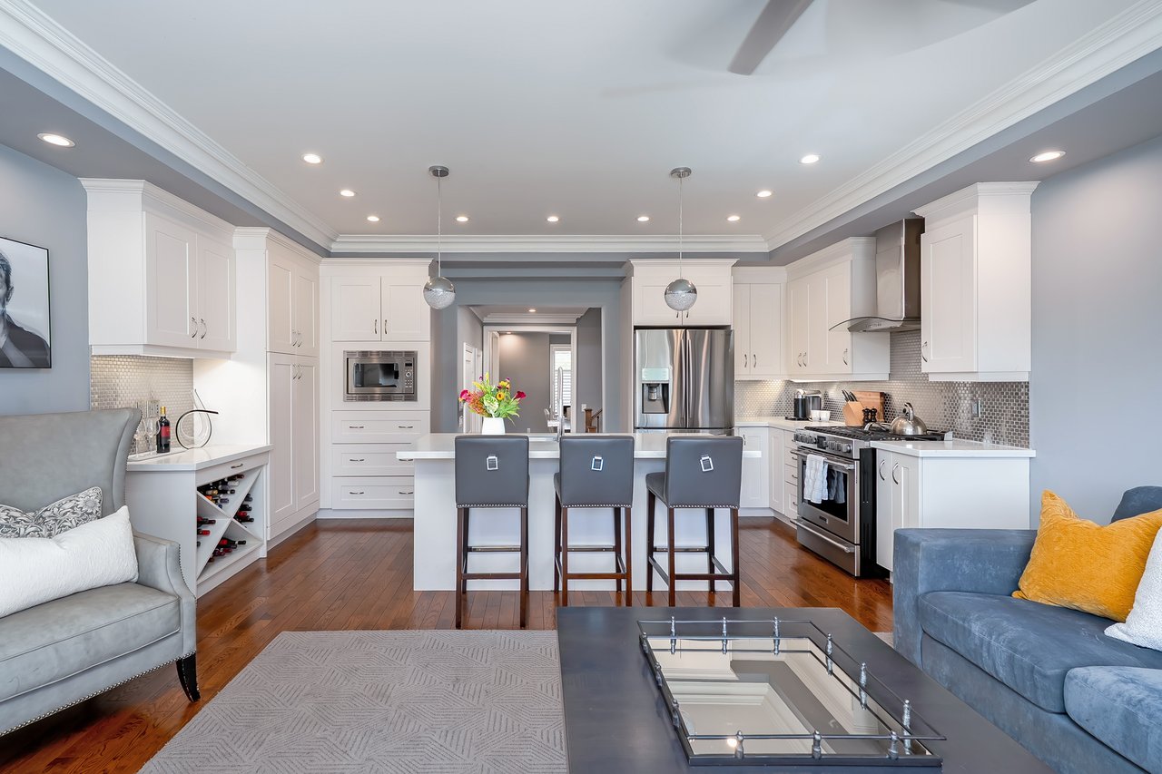 The sun-filled main level features hardwood floors, high ceilings and a clever floor plan with both a formal dining room + a contemporary open-concept eat-in kitchen + great room. The custom kitchen includes white quartz counters, central island with seating, newer appliances + abundant storage. The spacious great room offers a cozy fireplace feature wall and wall-to-wall windows with sliding doors that open to the rear terrace. This south-facing terrace is a private escape, ideal for al fresco dining or relaxing with friends and family.