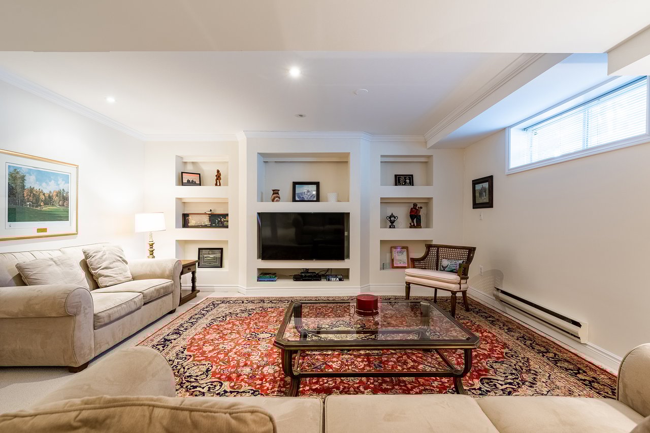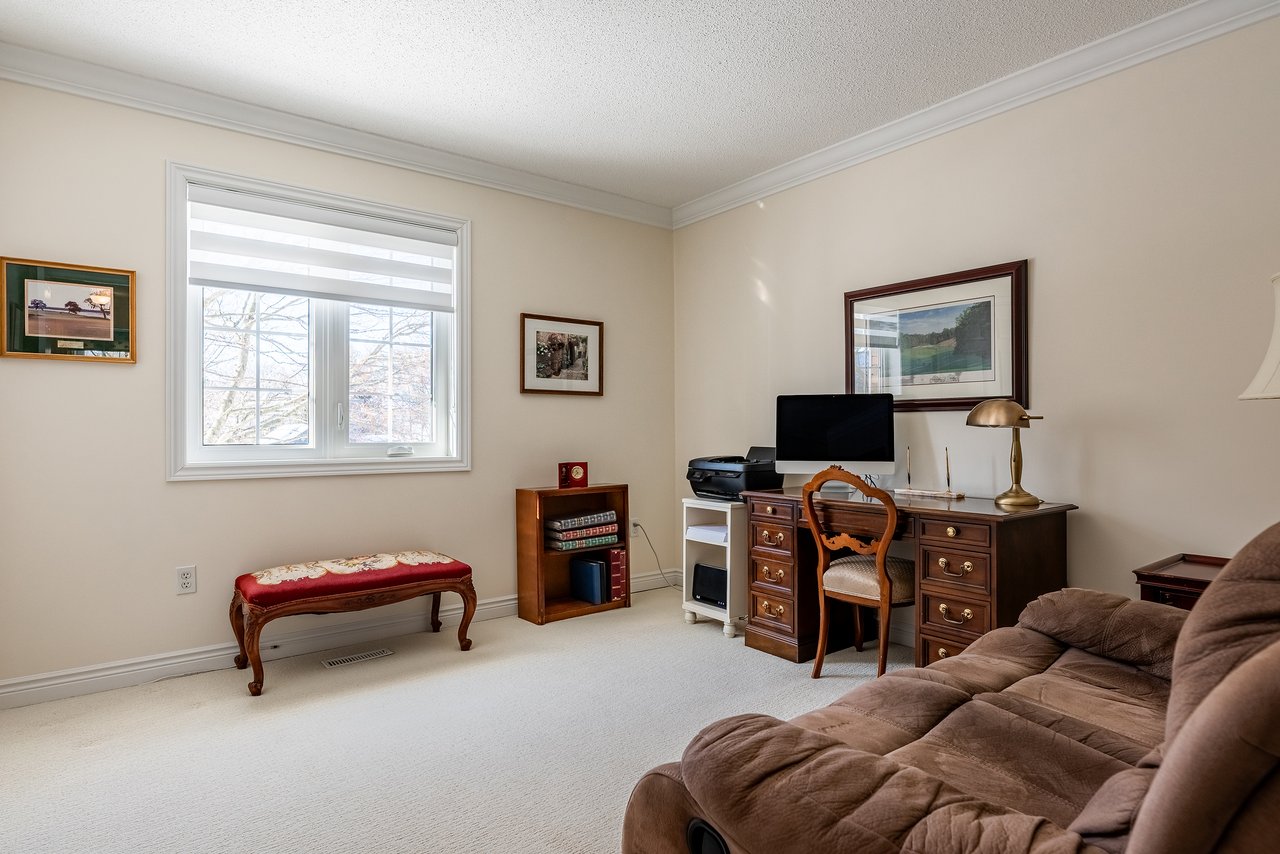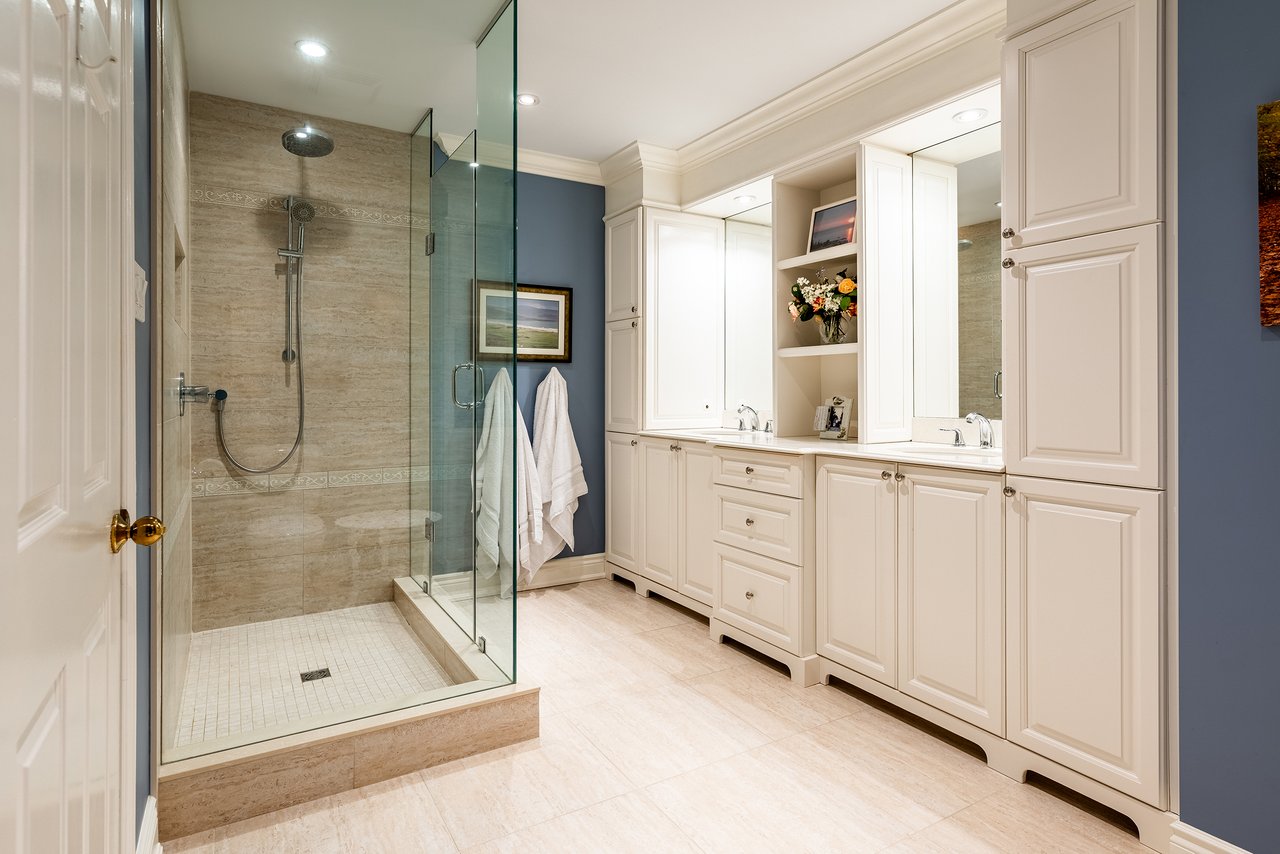 The second floor is home to three generously proportioned bedrooms, including an elegant primary suite. A dedicated sitting area, walk-in closet and spa-inspired ensuite create a true personal sanctuary. Elevated sightlines capture glimpses of the surrounding harbour and lake. A large, well-appointed laundry room is also conveniently located on this floor, offering ample storage, workspace and everyday practicality.
