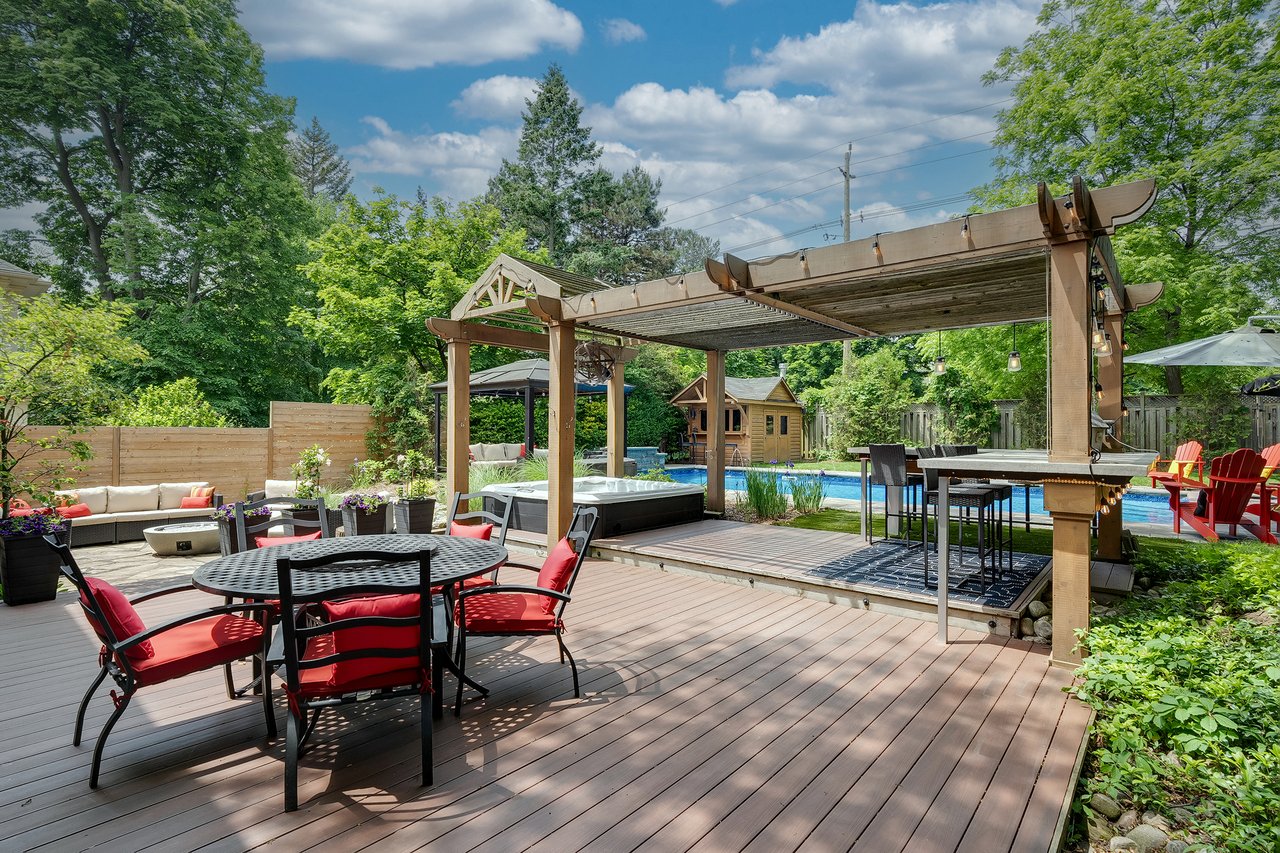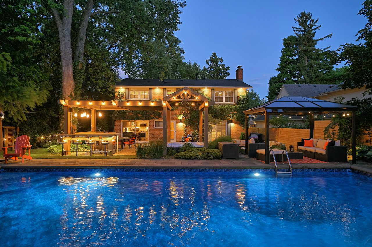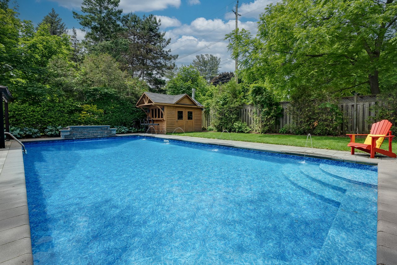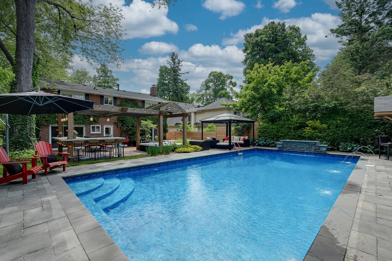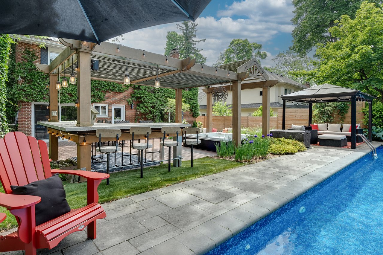 Tucked behind this traditional brick home, the backyard unfolds like a private resort. A crisp rectangular pool anchors the space, framed by pale stone and mature trees for a secluded, garden-like feel + a seated bar takes entertaining up a notch. Thoughtful zones elevate the space; pergola-covered hot tub, outdoor kitchen + dining and relaxed lounge pavilion, invite effortless entertaining. Natural stone terraces + layered mature greenery add to the privacy. Every element feels considered yet effortless, designed for both grand summer gatherings + quiet, everyday rituals. This is a sophisticated home with an immaculately private lot with resort style back yard – in one of the most family-focused neighbourhoods in Oakville.