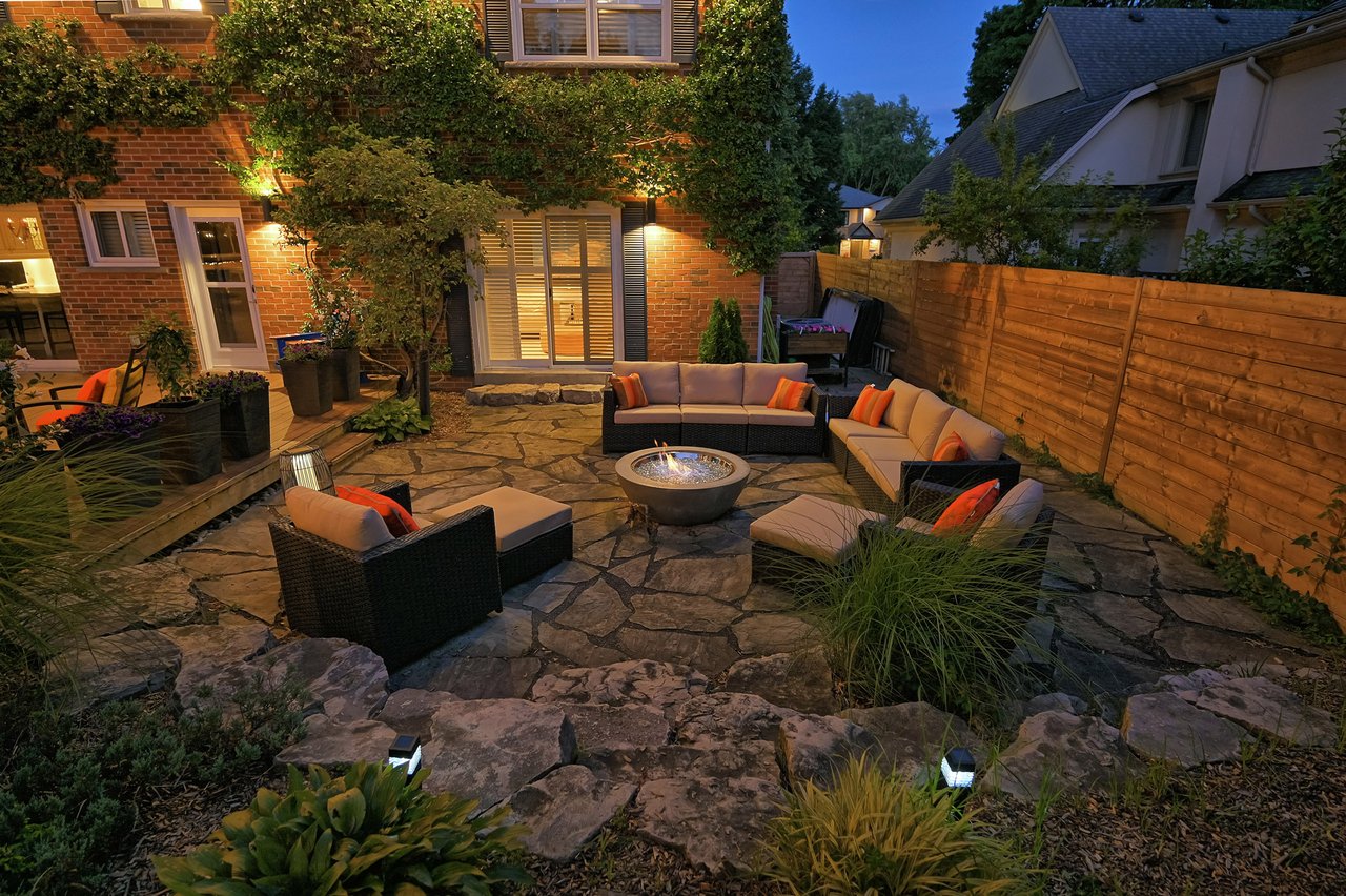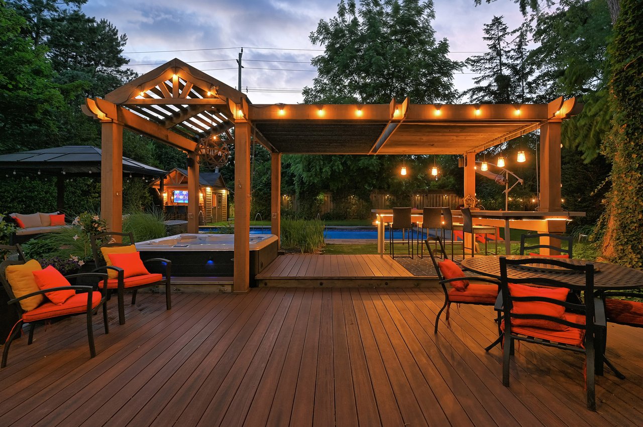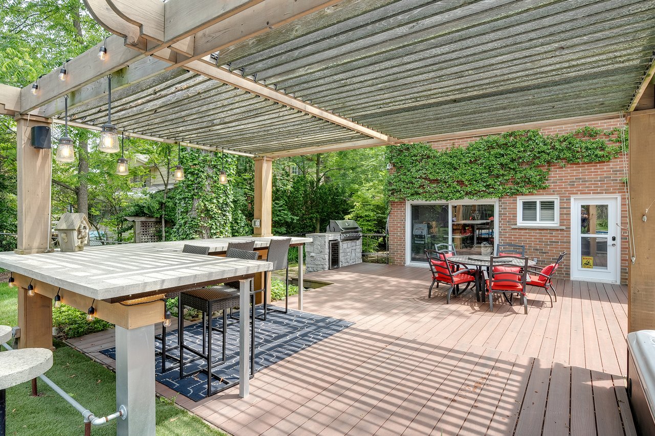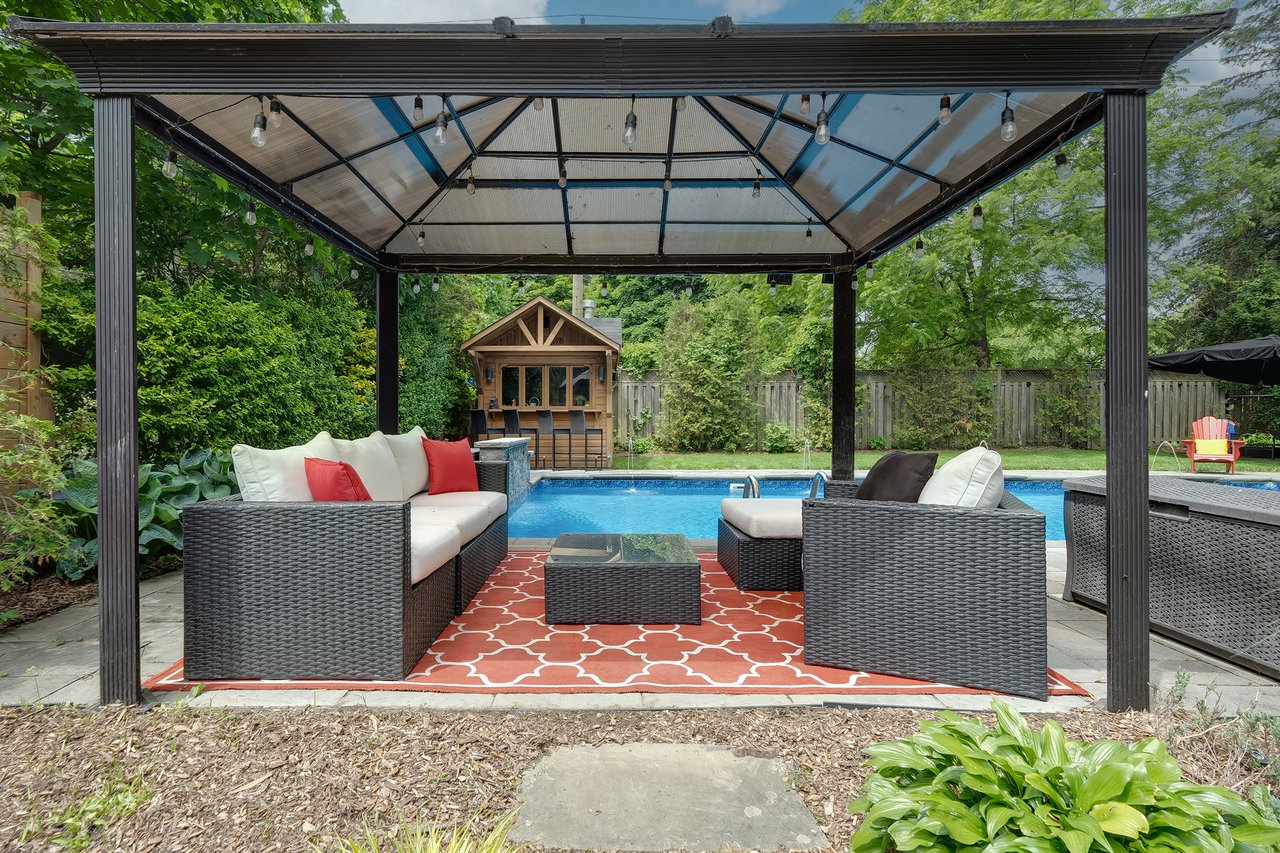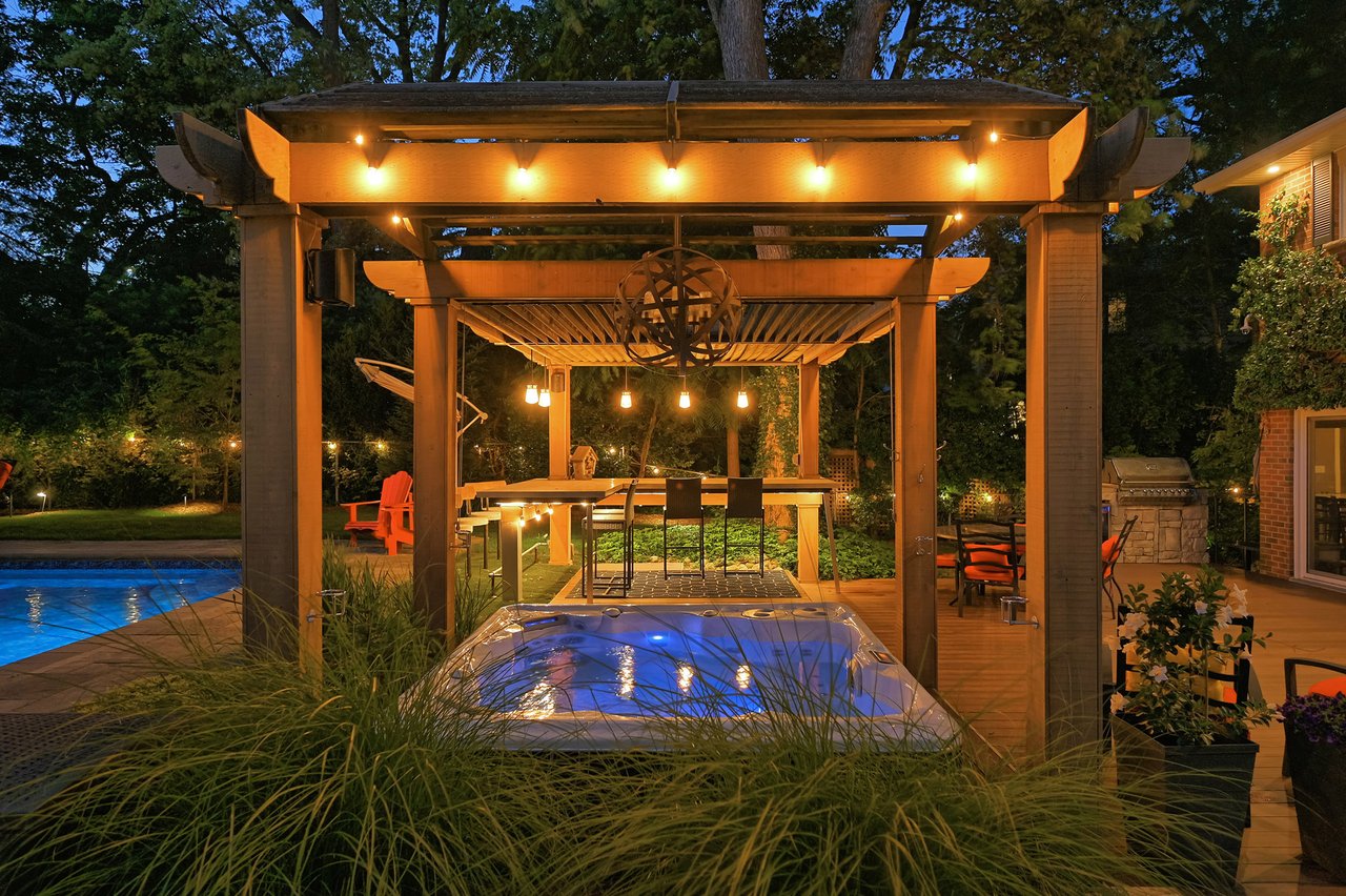 Tucked behind this traditional brick home, the backyard unfolds like a private resort. A crisp rectangular pool anchors the space, framed by pale stone and mature trees for a secluded, garden-like feel + a seated bar takes entertaining up a notch. Thoughtful zones elevate the space; pergola-covered hot tub, outdoor kitchen + dining and relaxed lounge pavilion, invite effortless entertaining. Natural stone terraces + layered mature greenery add to the privacy. Every element feels considered yet effortless, designed for both grand summer gatherings + quiet, everyday rituals. This is a sophisticated home with an immaculately private lot with resort style back yard – in one of the most family-focused neighbourhoods in Oakville.
