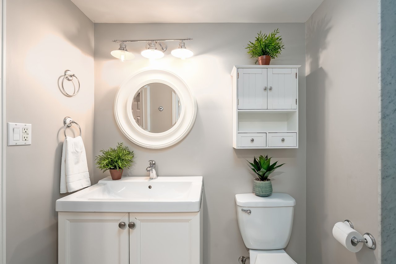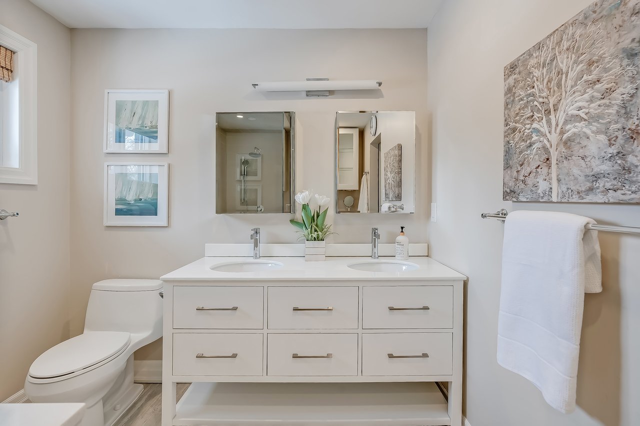 Strategically designed and featured on HGTV, the lower level is an extension of the refined living spaces on the upper levels. Warm + inviting with pattered textiles + a stone-clad wood-burning fireplace, this level is an ideal family gathering space. The rec room is perfect for movie nights with expansive screen + projector + surround sound and the outfitted wet bar make entertaining a breeze. Gym and guest bedroom with semi-ensuite complete this level.