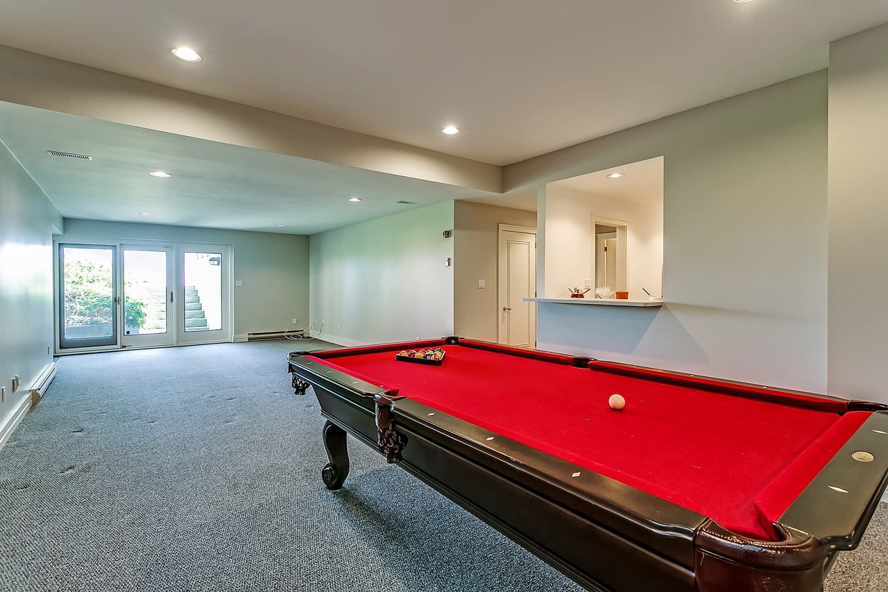 The walk-out lower level provides up to 9-foot ceilings, a sprawling games and recreation room, a bar area with kitchenette, a full bathroom, 2 additional bedrooms, a large exercise room, a temperature controlled wine storage space, and more.