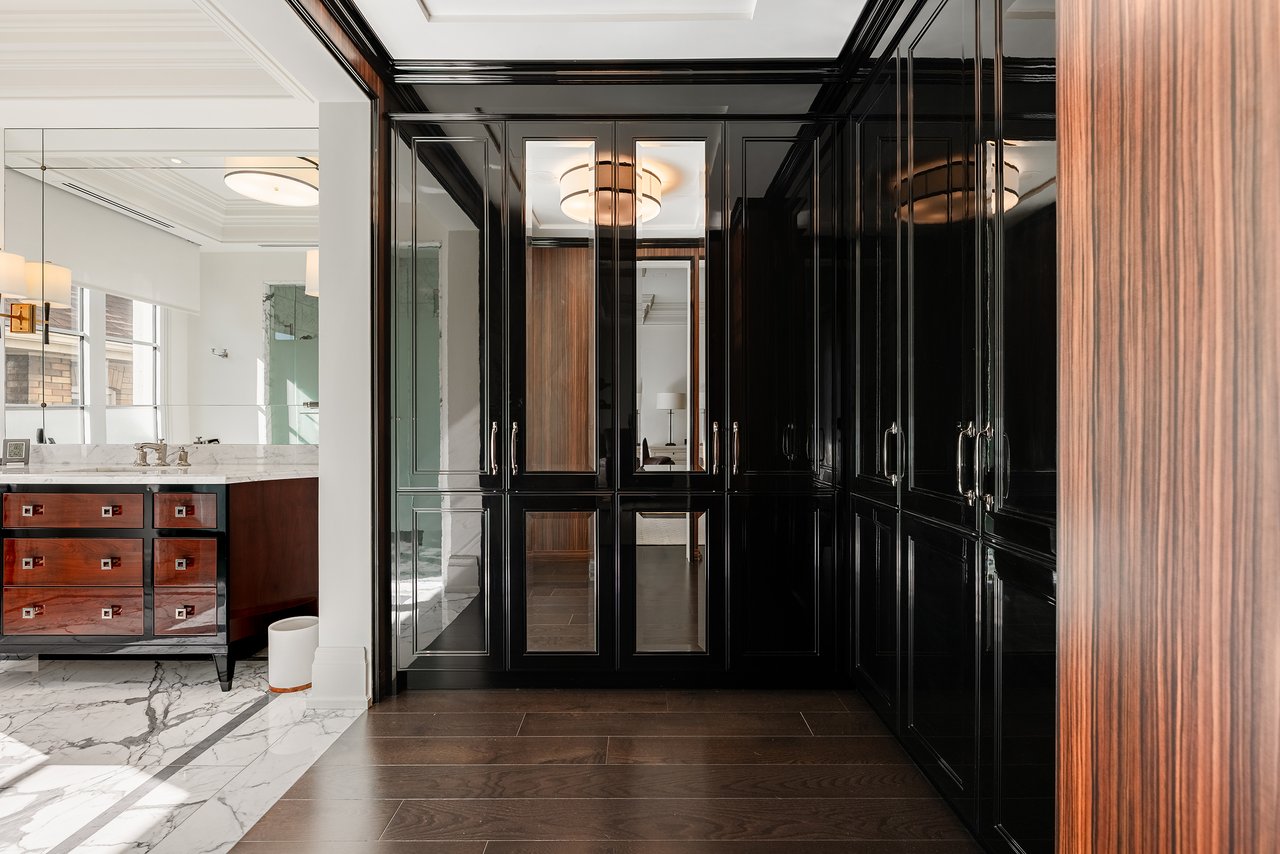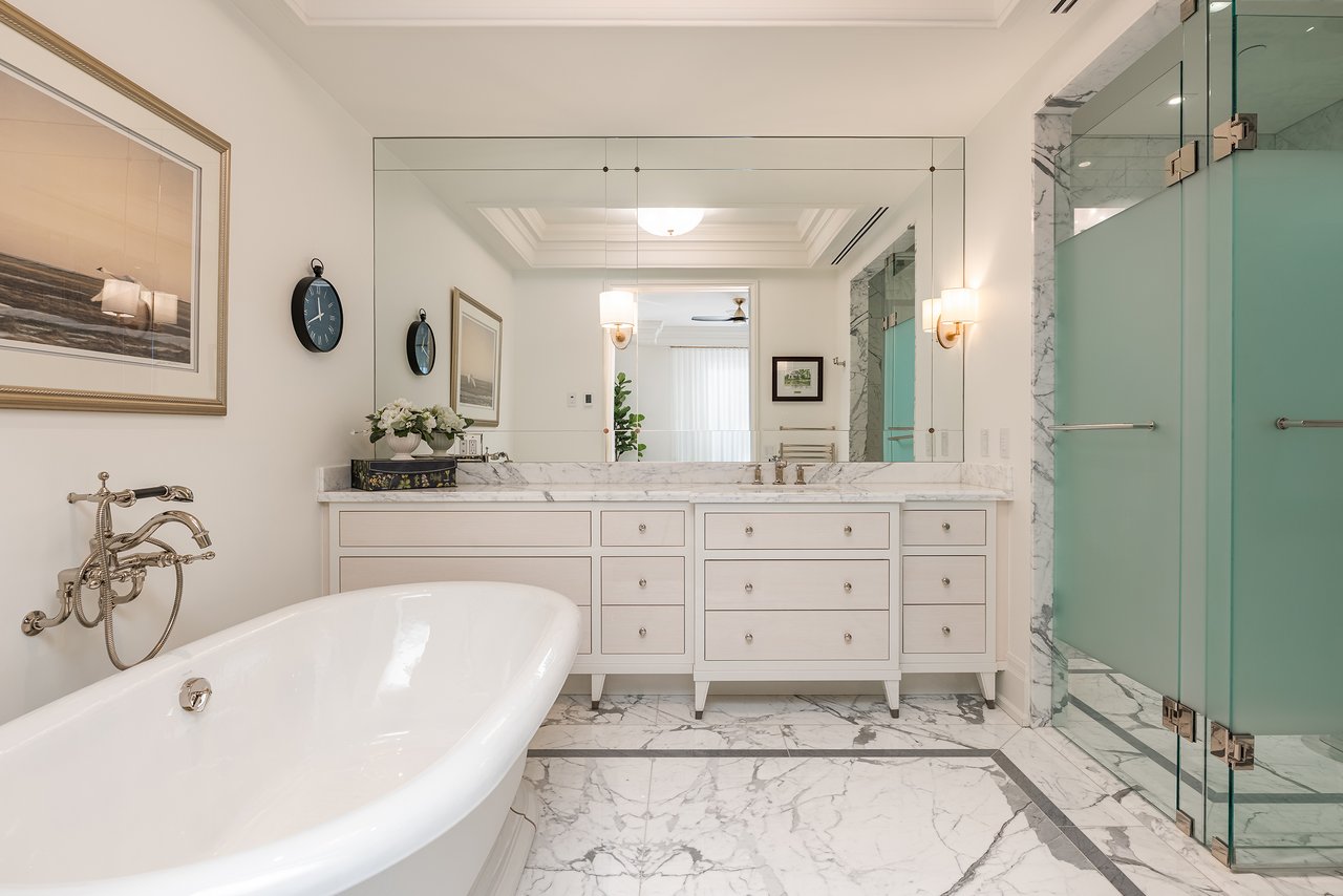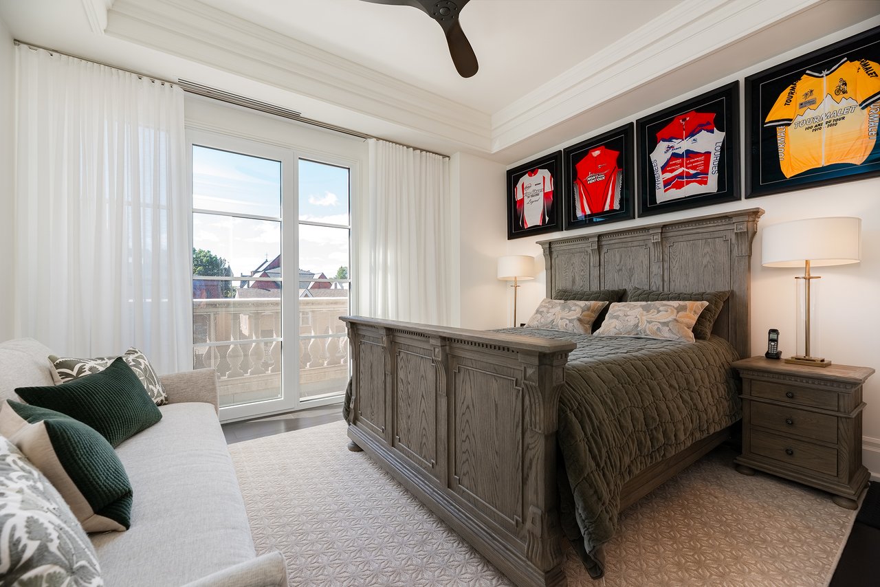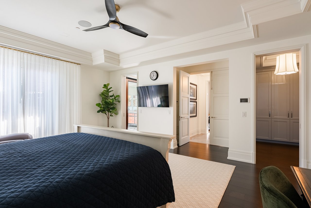 The principal bedroom is a true retreat, featuring two dressing rooms and dual ensuite baths - each with heated marble floors - offering a spa-like escape. The second bedroom includes its own ensuite, a wall-to-wall closet, and a charming Juliette balcony.