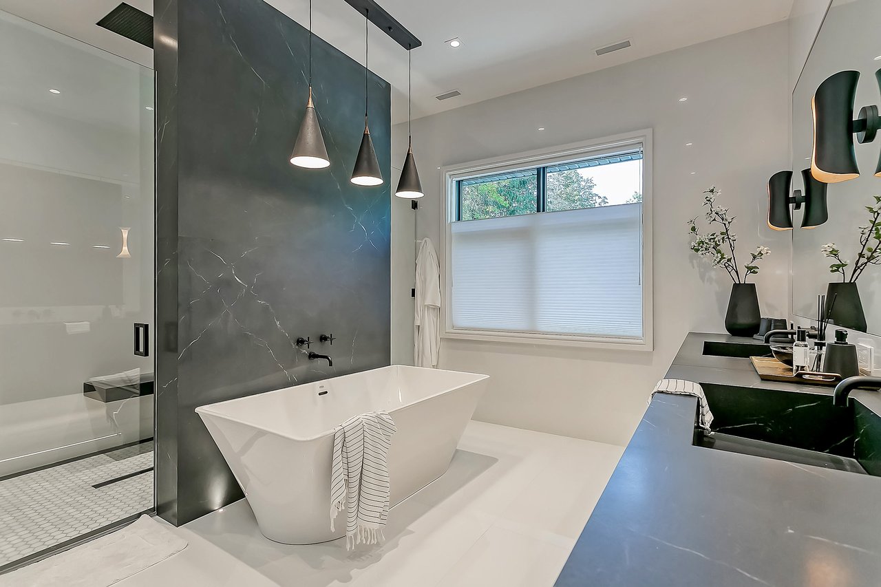 The upper hallway stops you in your tracks with beautiful, vaulted ceiling with skylights, built-in display shelving and wall sconces as well as 10-foot ceilings throughout. The master bedroom is located at the back home with a large window overlooking the rear yard and a linear gas fireplace as the focal point. His-and-her closets perfectly complement each other. The master ensuite is a beautiful combination of rich tones to create the ultimate spa oasis. Four additional bedrooms, all with walk-in closets and private ensuites as well as an oversized laundry room complete this level.