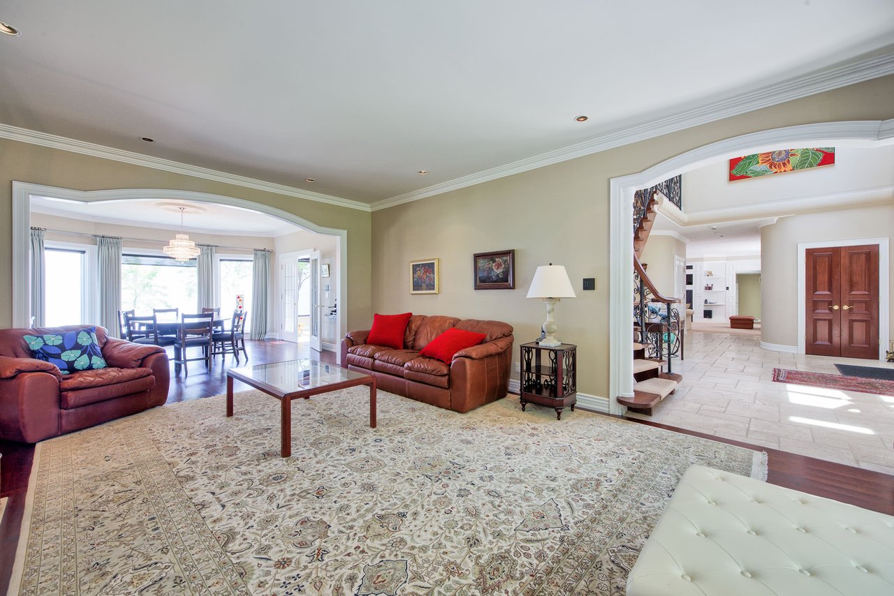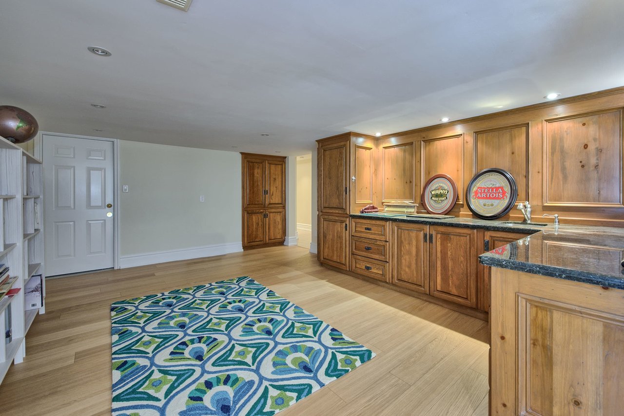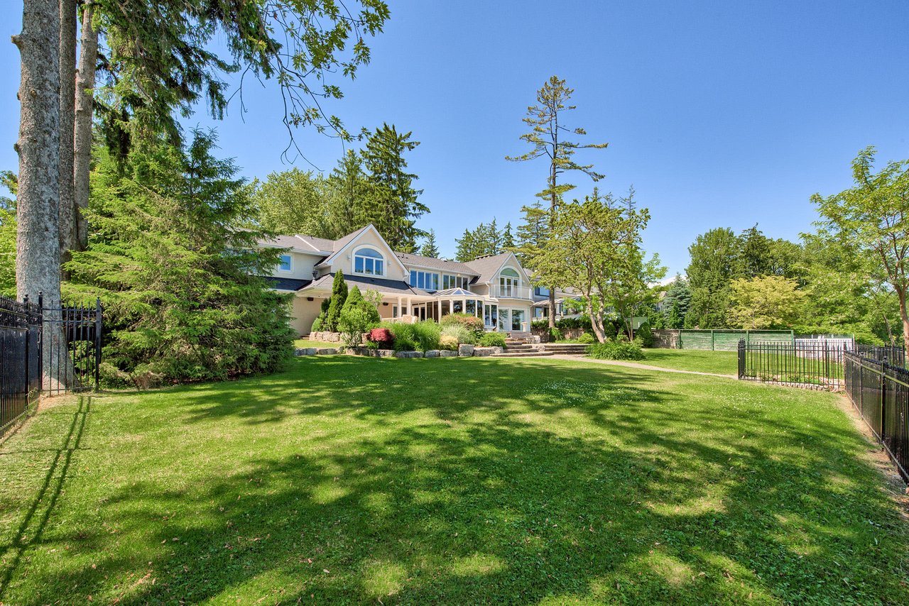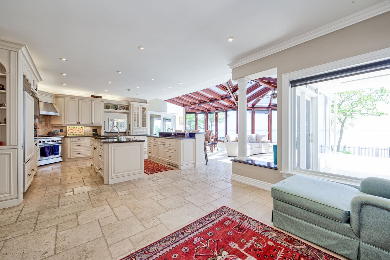 The home is built on an approx 1 acre lot and features a long, tree-lined driveway that leads to a 4 bay auto garage with a circular turnabout. The home has a recently updated kitchen that features an entire wall of windows that forms part of a sun room and hosts the breakfast area, offering idyllic panoramas of the lake. This spacious kitchen centres the main floor and is adjacent to the luxurious family room that features a wall of cherry built-in cabinetry that houses the built-in entertainment systems.