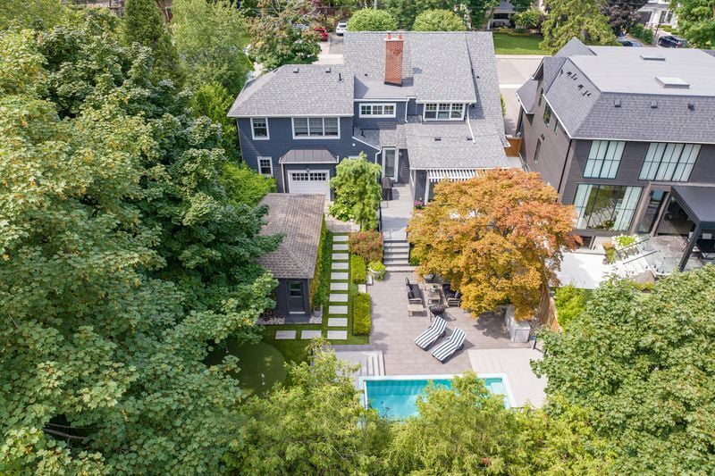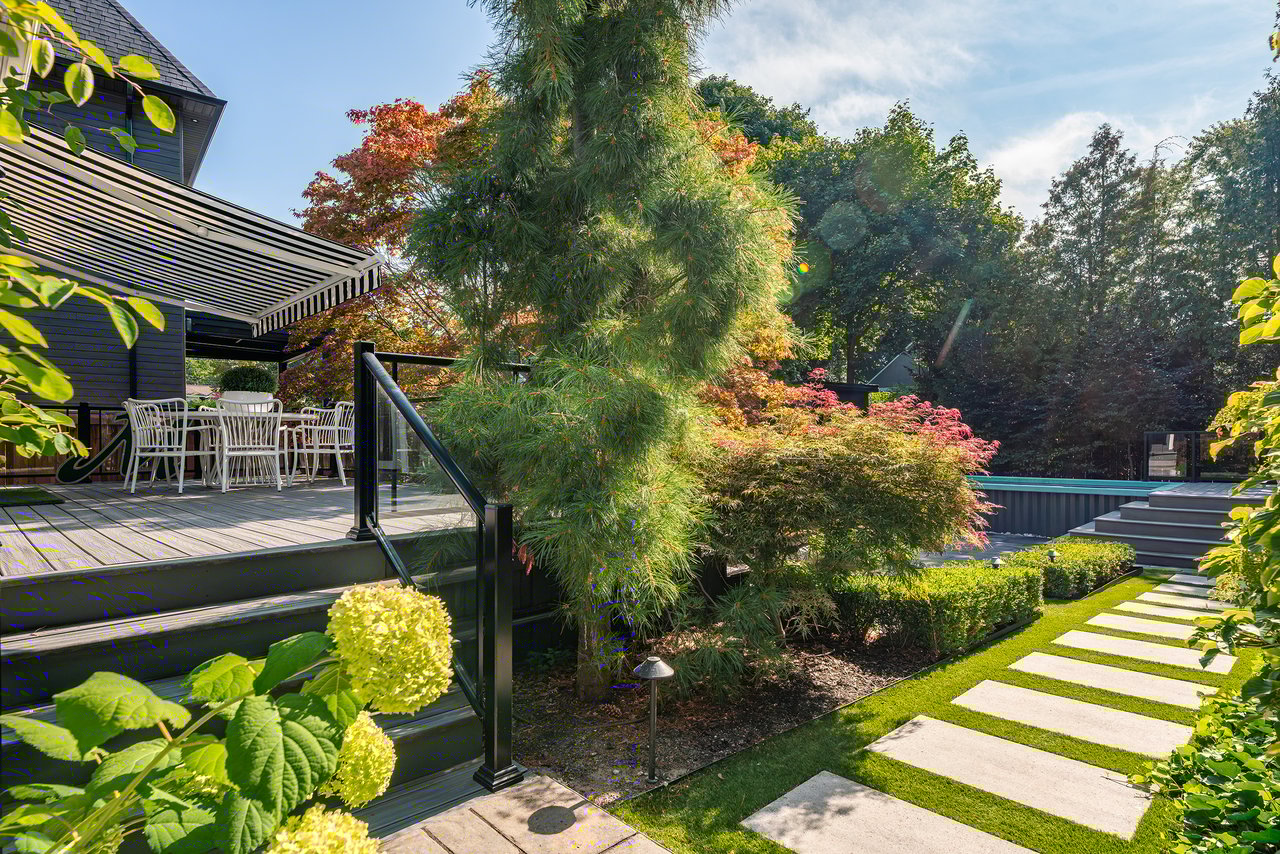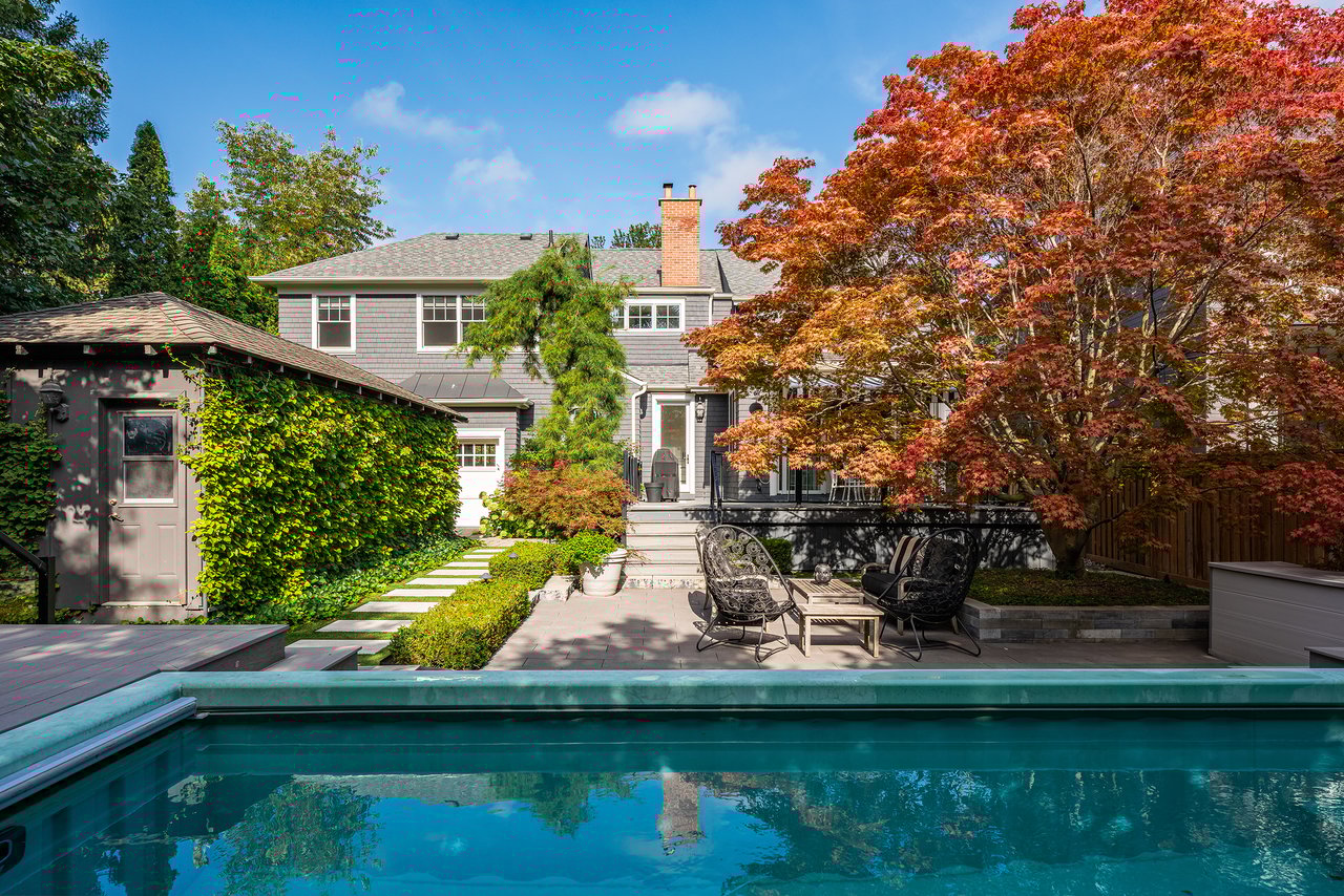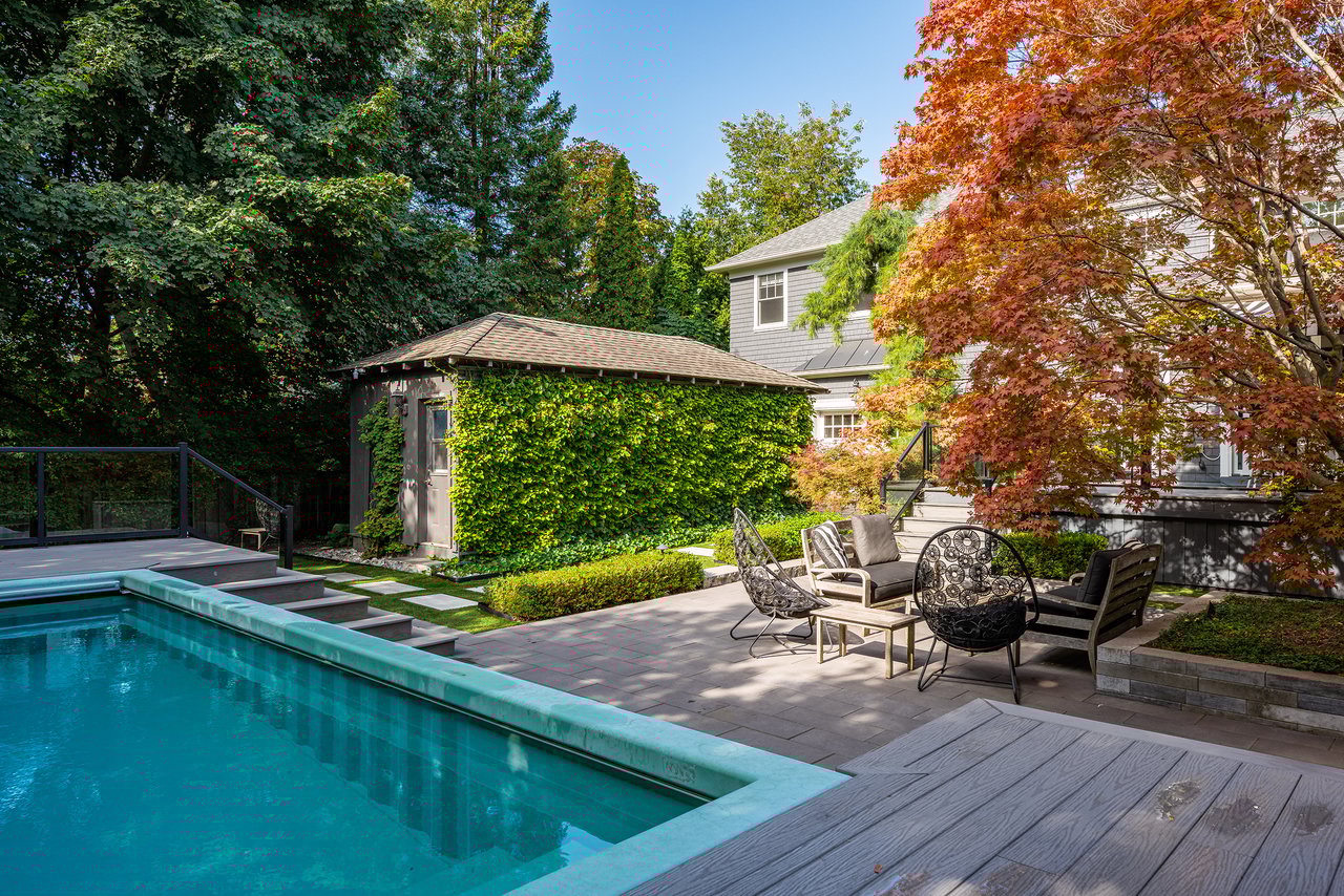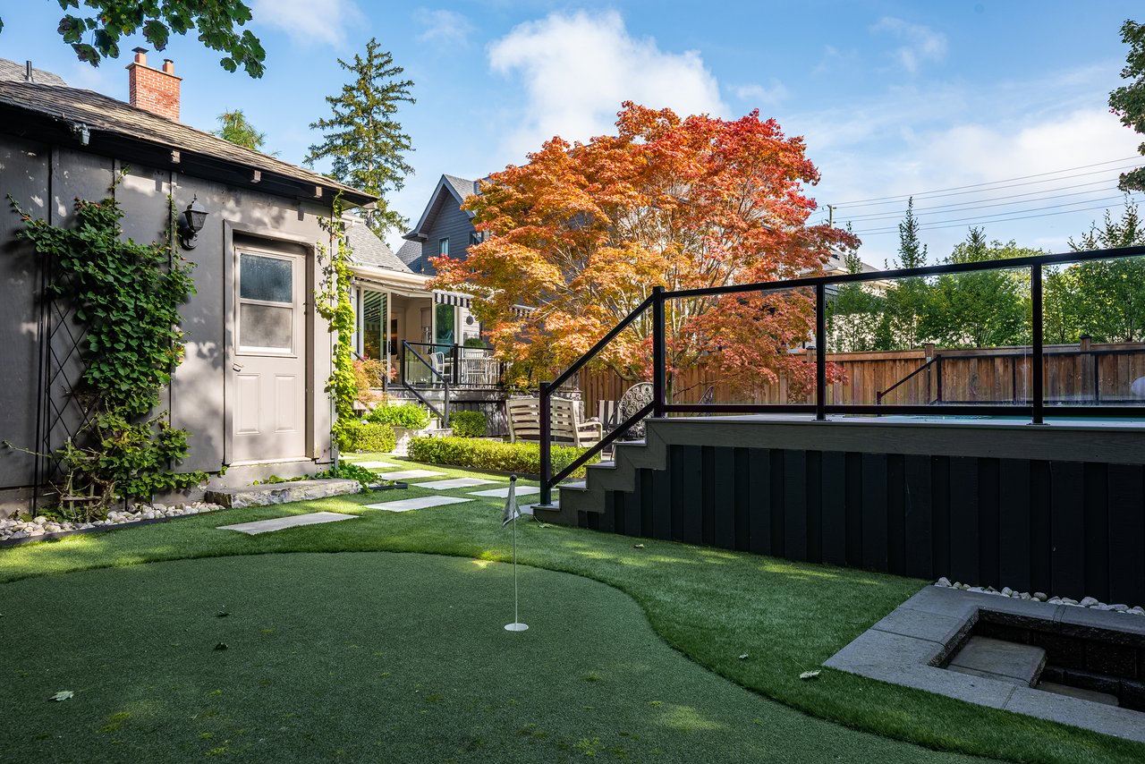 Outdoors, the home continues to impress. A double garage with high ceilings is a rarity in this area. The welcoming front porch is perhaps the epitome of Old Oakville charm, while the south facing backyard has been meticulously designed as a private retreat. A newer composite deck with glass railings overlooks a landscaped garden featuring a lap pool that doubles as a spa, a professionally installed putting green, and a stylish flex-cabin ideal as an art/yoga studio, office, or gym.