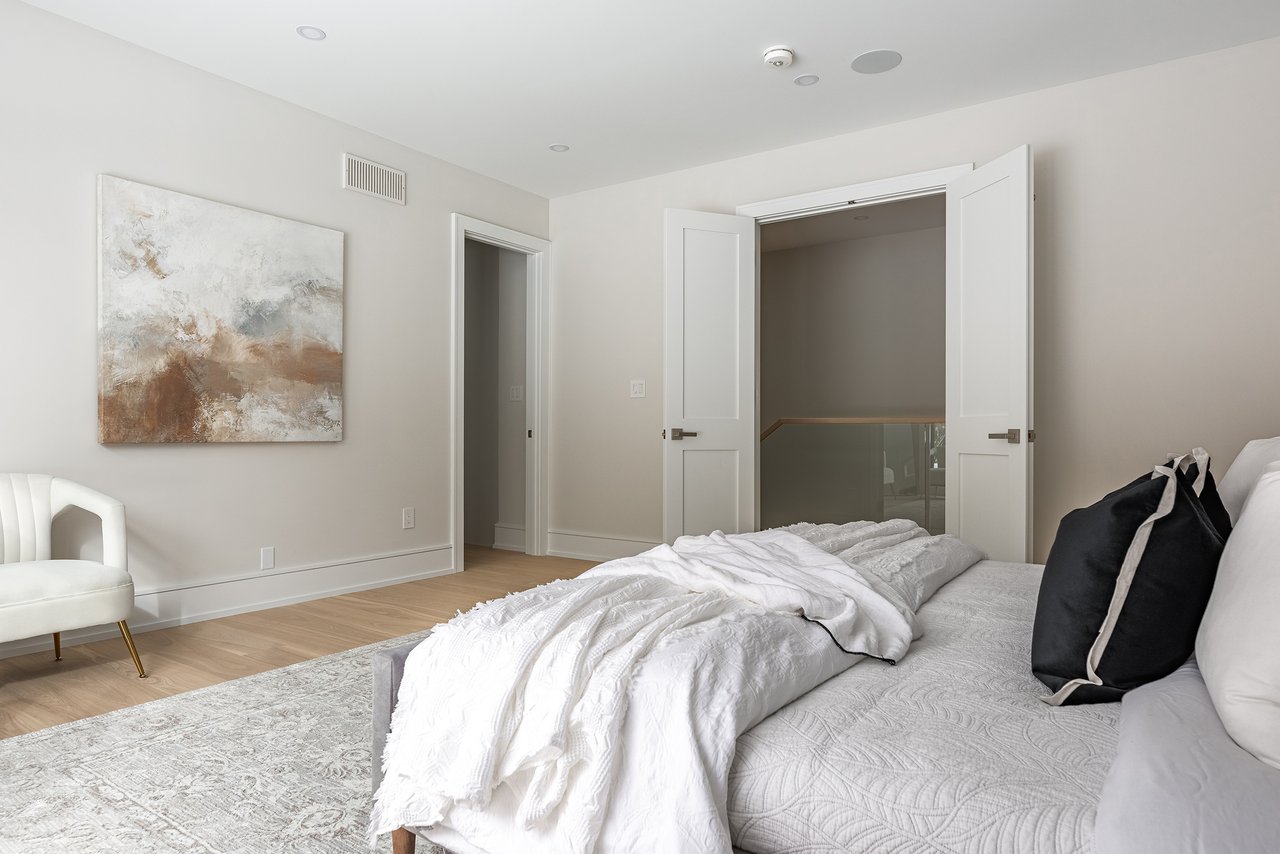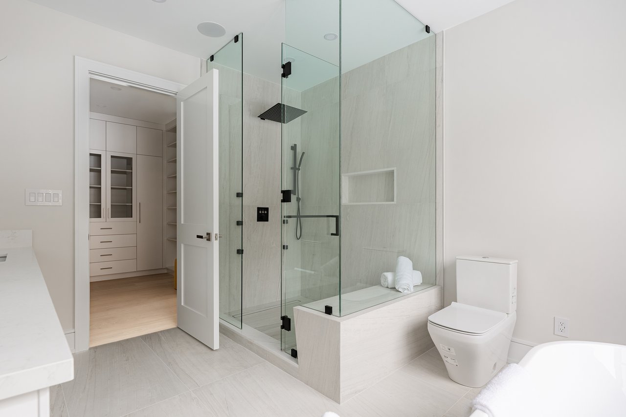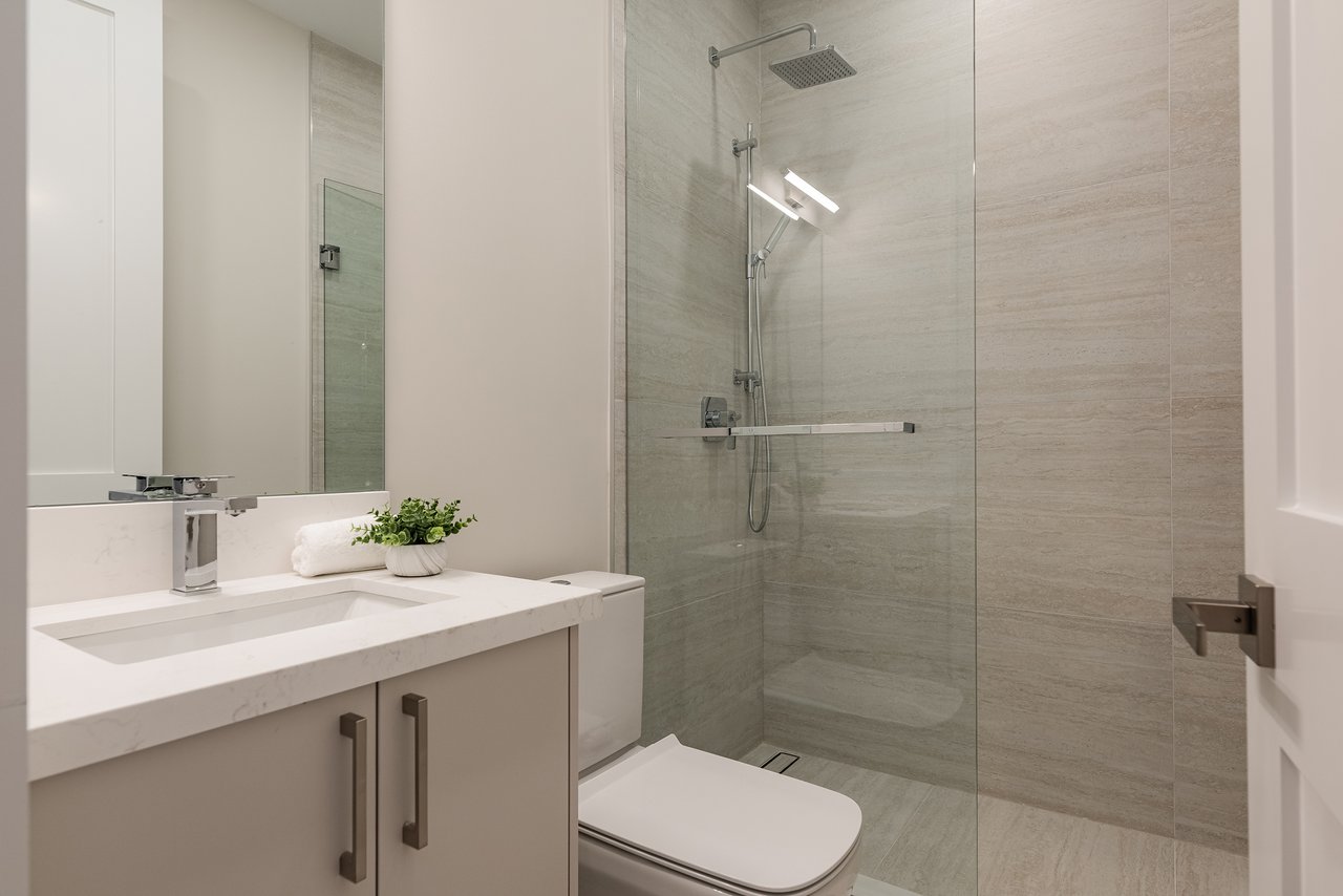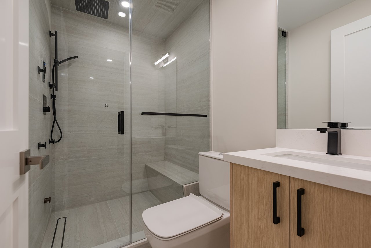 Upstairs, four spacious bedrooms each feature private ensuites. The primary suite is a serene retreat with a modern feature wall, terrace walkout, and spa-inspired bath with Mirolin soaker tub, rain and wand shower, and custom double vanity.