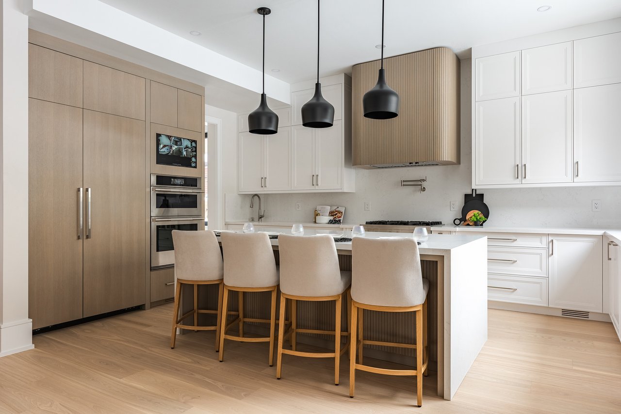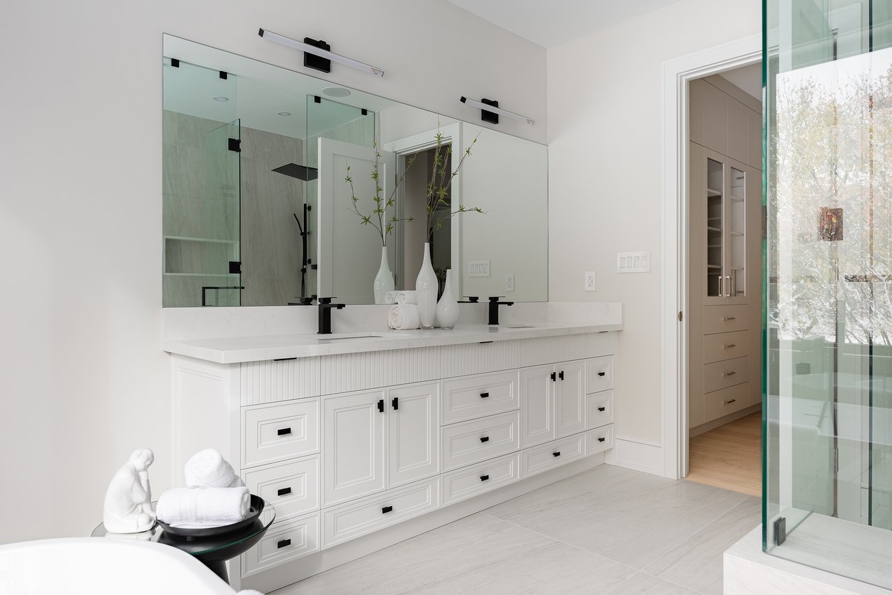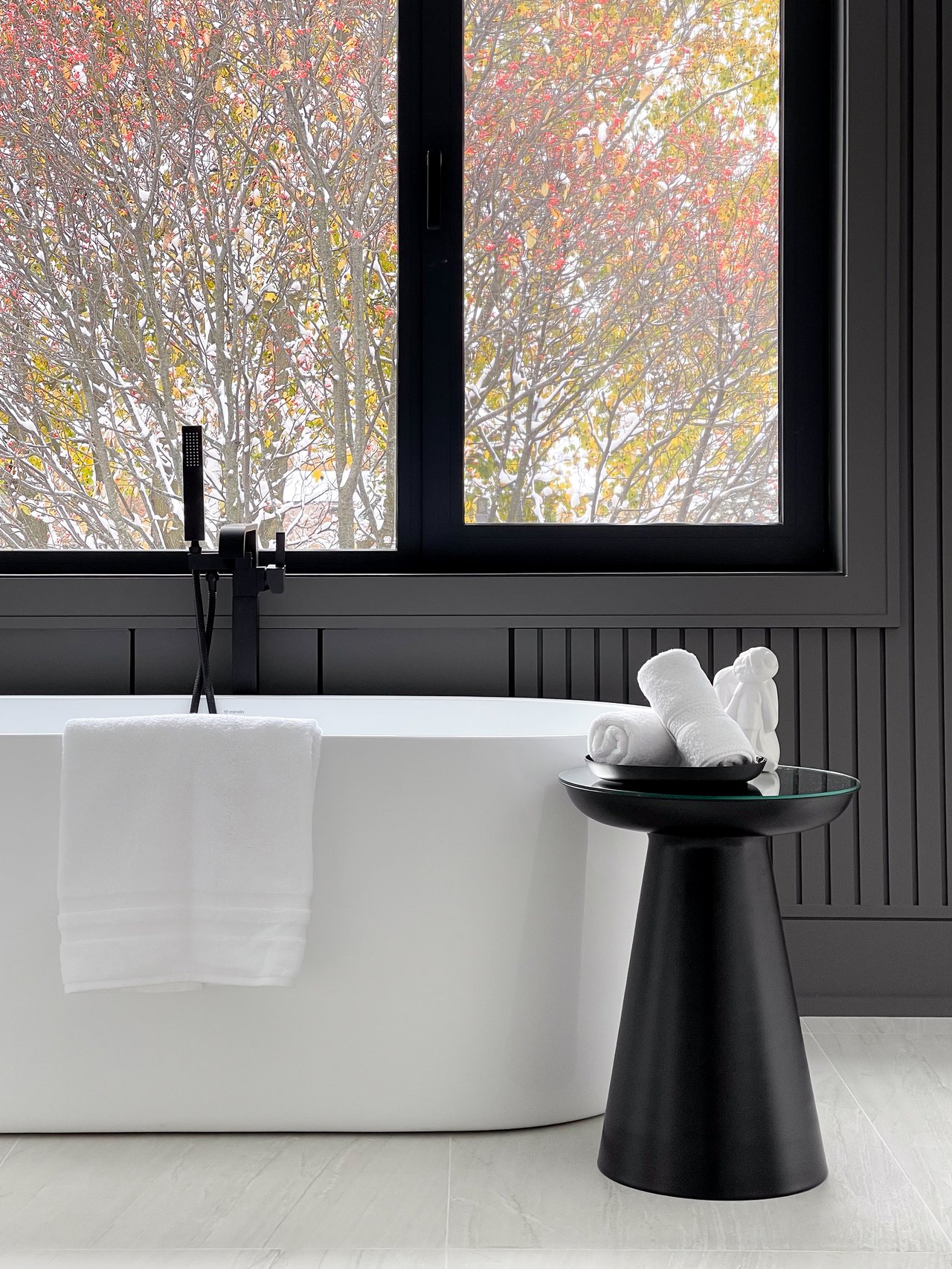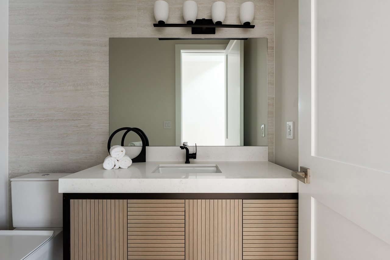 Upstairs, four spacious bedrooms each feature private ensuites. The primary suite is a serene retreat with a modern feature wall, terrace walkout, and spa-inspired bath with Mirolin soaker tub, rain and wand shower, and custom double vanity.