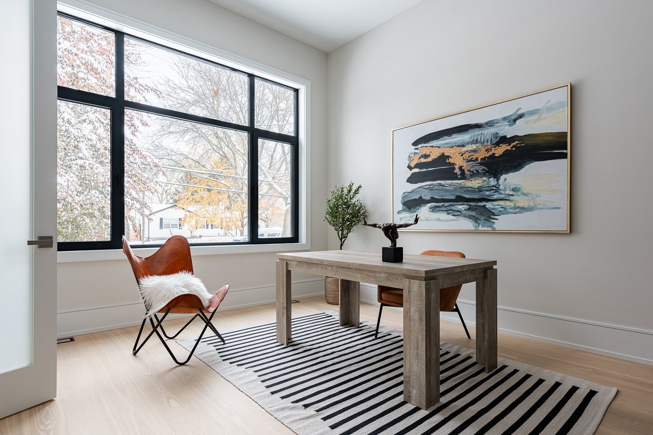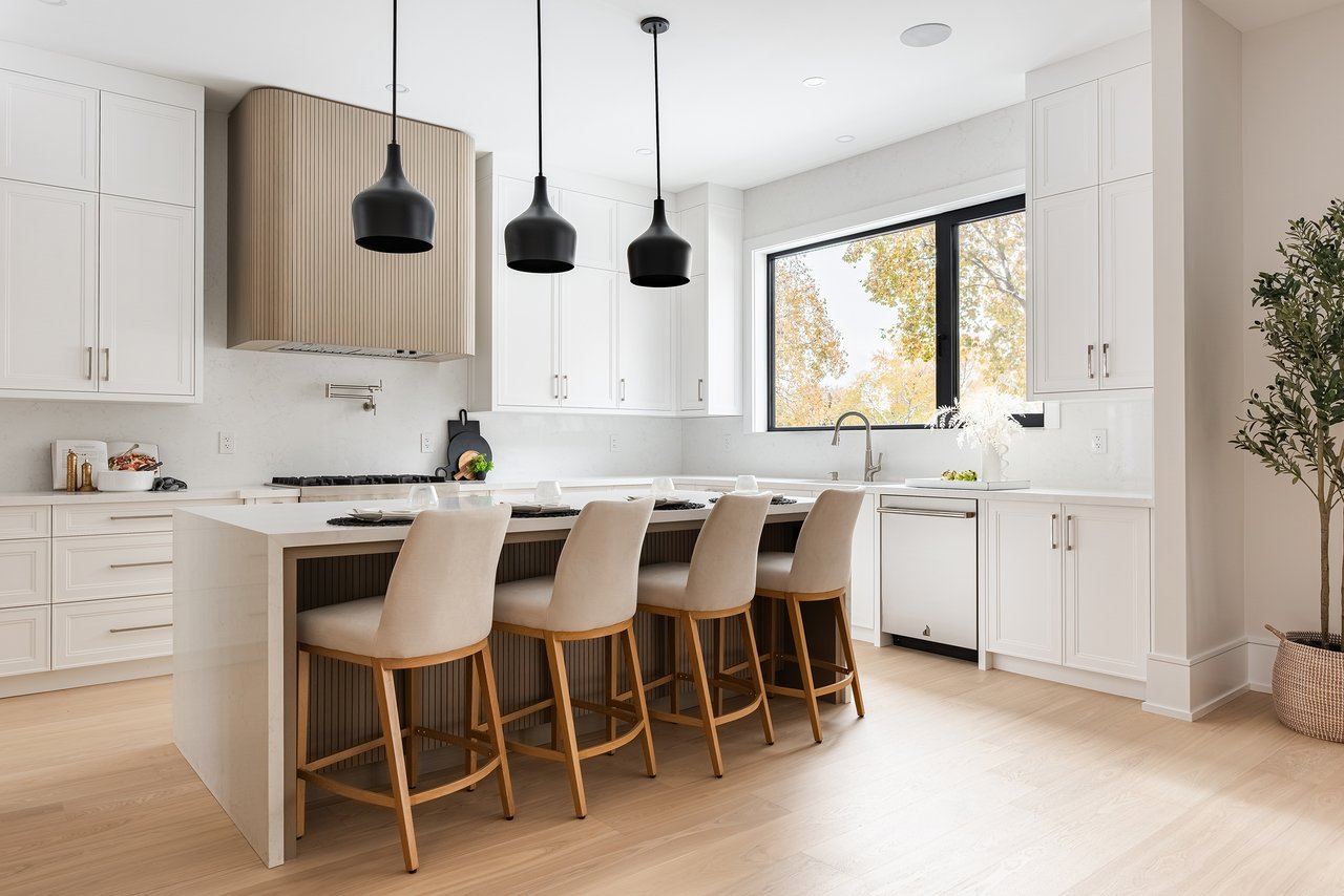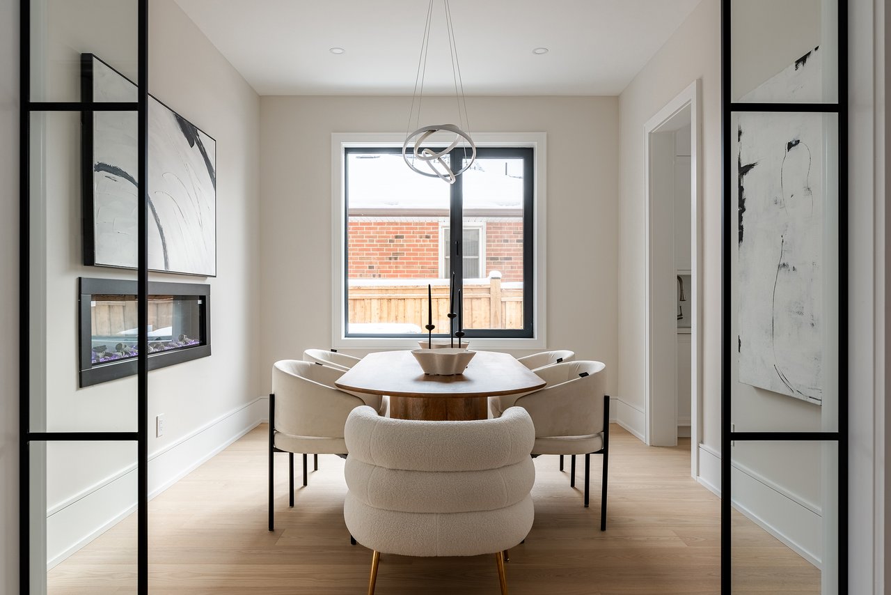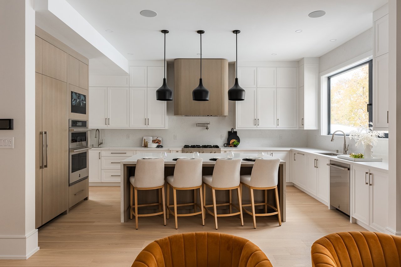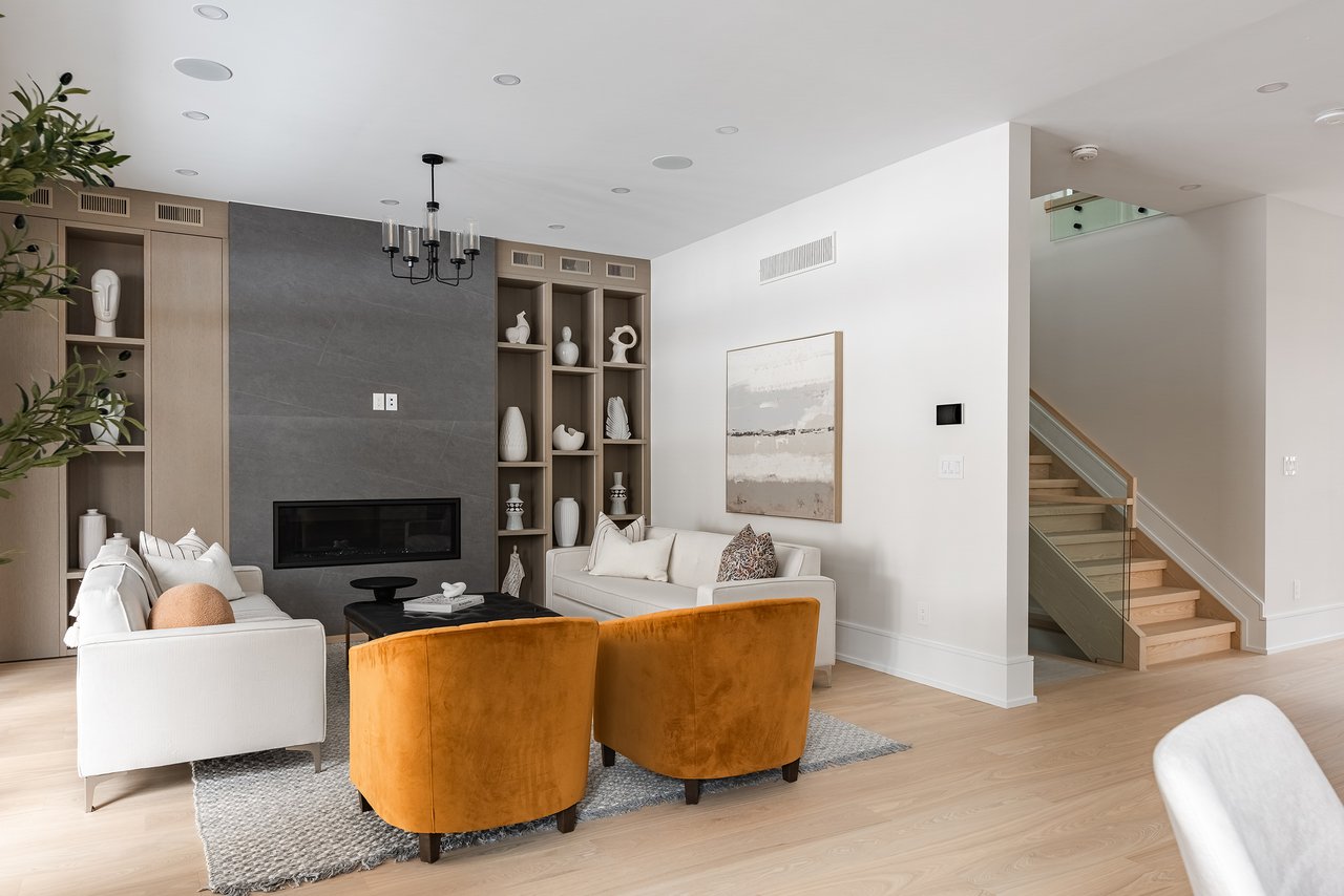 A covered entry leads into a dramatic two-storey foyer with 20-foot ceiling height, setting the tone for a home defined by light, proportion, and fine detailing. Ten-foot main-floor ceilings, 10-inch baseboards, wide-plank engineered flooring, triple pane energy star aluminum windows and integrated in-ceiling speakers bring cohesion to the open-concept design.