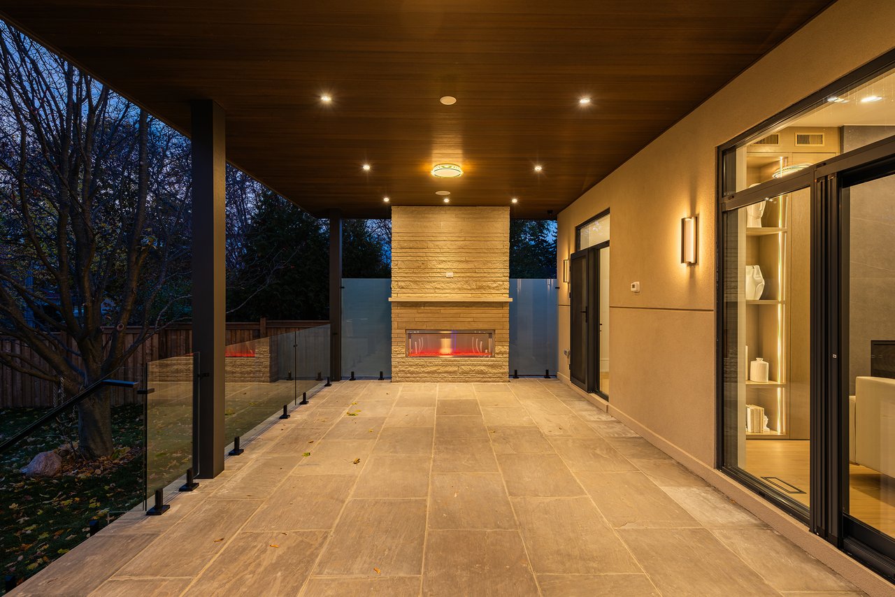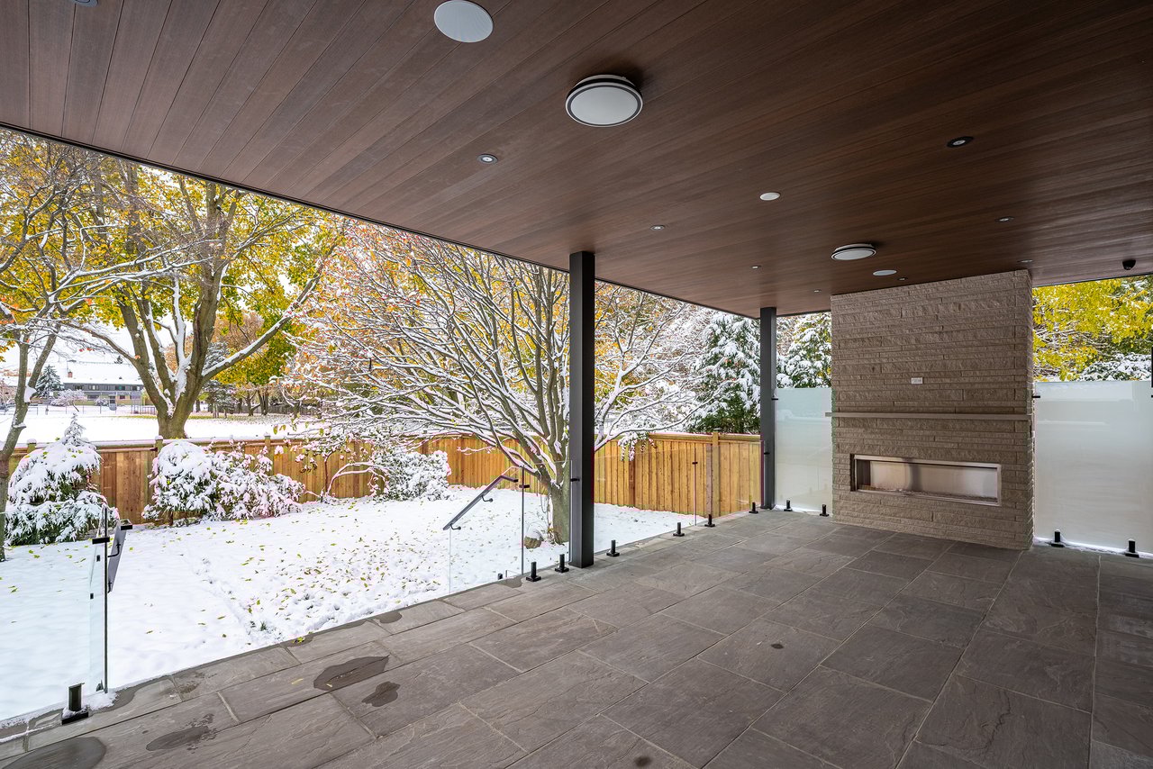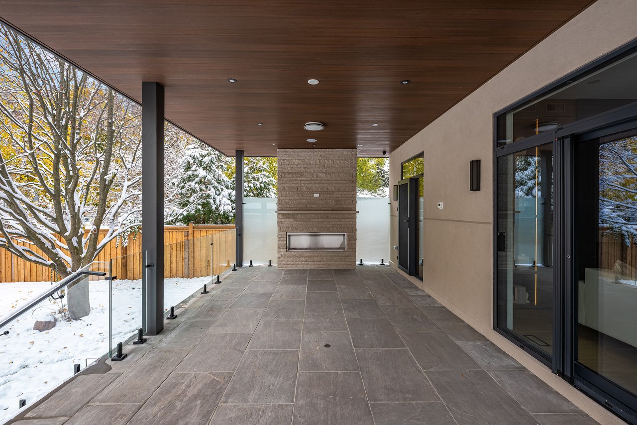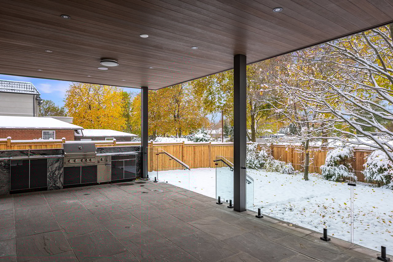 Outdoors, a covered porch with built-in BBQ overlooks the park—an inviting space for year-round entertaining.