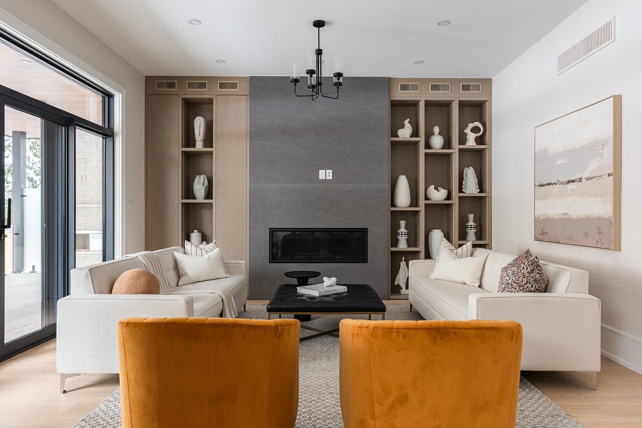 The front office, with 12-foot ceiling and two-sided fireplace, provides a peaceful space for work or study. Beyond, the great room’s porcelain-wrapped fireplace anchors the living area, framed by custom built-ins and large windows overlooking the rear yard. The adjacent chef’s kitchen features a full JennAir appliance package, dual sinks, and a waterfall quartz island—an effortless gathering place for family or guests.