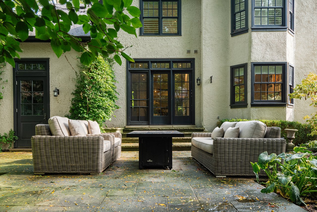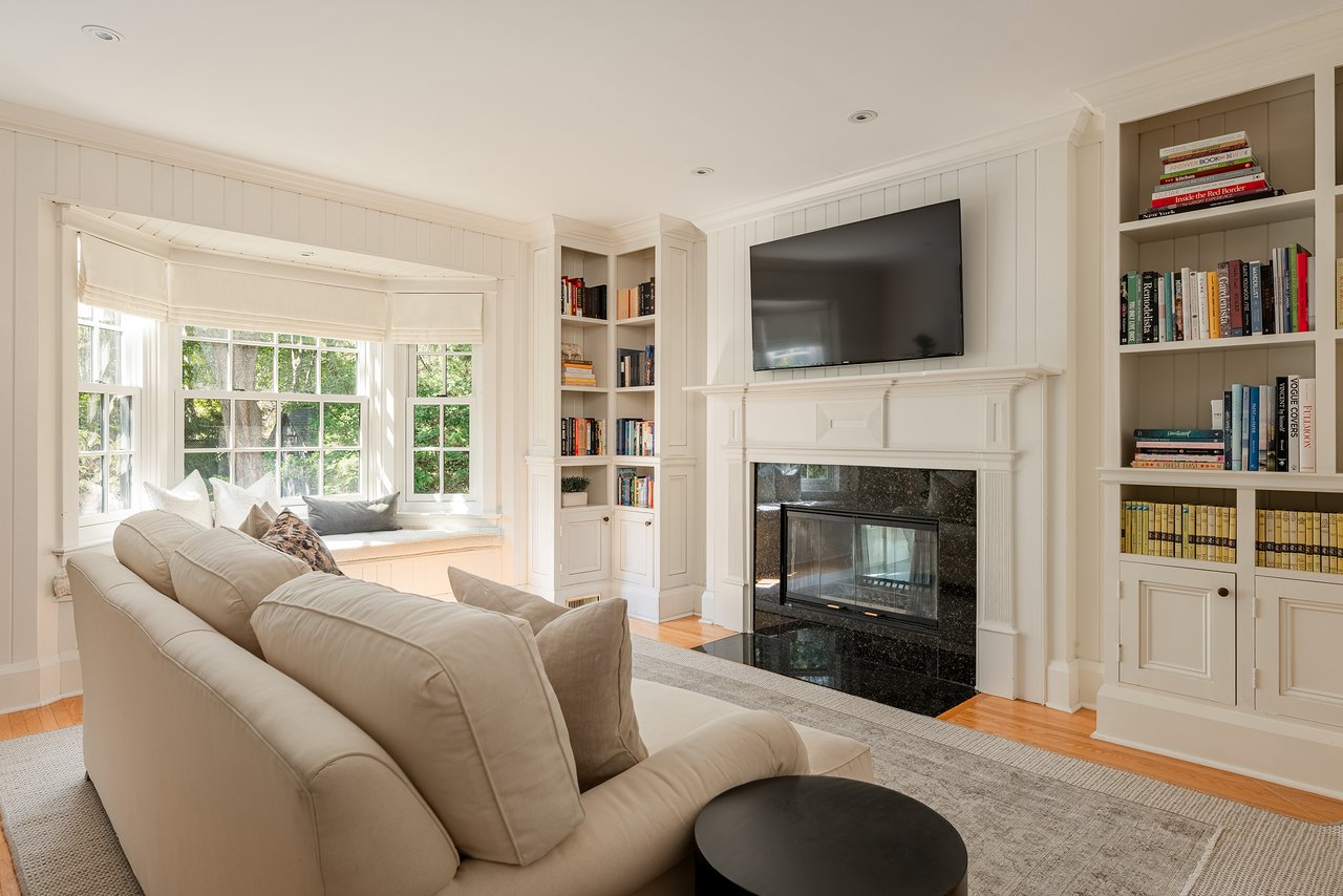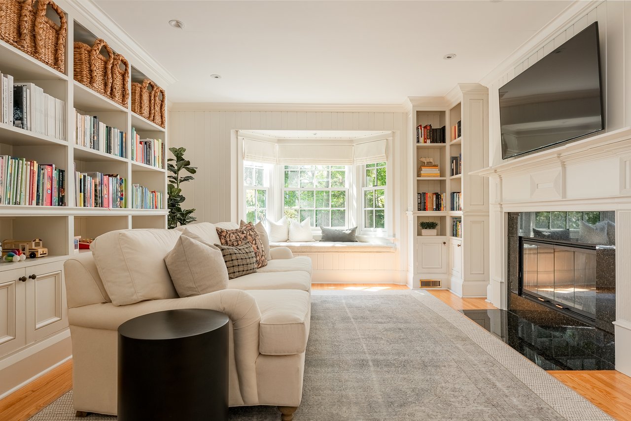 Inside, thoughtful details abound including a well-appointed kitchen with a large breakfast lounge, a formal dining room and a contemporary family room with built-ins with French doors to the backyard. A front living room with a gas fireplace adds an elegant balance between formal and casual living.