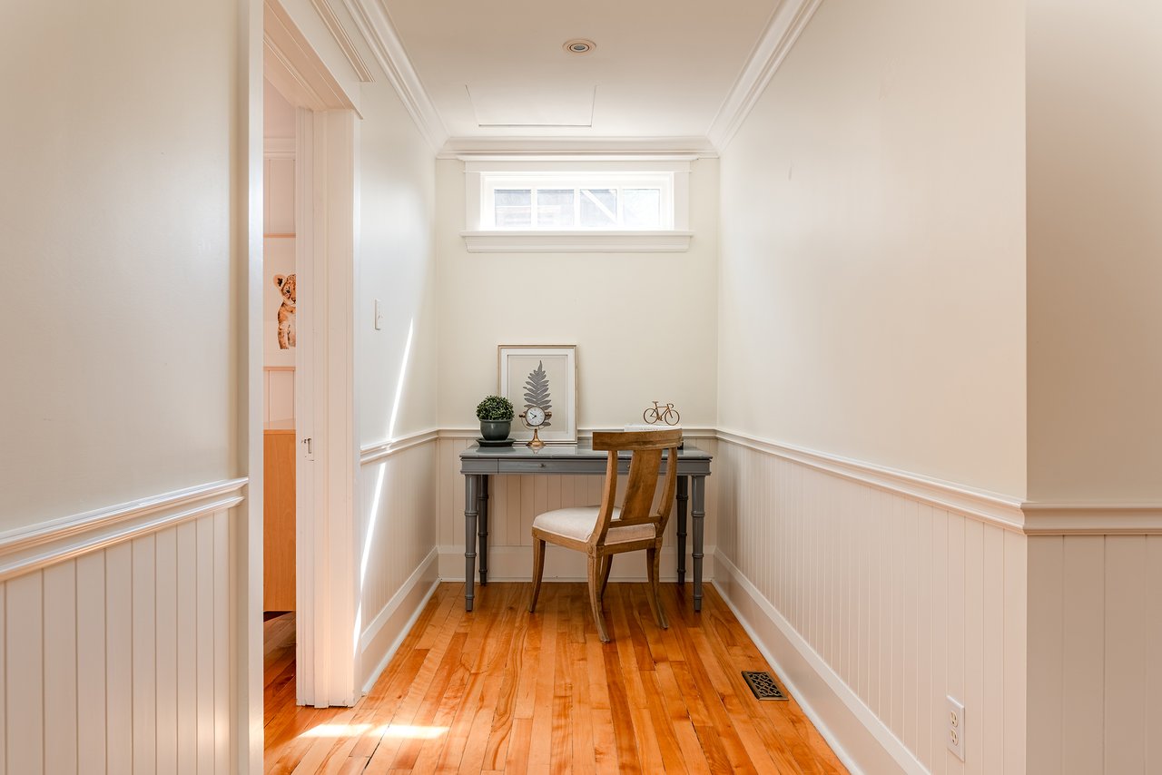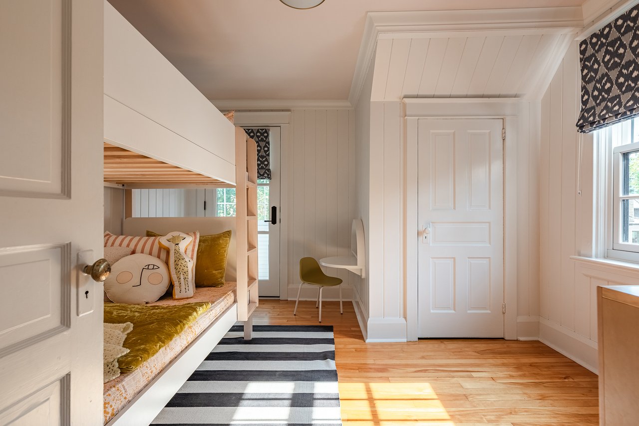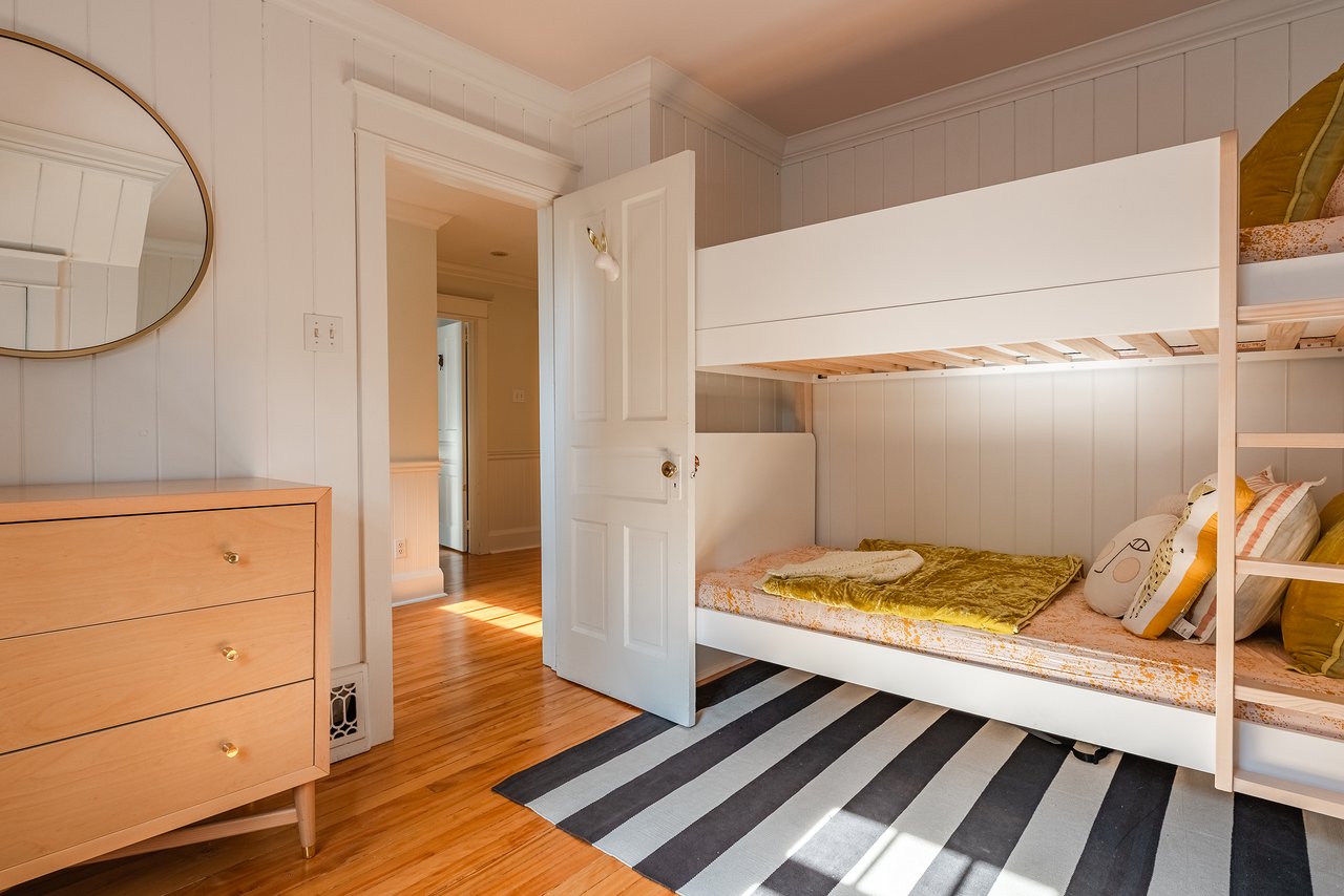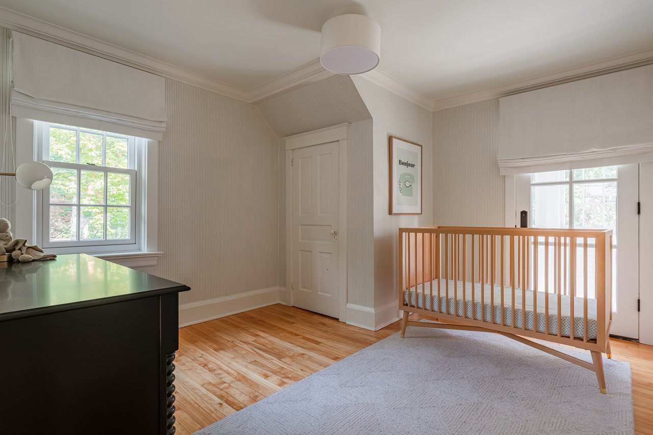 Upstairs, the primary suite stands out with an unusually generous footprint for a home of this era, featuring a walk-in dressing room and an expansive ensuite with soaker tub. Two equally sized bedrooms share a spacious children’s bath, designed to keep up with the busiest of mornings.