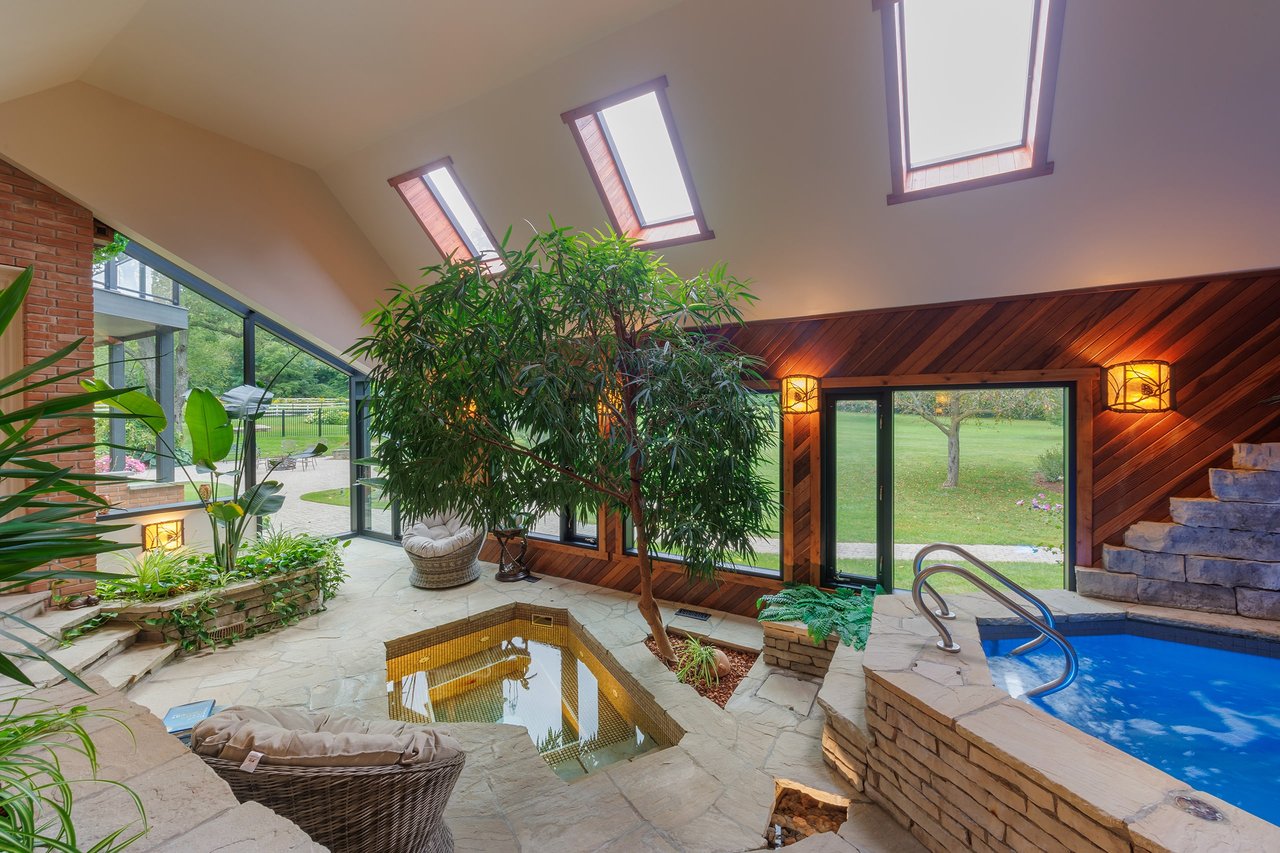 The gourmet kitchen is a chef’s delight with an abundance of custom stained solid cherry wood cabinetry with book-matched quartzite counters and backsplash, commercial grade appliances and a solarium-style breakfast area. Seamless transition to the family room with central stone wood burning fireplace and direct access to a rear courtyard. Enjoy a bit of the tropics with private atrium complete with lush tropical vegetation, cedar sauna, spa, cold plunge pool and stream – a breathtaking escape.