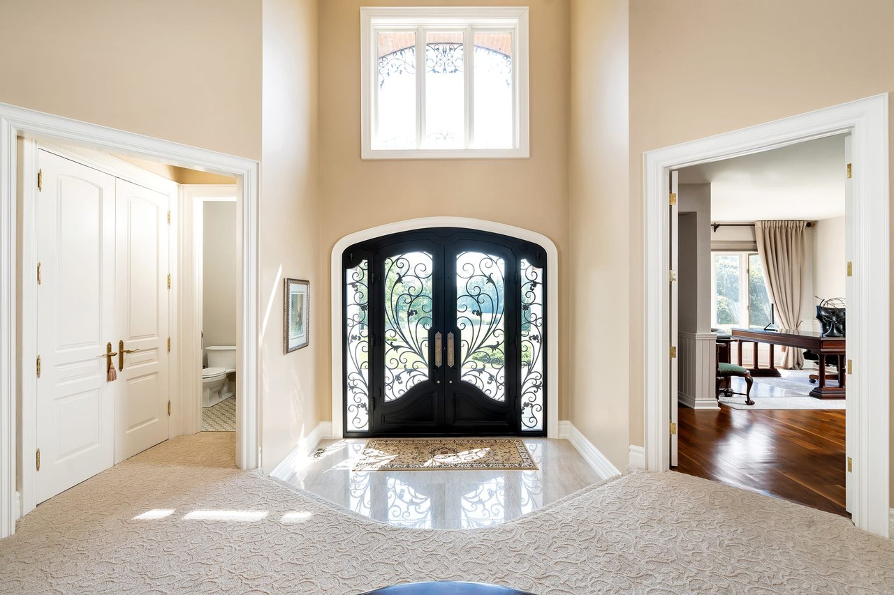 Down a private half a Km long drive that purposely wraps around a manicured spring-fed pond, this exquisite French chateau inspired estate with nearly 14,000 sqft of living space is set back + overlooks the pond to perfectly capture the manor’s beauty + reflections at dusk. From almost every window in the home, enjoy the infinite picturesque views within the nearly 14-acre grounds with wildlife commonly seen. Stadium-type lighting illuminates the pond at night for large-mouth Bass fishing in the summer and skating in the winter or any other recreational activities of your choosing. The breathtaking natural surroundings of dense forest with hidden trails are waiting to be explored, along with access to 100 conservation acres of walking and biking trails accessed from your backyard.