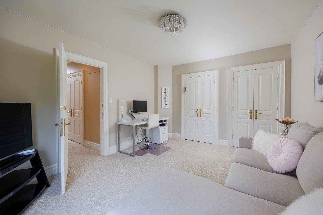 The primary retreat is tucked away and features rear terrace overlooking the immaculate grounds and forest, 3-sided fireplace, custom dressing room and spa bath. Three additional bedrooms are generously sized, one enjoys an ensuite and two share ensuite privileges. A finished attic space provides a great flex space and a separate, self-contained and fully equipped guest suite provides two levels of living space.
