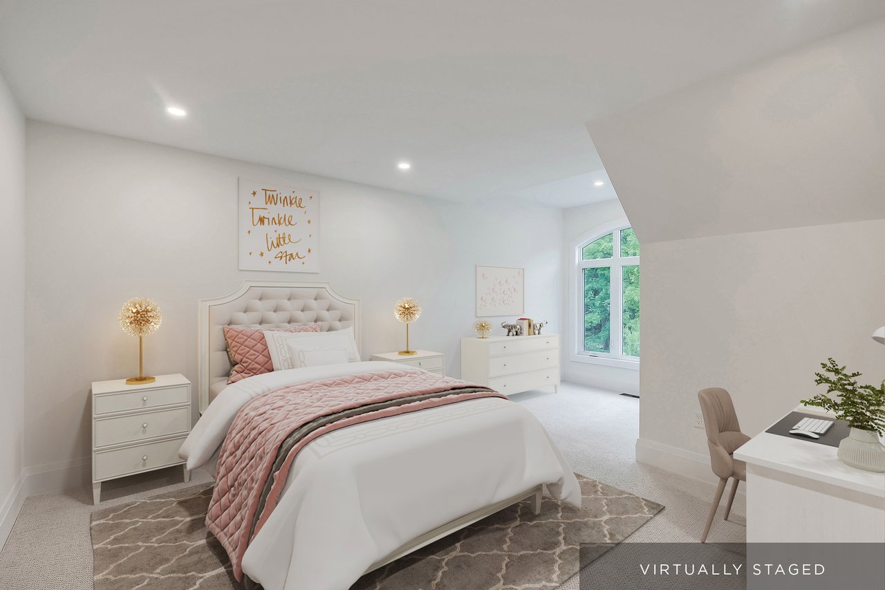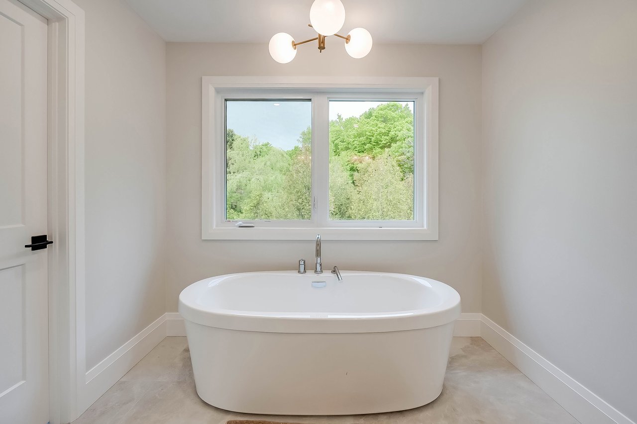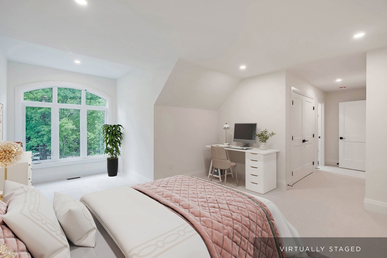 With double door entry, impressive vaulted ceiling + expansive glazing, the primary bedroom is bright + spacious. With a generous walk-in closet and luxurious ensuite with a deep soaker tub, oversized glass shower + water closet, this is a serene place to unwind after a long day. Two additional bedrooms are generously sized with ample storage, extensive glazing + each enjoy private ensuites. Convenient laundry rounds out this level. The lower level offers a finished space with fourth bedroom with walk-in + luxurious ensuite. The remainder is unspoiled with ample windows, additional 2-piece rough-in + high ceilings.