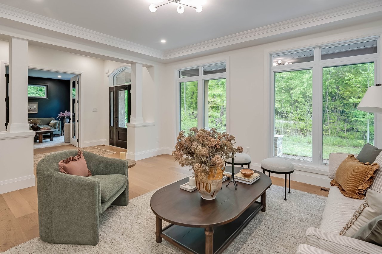 Clever floor plan offers connected principal living spaces, yet offers privacy when desired. The hub of the home is the centre point with a meticulously crafted Barzotti kitchen that will appease the chef in the family + a walk-in pantry with ample cabinetry keeping you organized. Connected to the informal dining + family room with cathedral vaulted ceiling, the hub of the home impresses with full-wall glazing + beautiful lush treed views. The mudroom is highly functional with built-ins + interior access to the triple garage. And a well-placed three-piece bath + coat closet offer great utility.