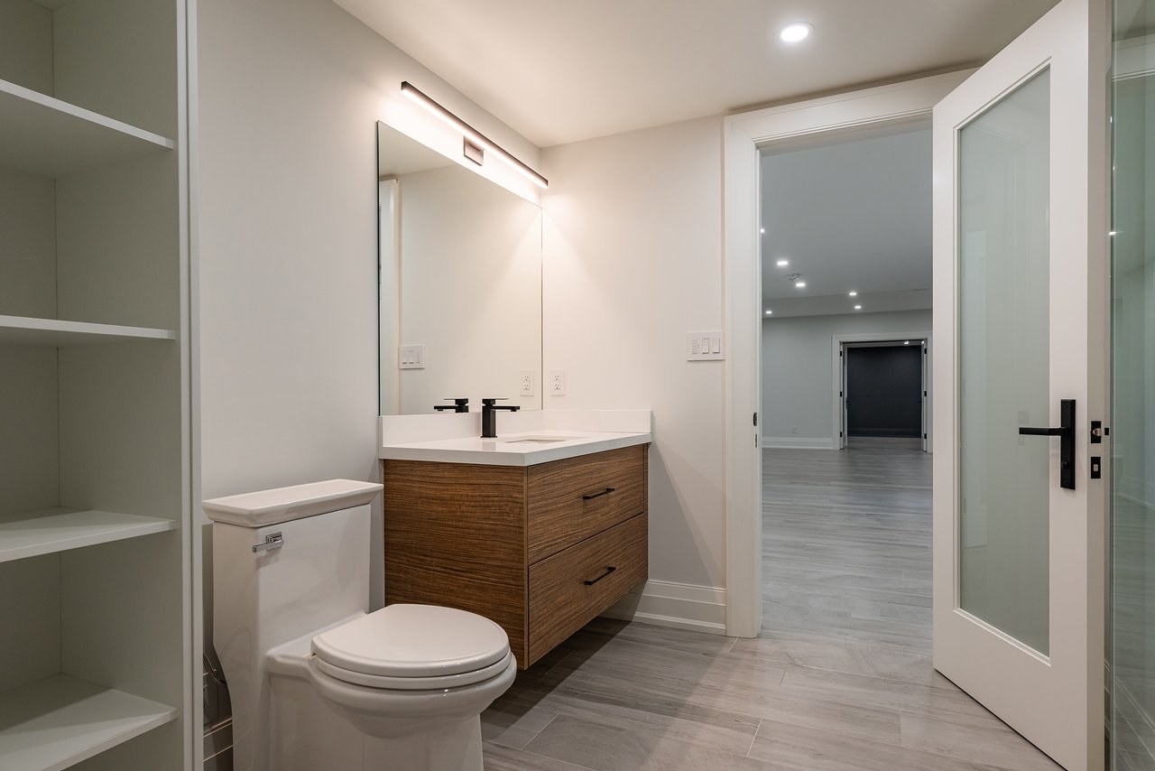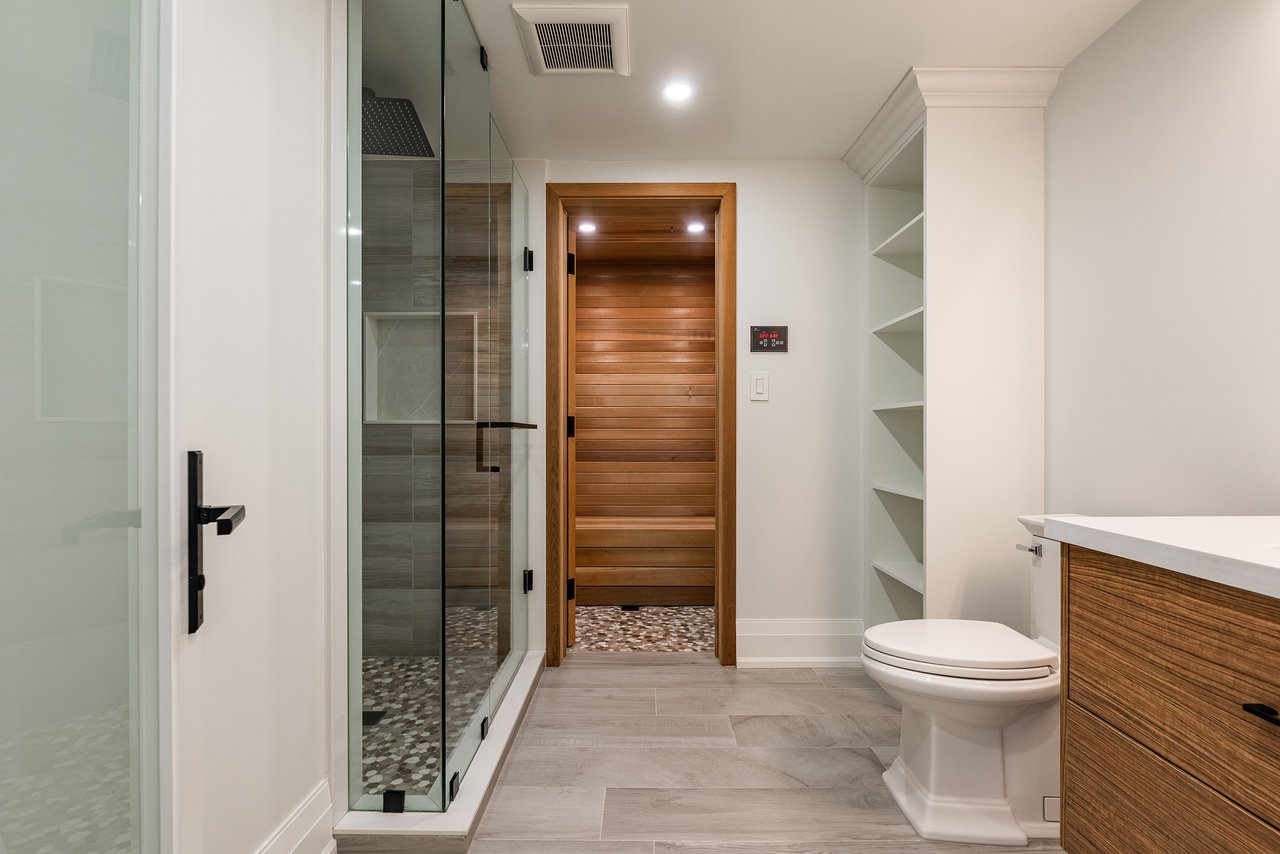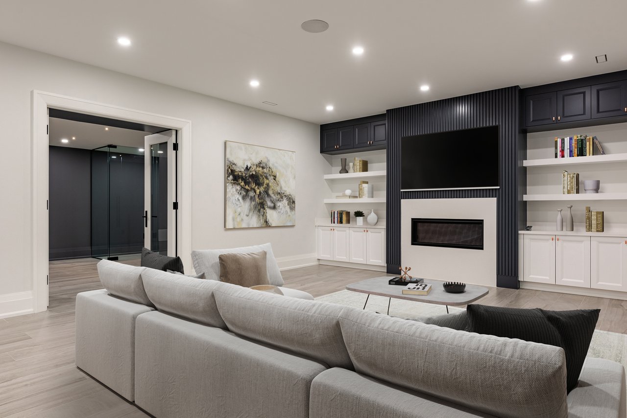 The lower level is equally impressive, offering radiant in-floor heating, two additional bedrooms, a three-piece bath with sauna, a gym, and a theatre room located beneath the back porch. The recreation area includes a fireplace, wet bar/kitchen potential, and a wide walk-up that draws in natural light and creates an excellent space for extended family or guests.