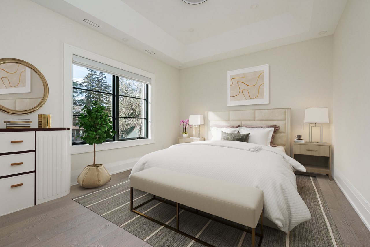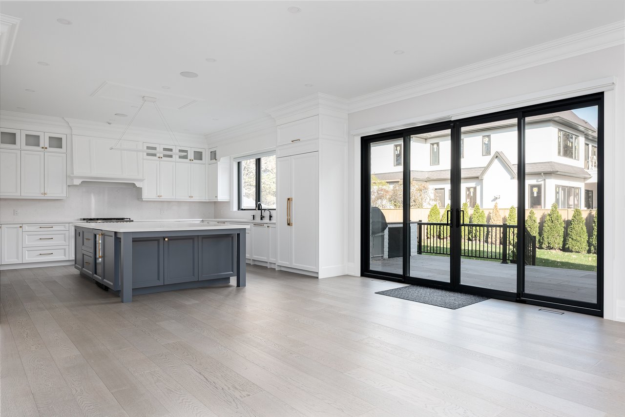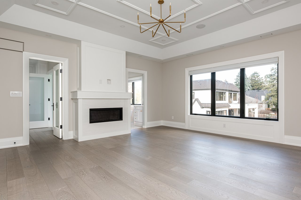 The kitchen is beautifully appointed with extensive custom cabinetry, quartz countertops, a large central island, and premium finishes. Open to the breakfast area and family room, it becomes the heart of everyday life and ideal for entertaining. The family room features a sleek linear fireplace, large windows, and seamless flow to the backyard. A well-designed mudroom connects to both the garage and the kitchen servery, with heated floors and abundant built-in storage.