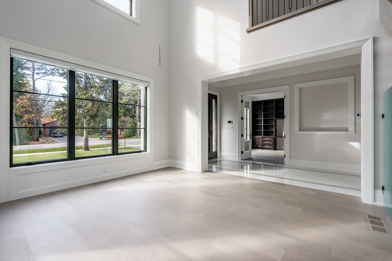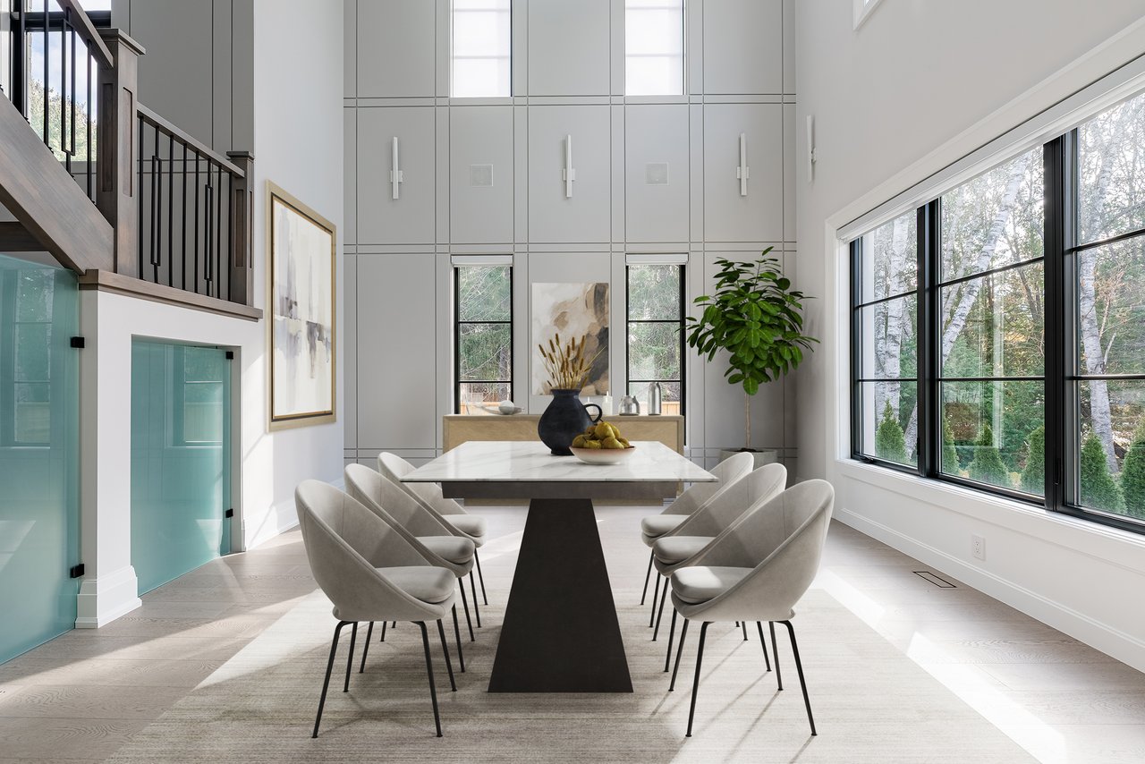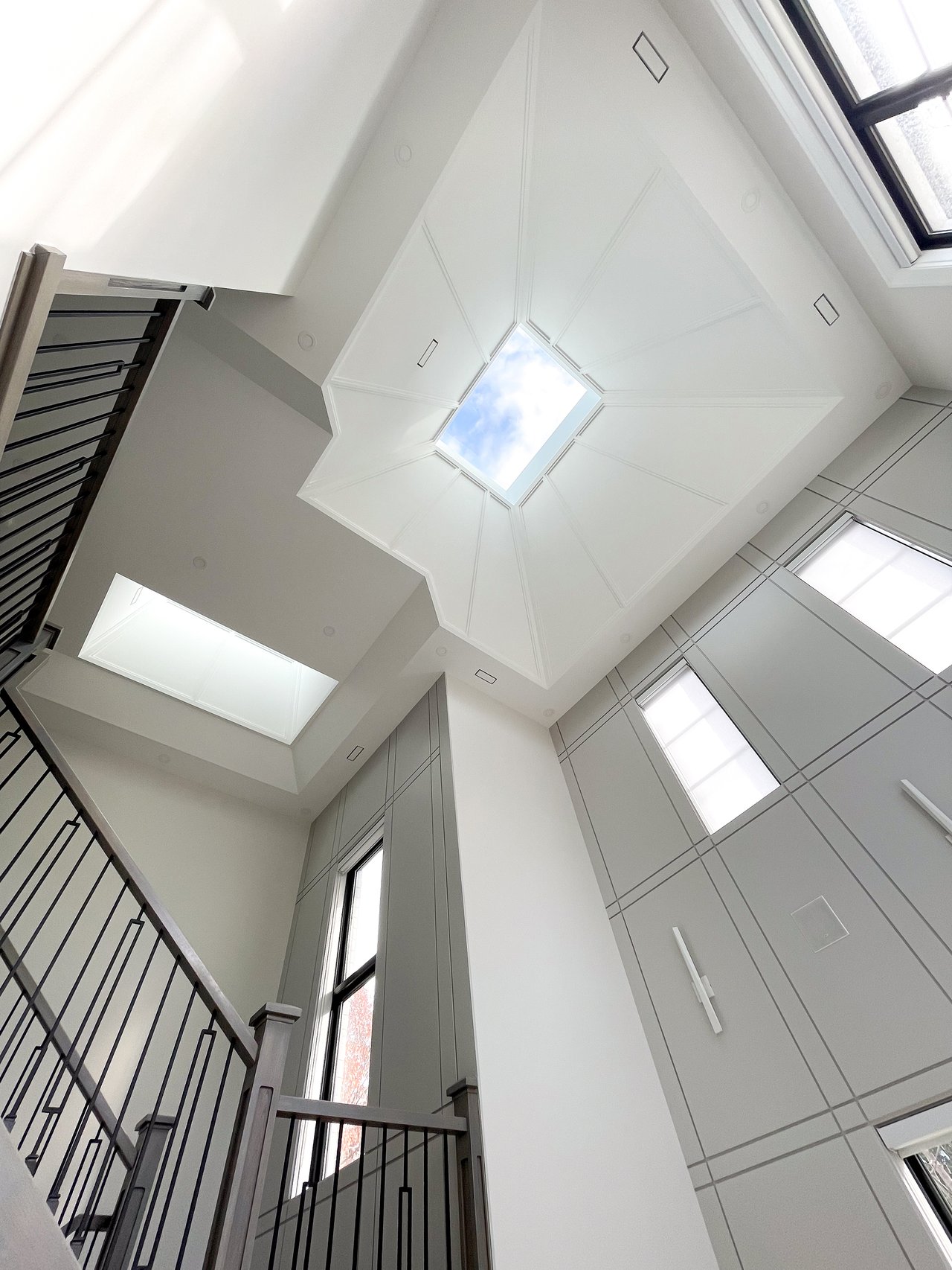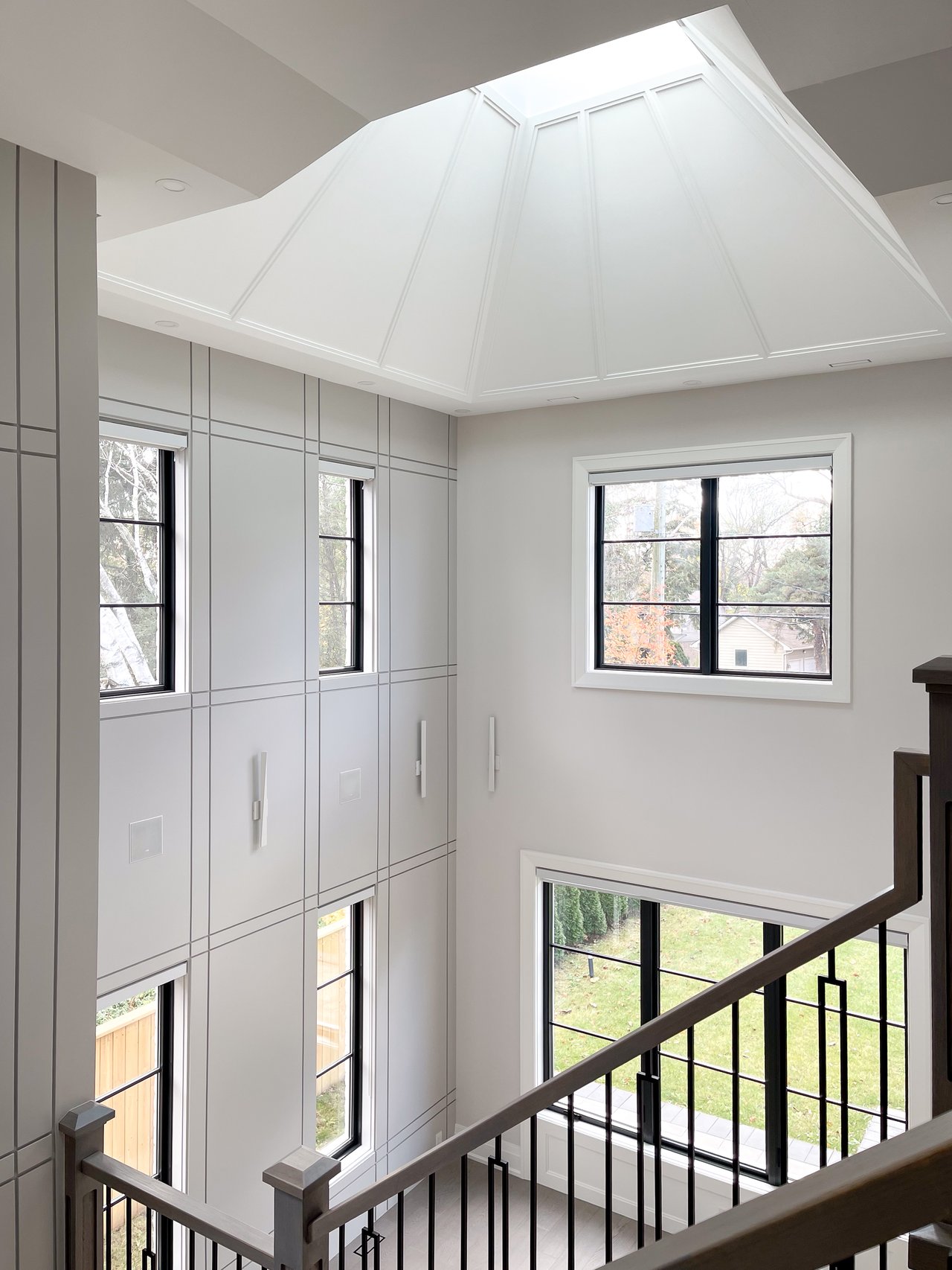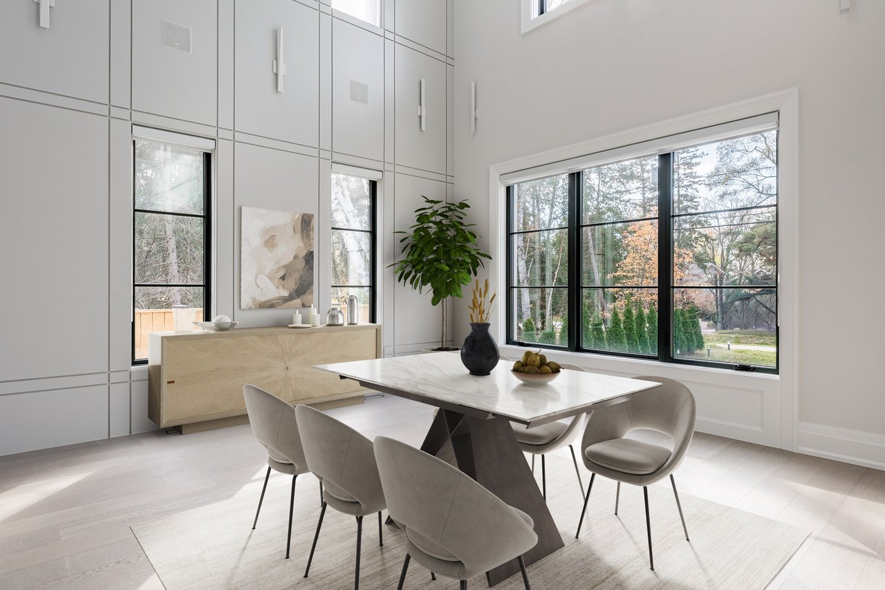 The foyer introduces the level of craftsmanship found throughout: heated marble tile flooring, plaster crown mouldings, poplar baseboards, and clean sightlines that draw natural light from multiple directions. Off the foyer, a bright office and a dramatic dining room establish the home’s architectural character. The dining room is a standout feature with its full-height custom panelling, elegant sconces, integrated speakers, and an impressive skylight that brings sunlight through both levels.